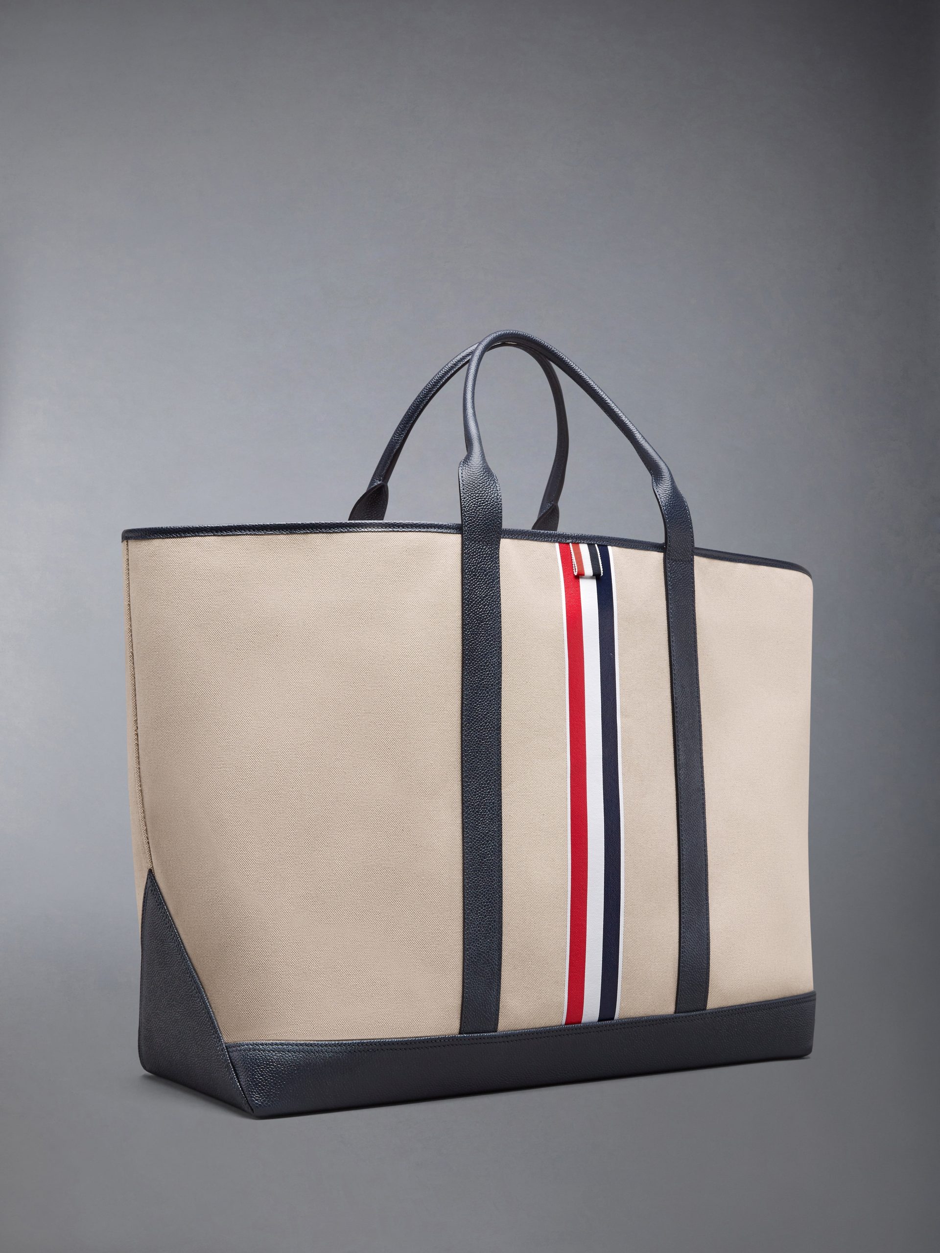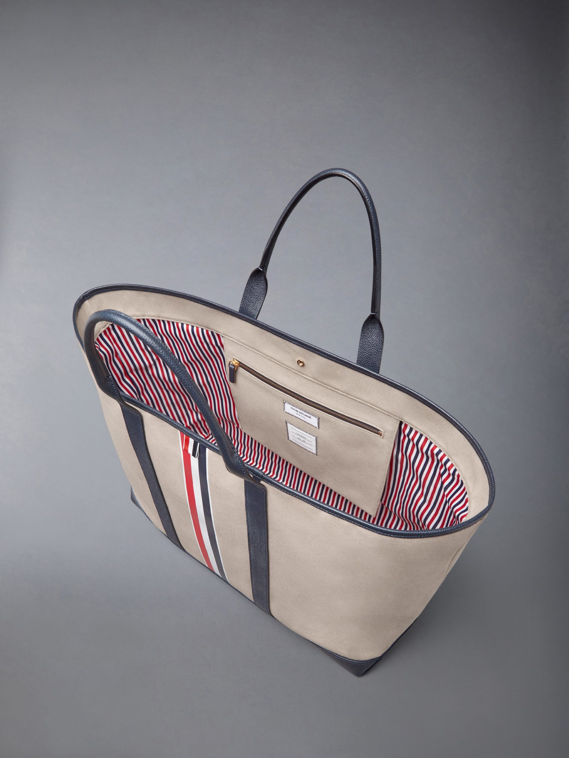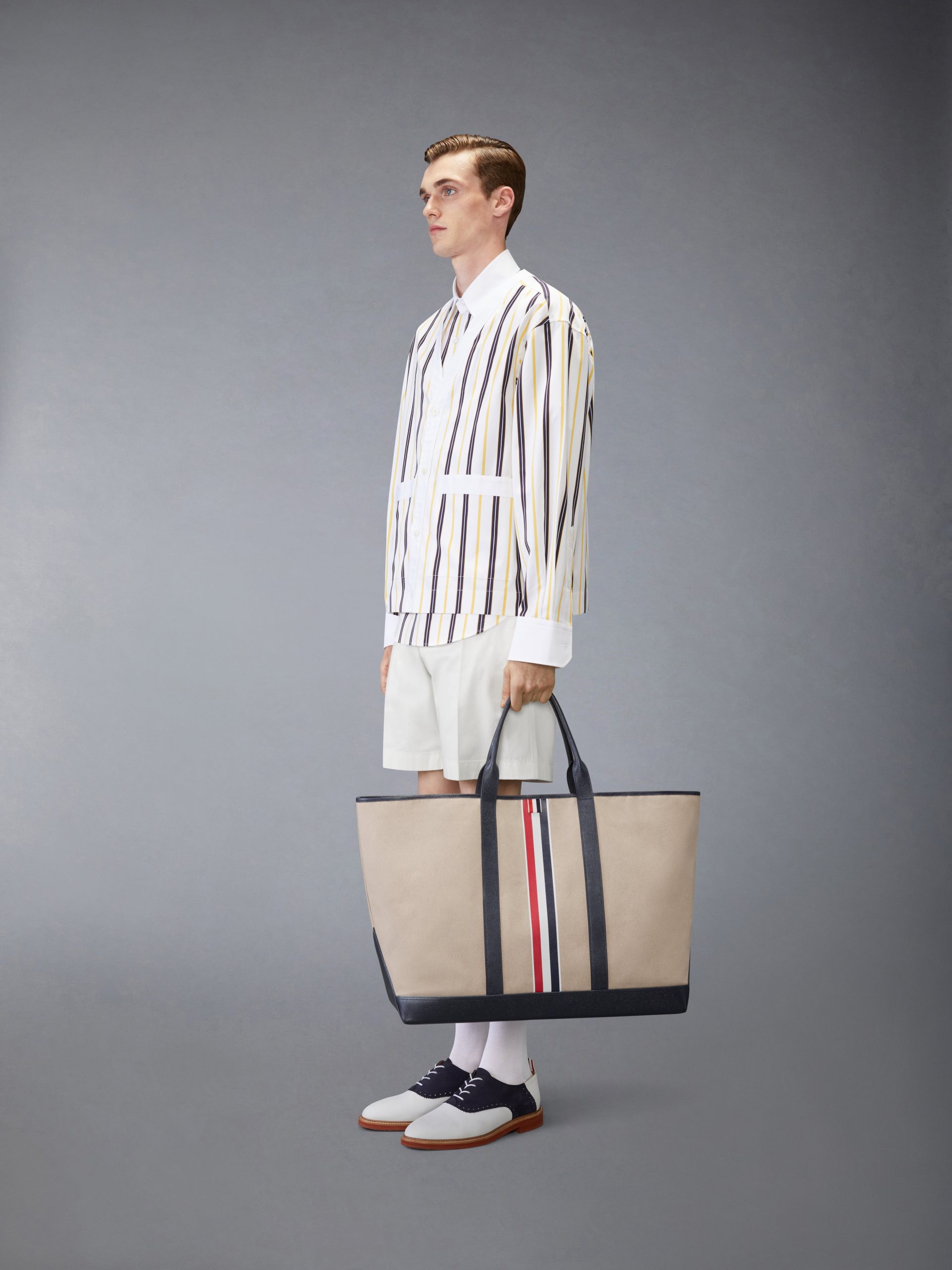 Rooted in traditional tool bags. this oversized tote translates practicality through a Thom Browne lens. Crafted in salt-and-pepper cotton canvas with a leather base and bold RWB stripes. it balances rugged materiality with graphic precision. Pair it with the Nubuck Rubber Sole Saddle Shoe to channel the season’s play on sport and structure.