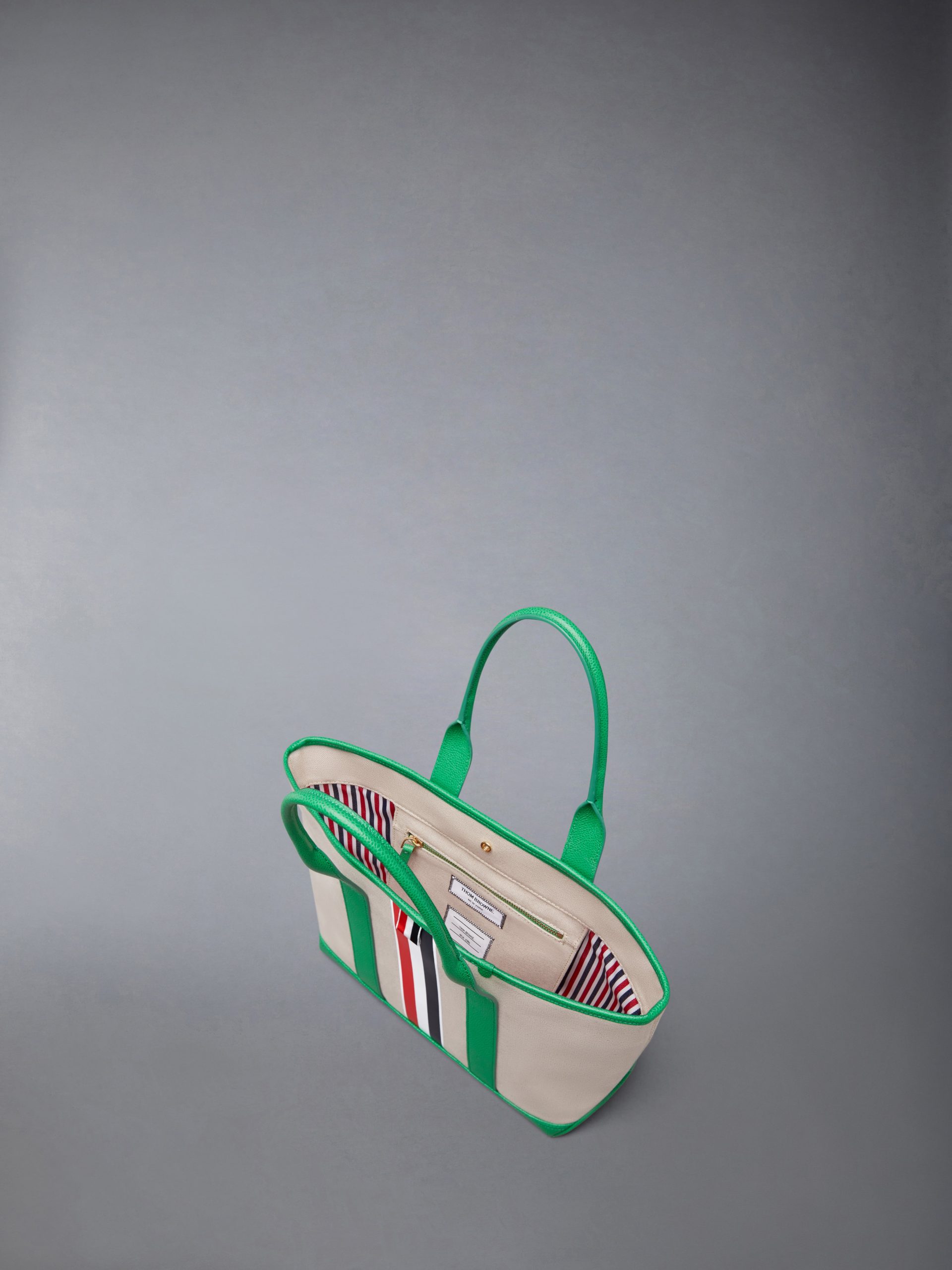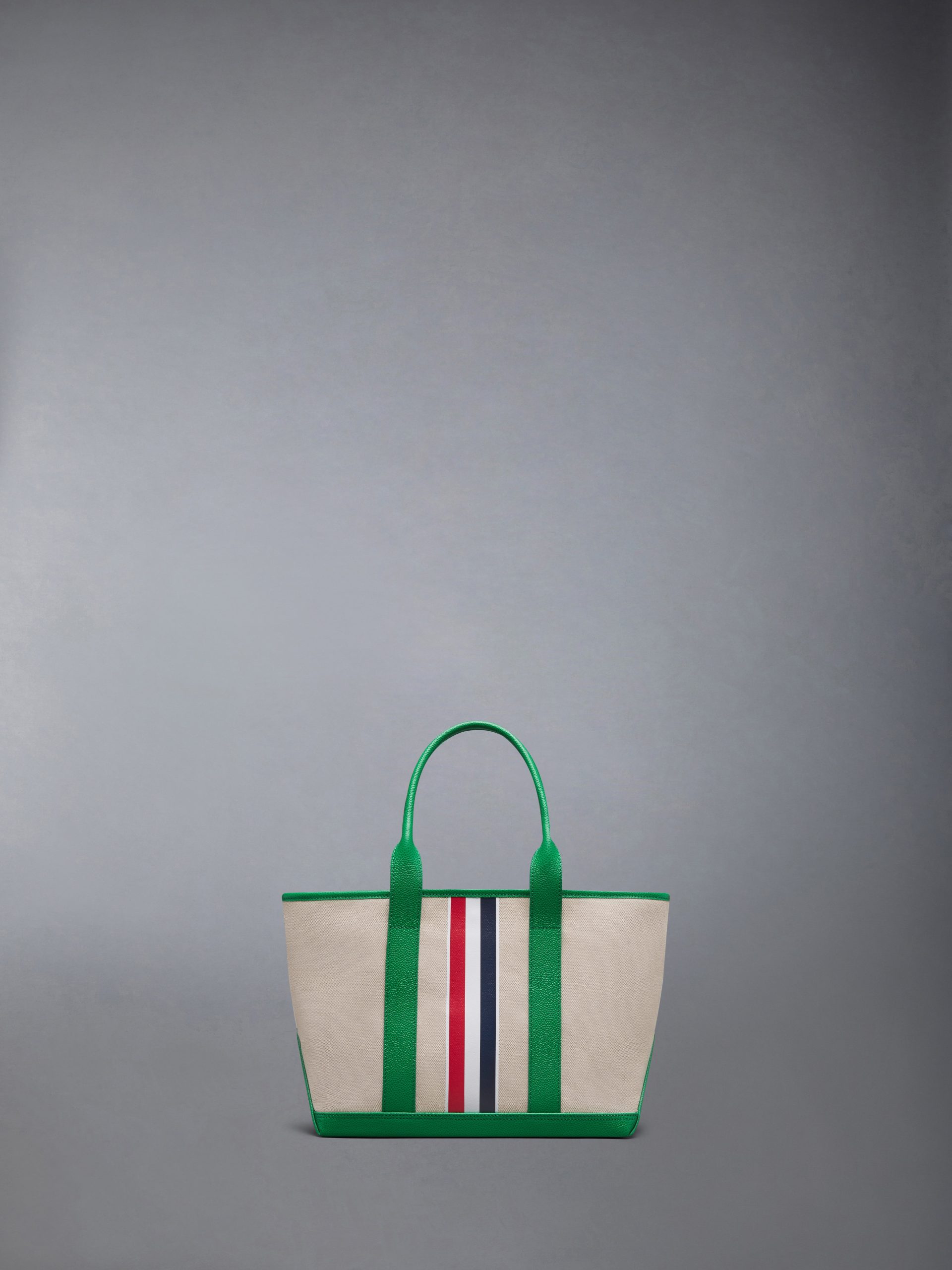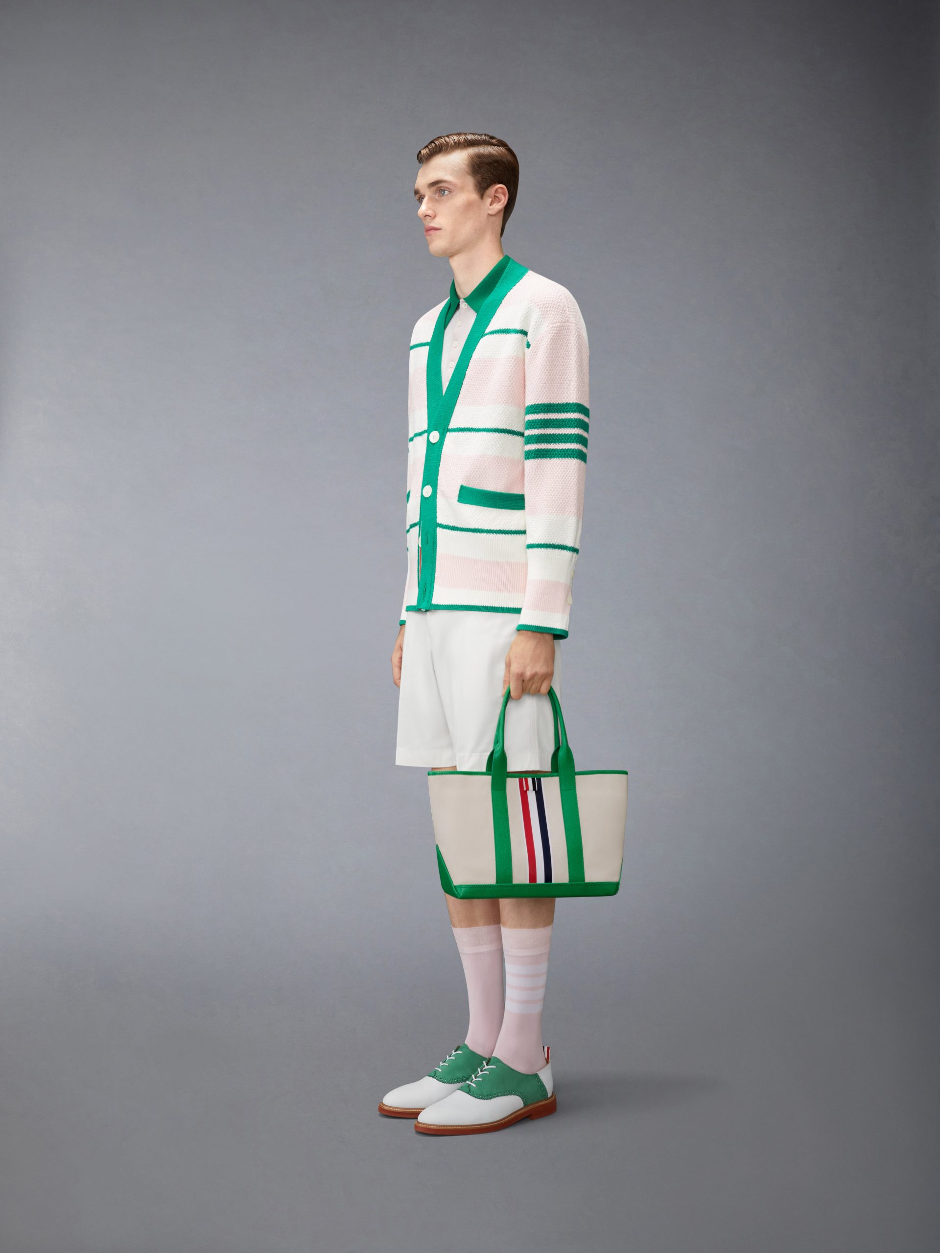 Rooted in traditional tool bags. this small tote translates practicality through a Thom Browne lens. Crafted in salt-and-pepper cotton canvas with a leather base and bold RWB stripes. it balances rugged materiality with graphic precision. Pair it with the Nubuck Rubber Sole Saddle Shoe to channel the season’s play on sport and structure.