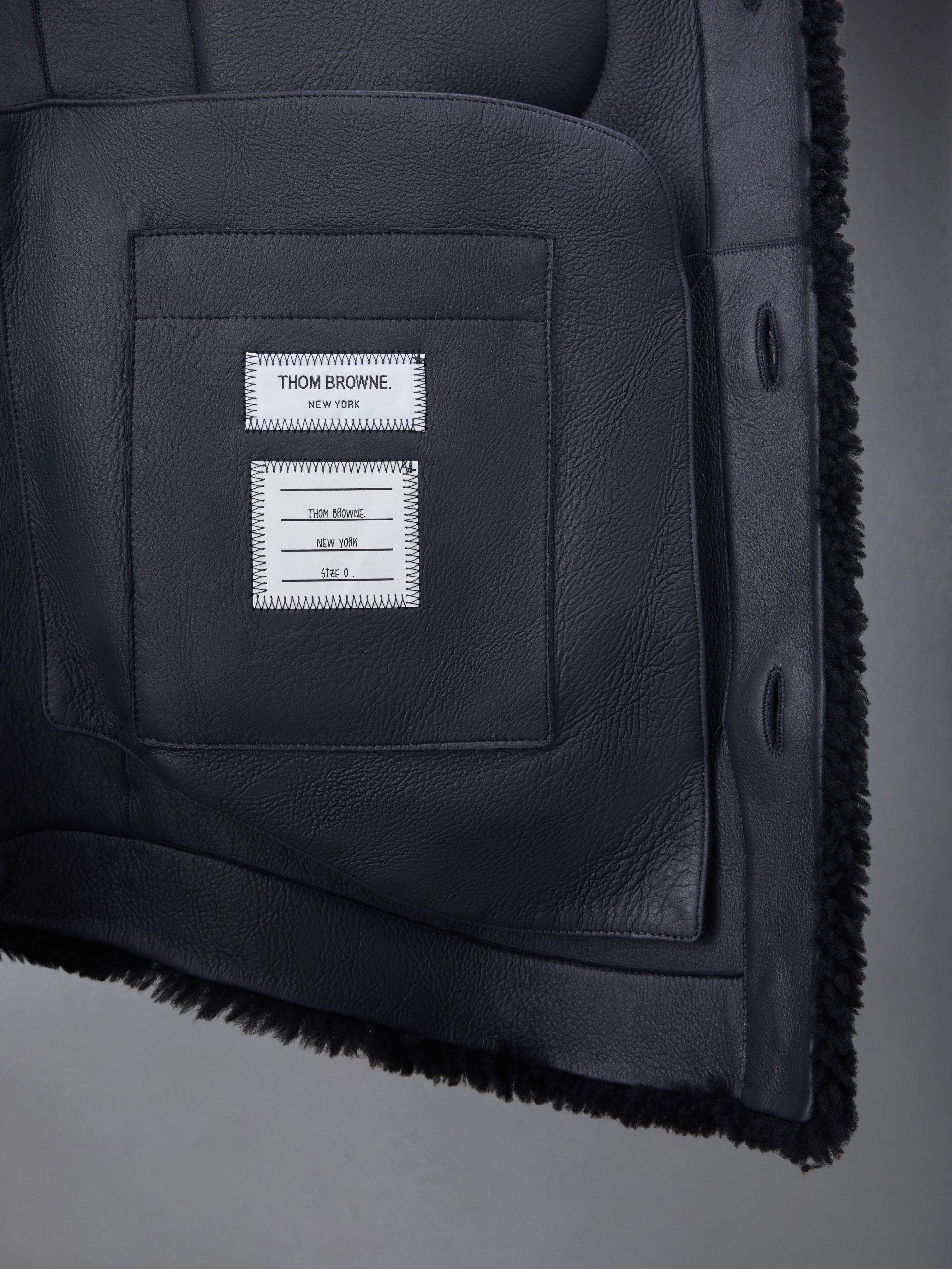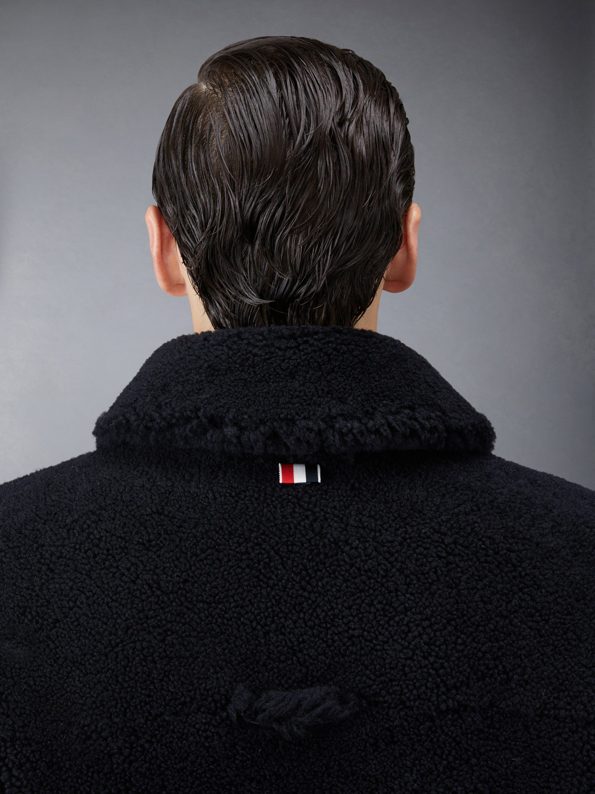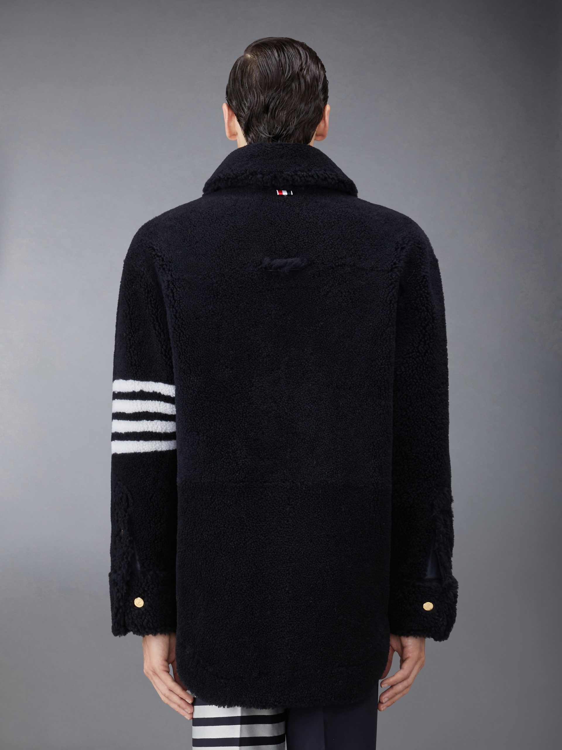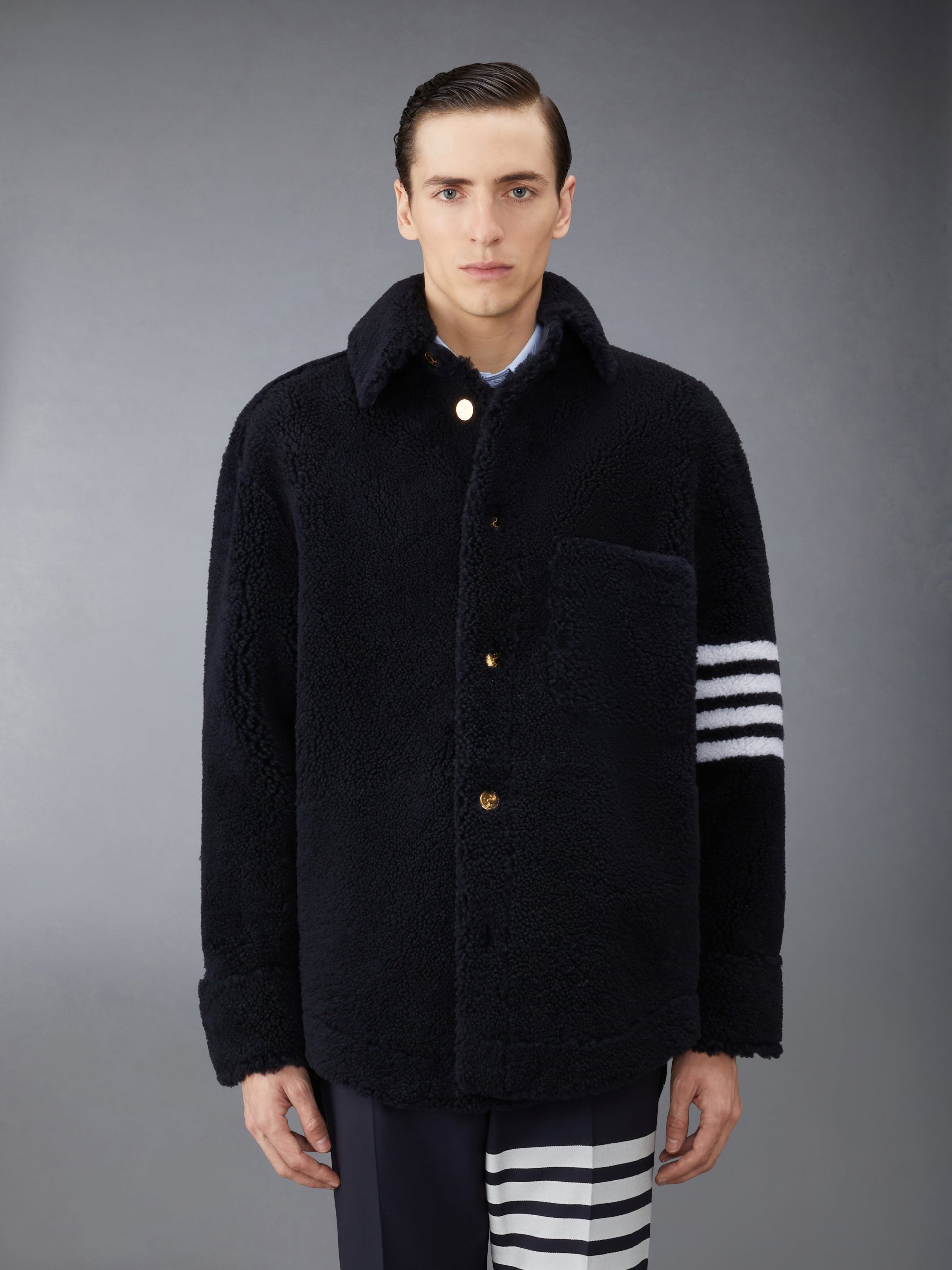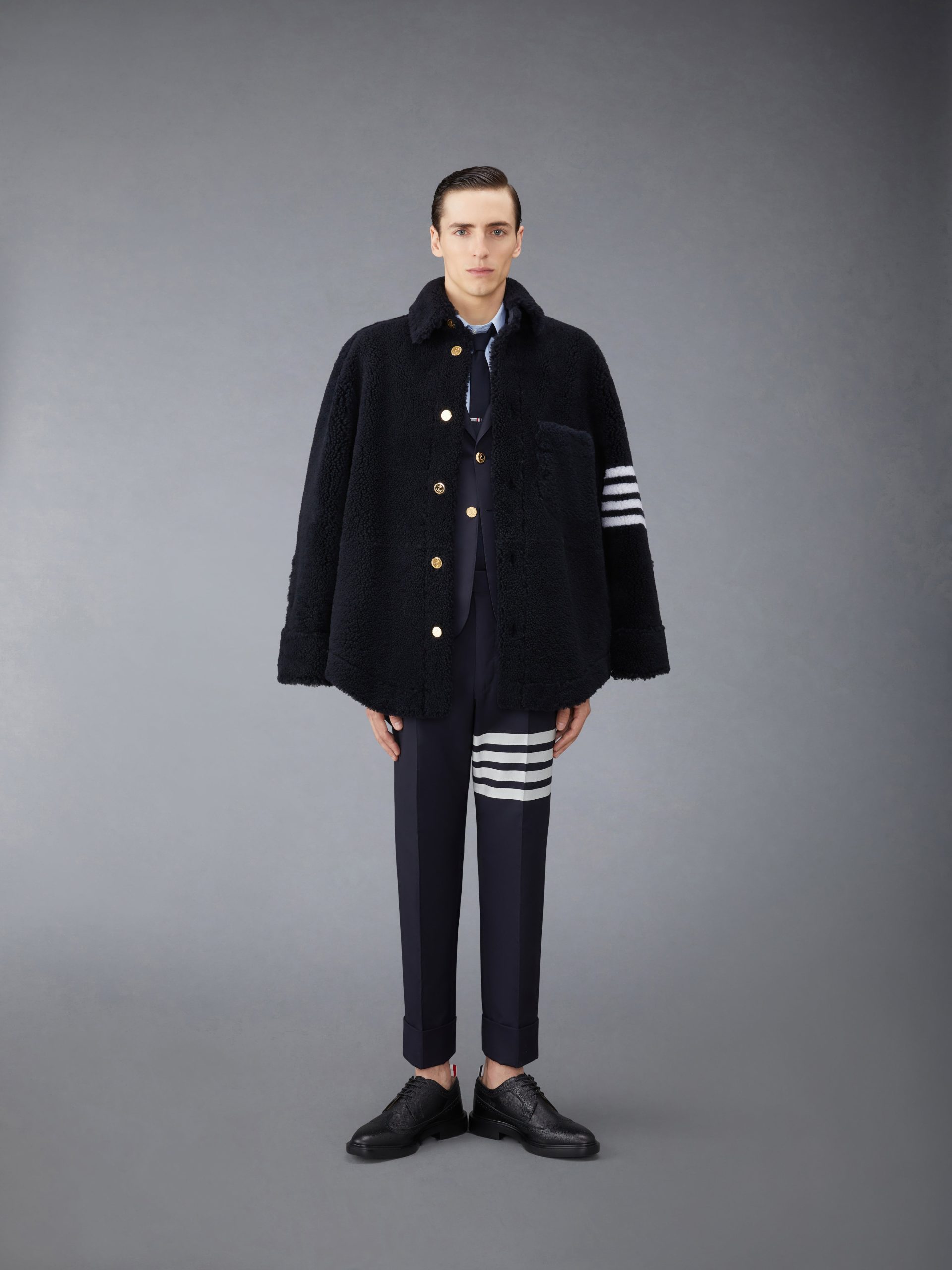 The pinnacle of cold-weather sophistication ? our Shearling 4-Bar Oversized Shirt Jacket. Signature Thom Browne emblems put a twist on fine winter wear.