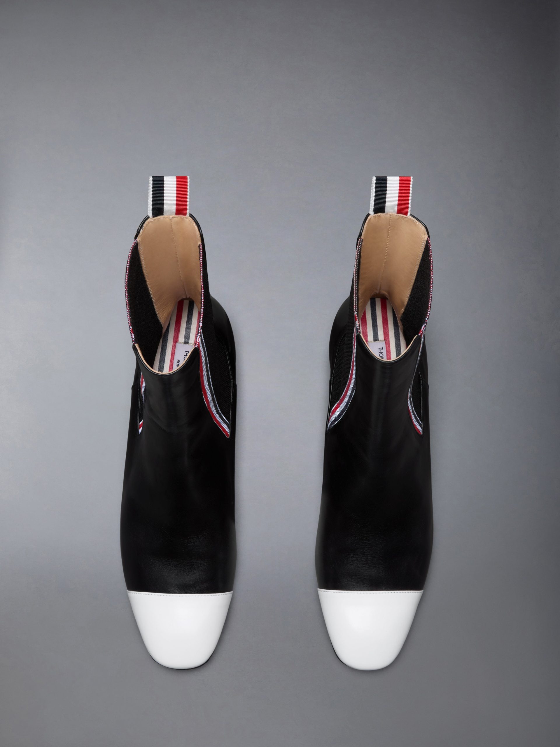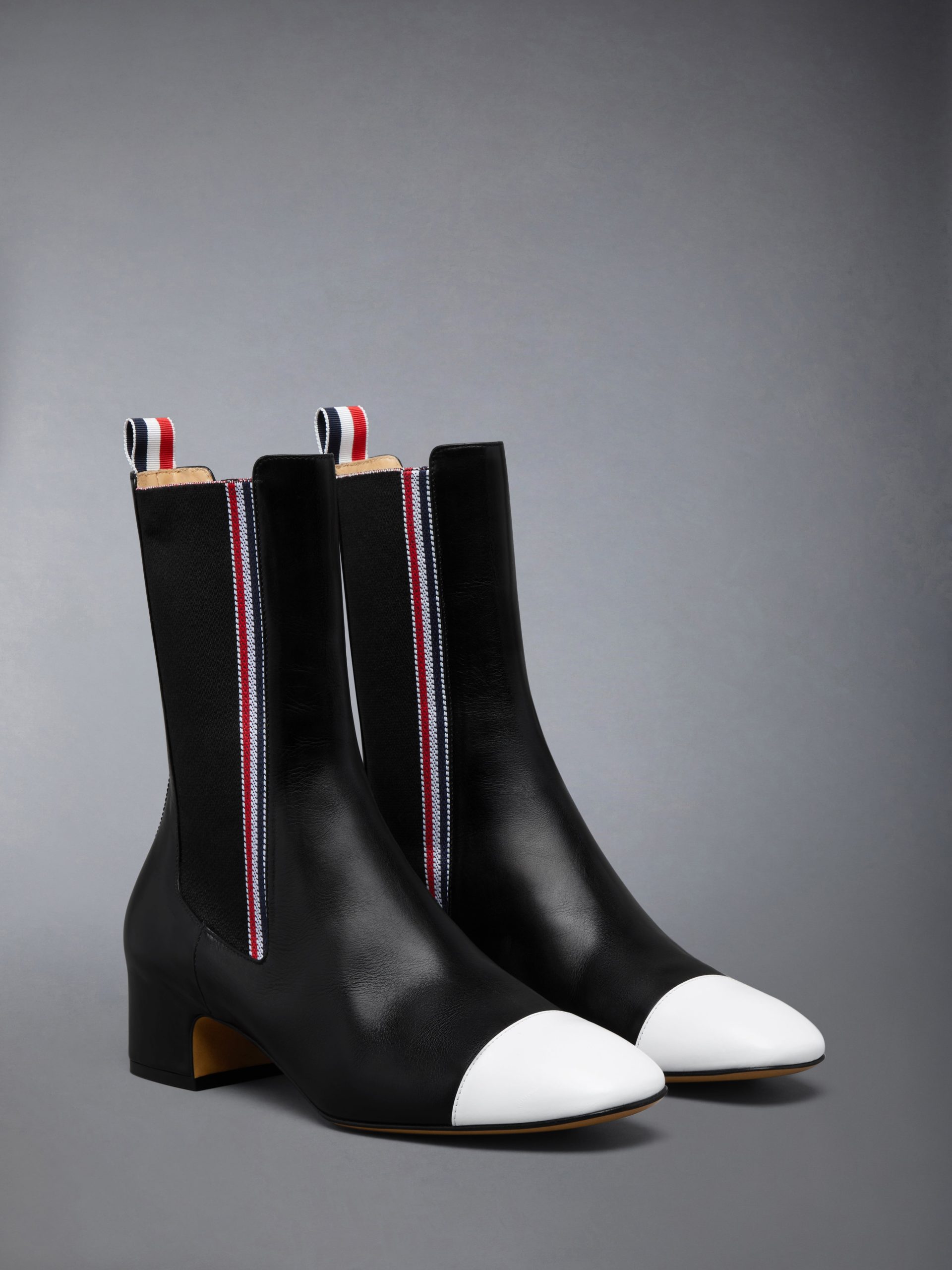 A classic Chelsea. reimagined through the Thom Browne lens. This mid-calf boot is crafted in lustrous calf leather with a structured block heel and contrast cap toe—a nod to the brand’s tailored precision. Clean lines and a refined silhouette transition effortlessly from formal to off-duty. anchored in signature detail and defined by everyday versatility.