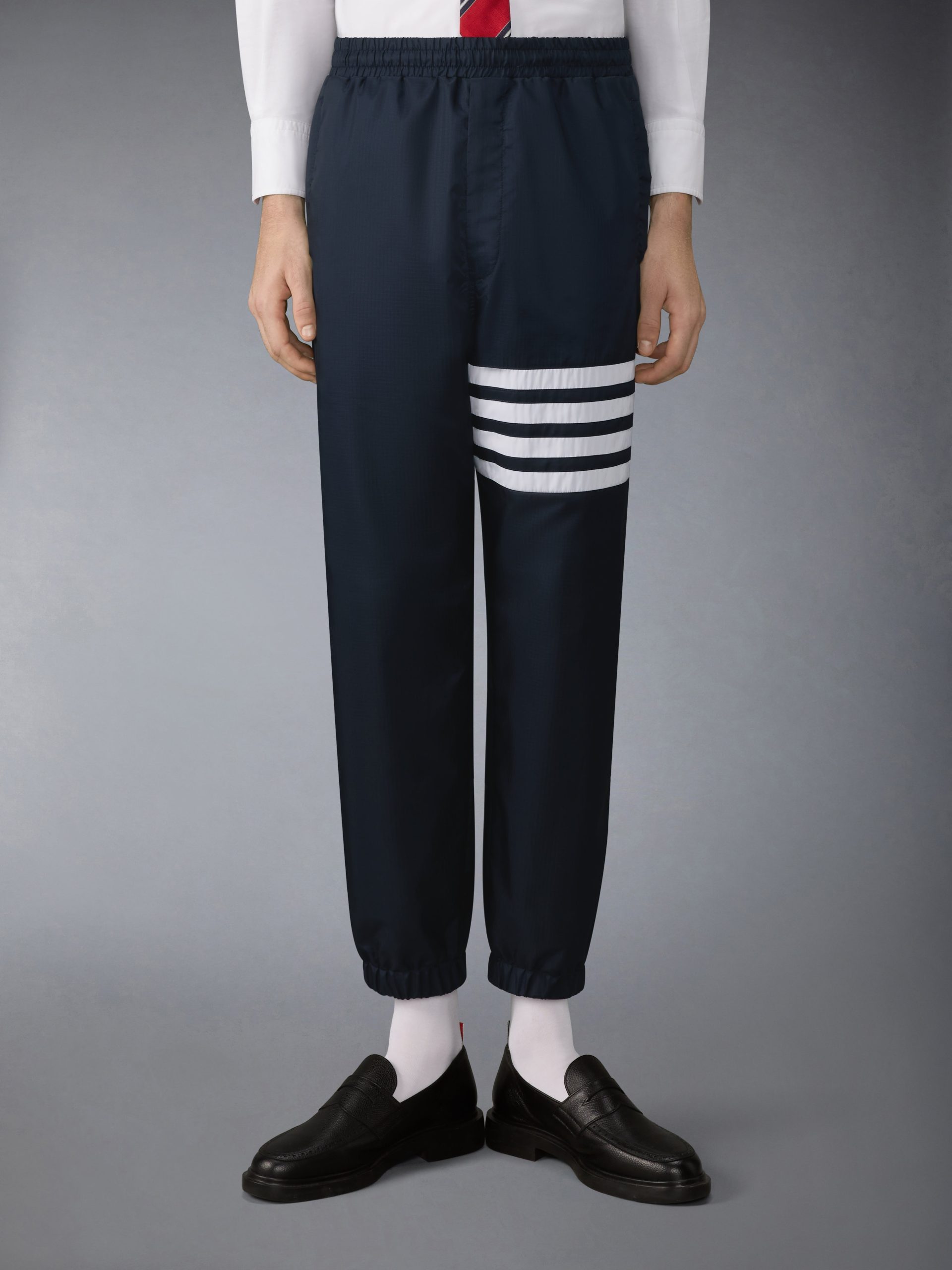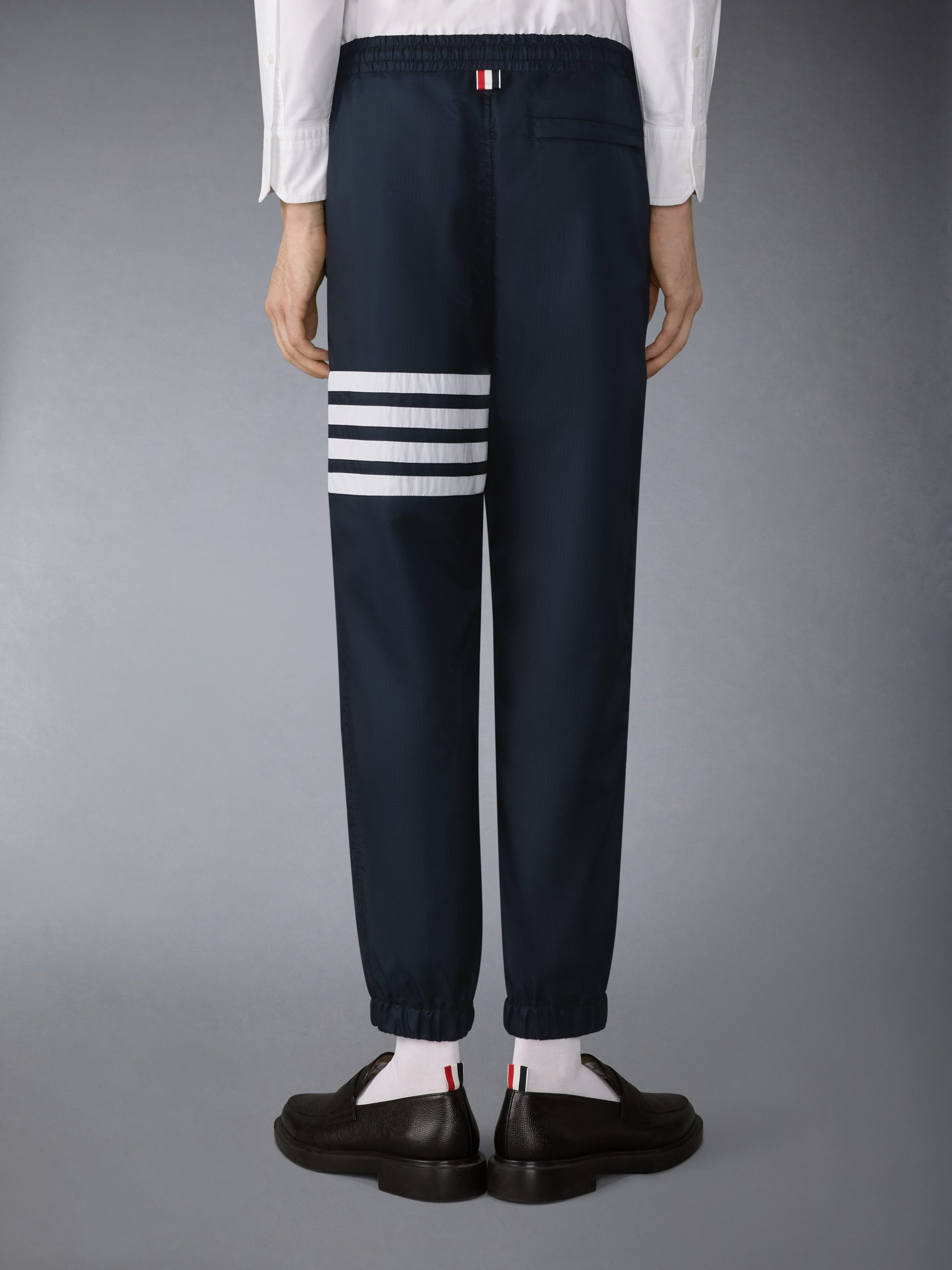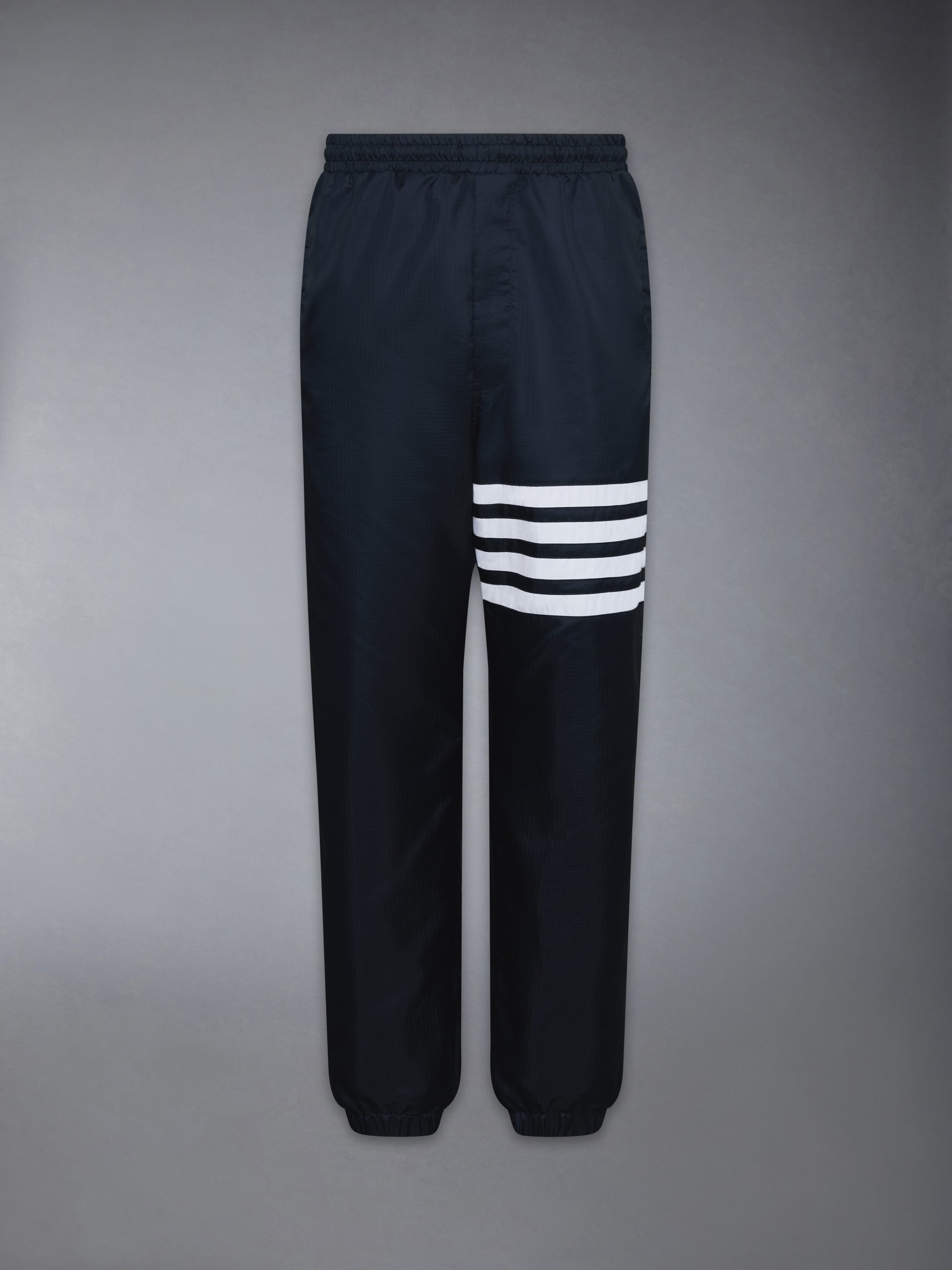 These track pants reinterpret athletic codes through the lens of engineered luxury. Developed in a new lightweight and weather-resistant shiny ripstop. it balances structure with technical precision.