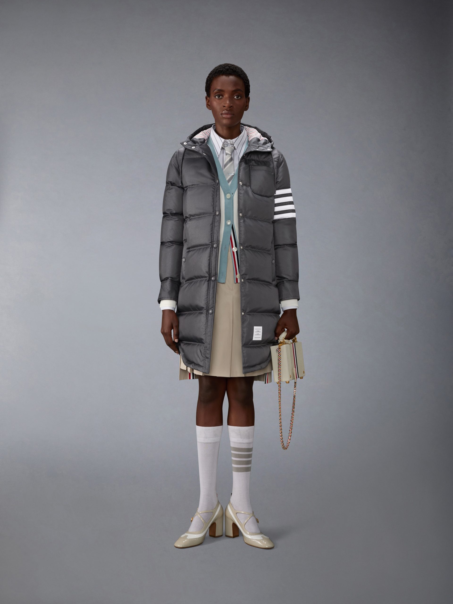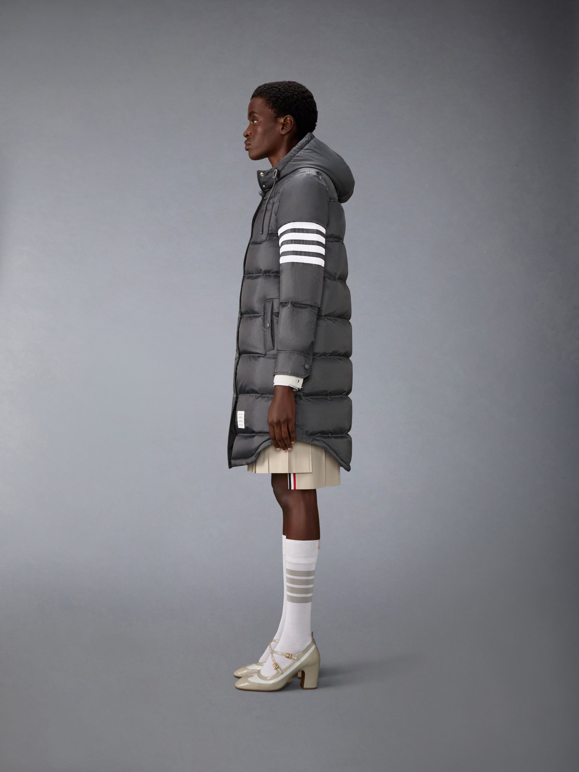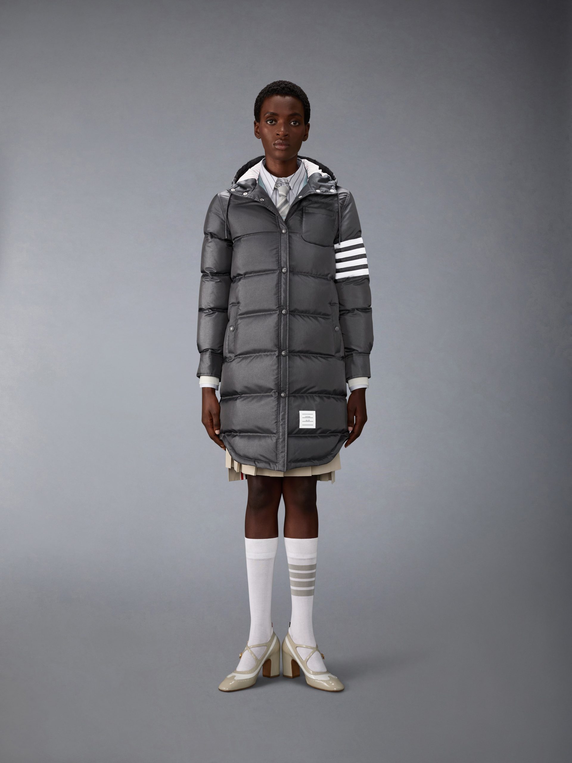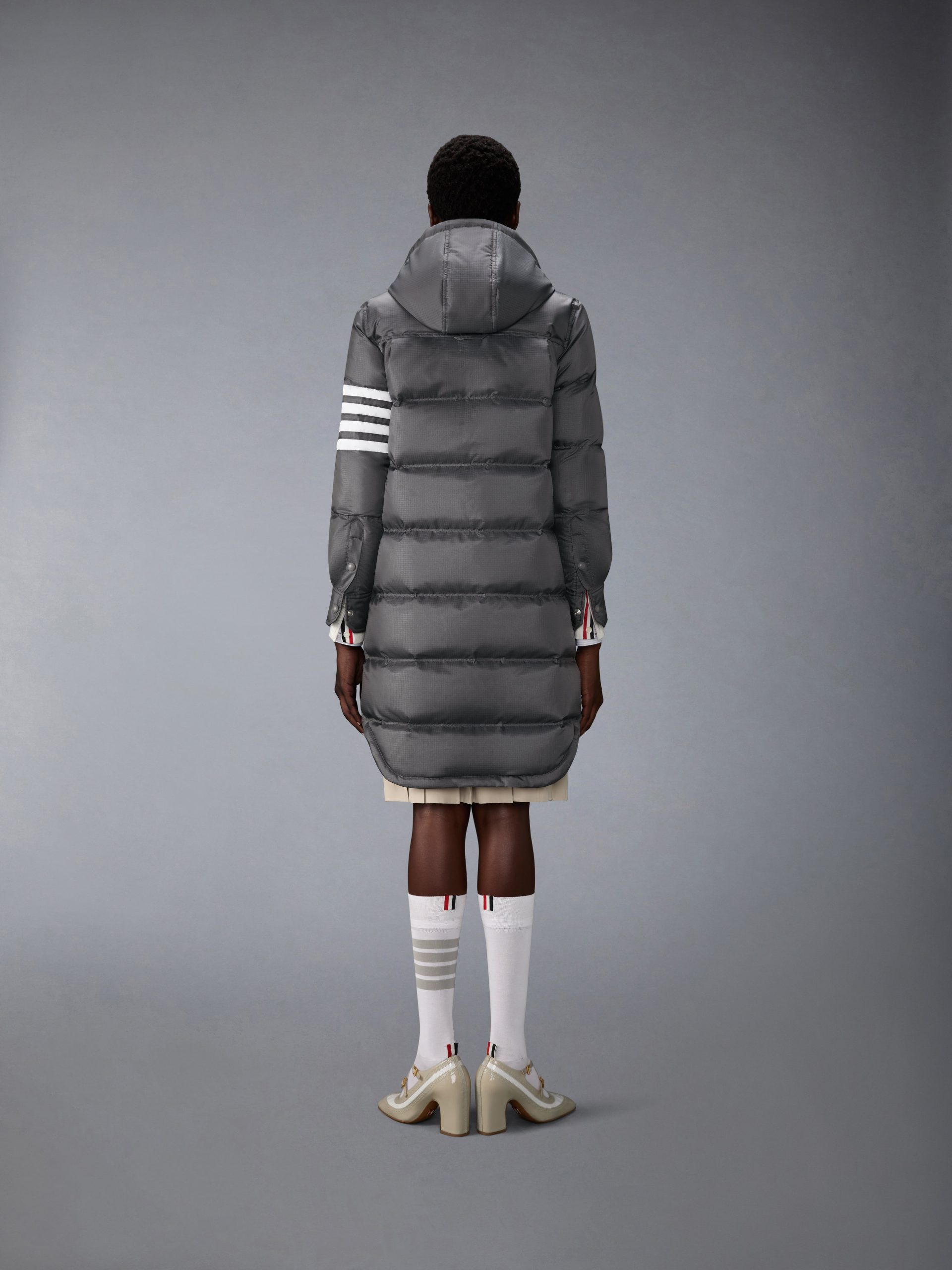 Shiny ripstop enters the collection as a lightweight. weather-resistant fabric. crafted into a down parka that balances warmth with tailored form. A subtle sheen and durable grid texture bring depth to the material. while a shirtdress-inspired hem softens the silhouette. Complete the look with the season’s All-Terrain Boot—blending rugged functionality with elevated design.