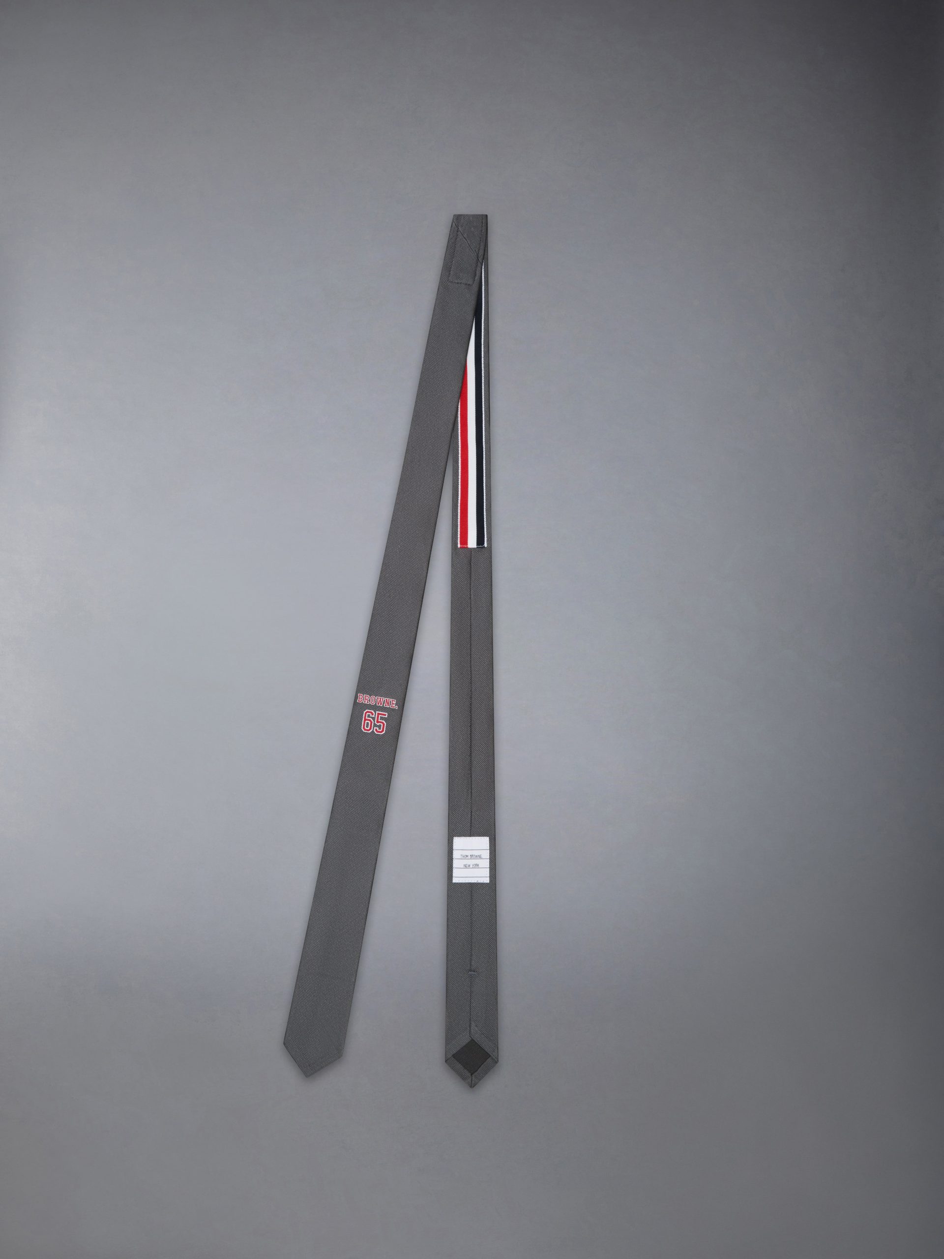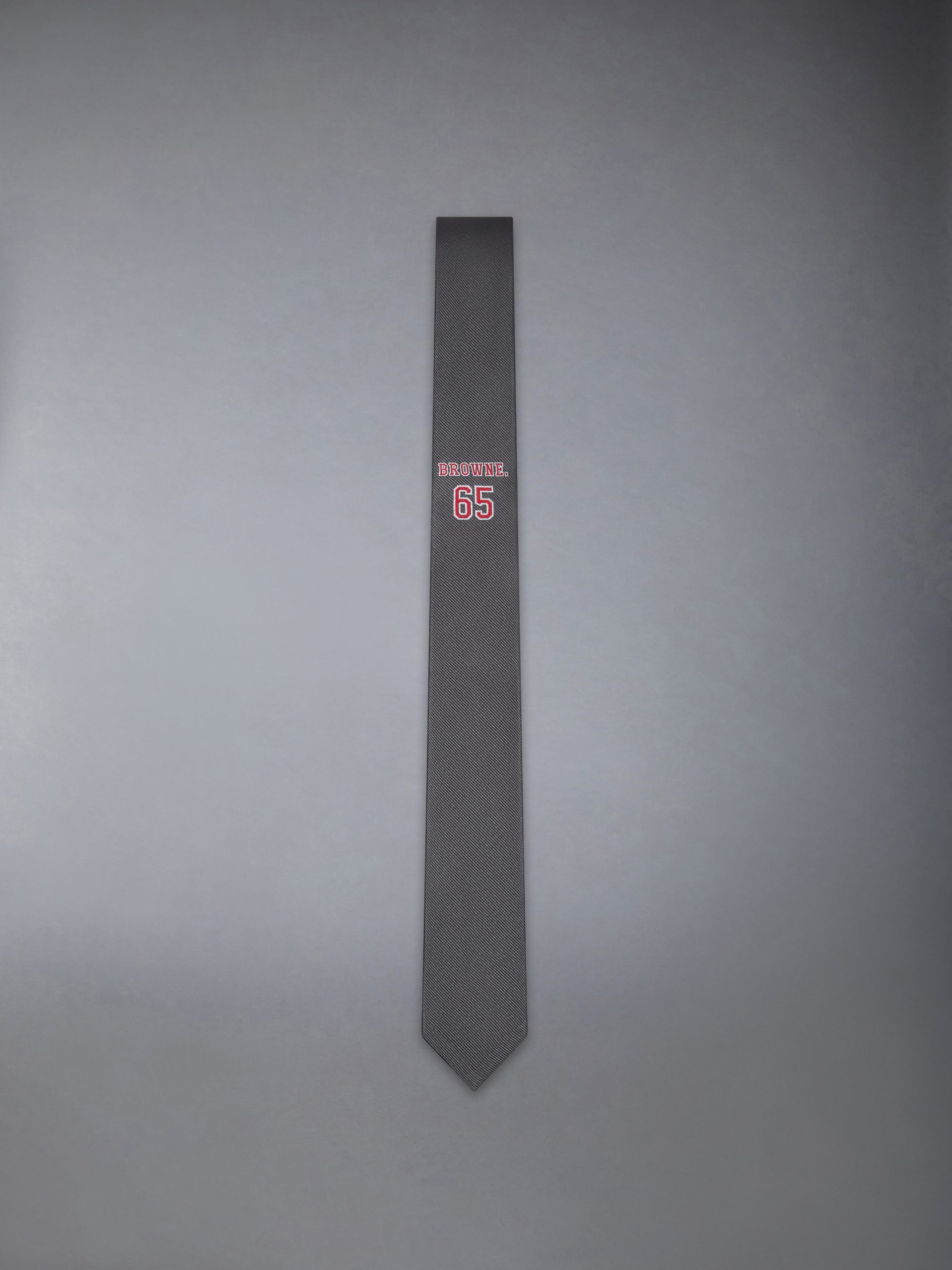 Paying homage to collegiate classics. this tie features bold BROWNE. lettering and the number 65—Thom Browne’s birth year—embroidered in an iconic varsity font tied to American tradition. A symbol of identity and precision. it reflects the brand’s appreciation for structure. legacy. and considered craft. Style with a crisp white shirt and cardigan to echo its school-uniform roots with modern polish.