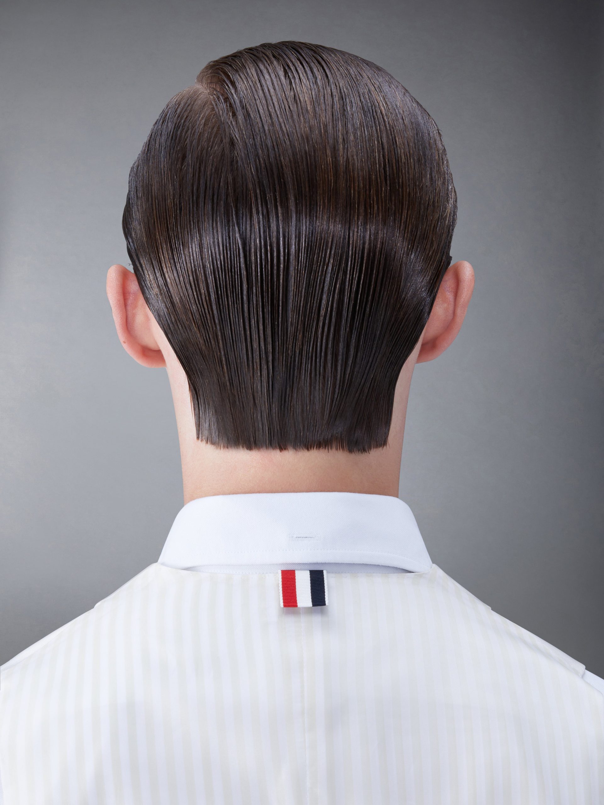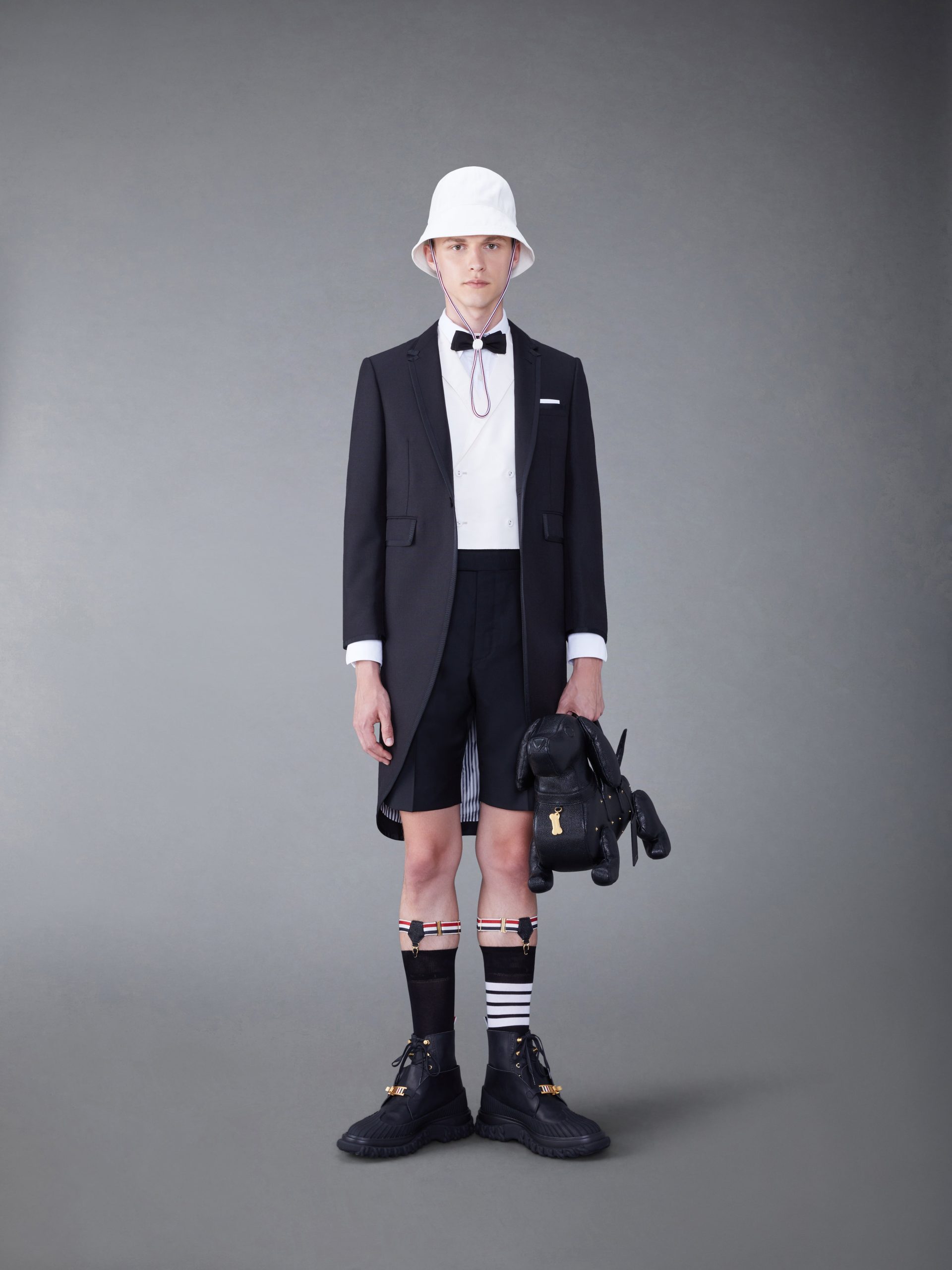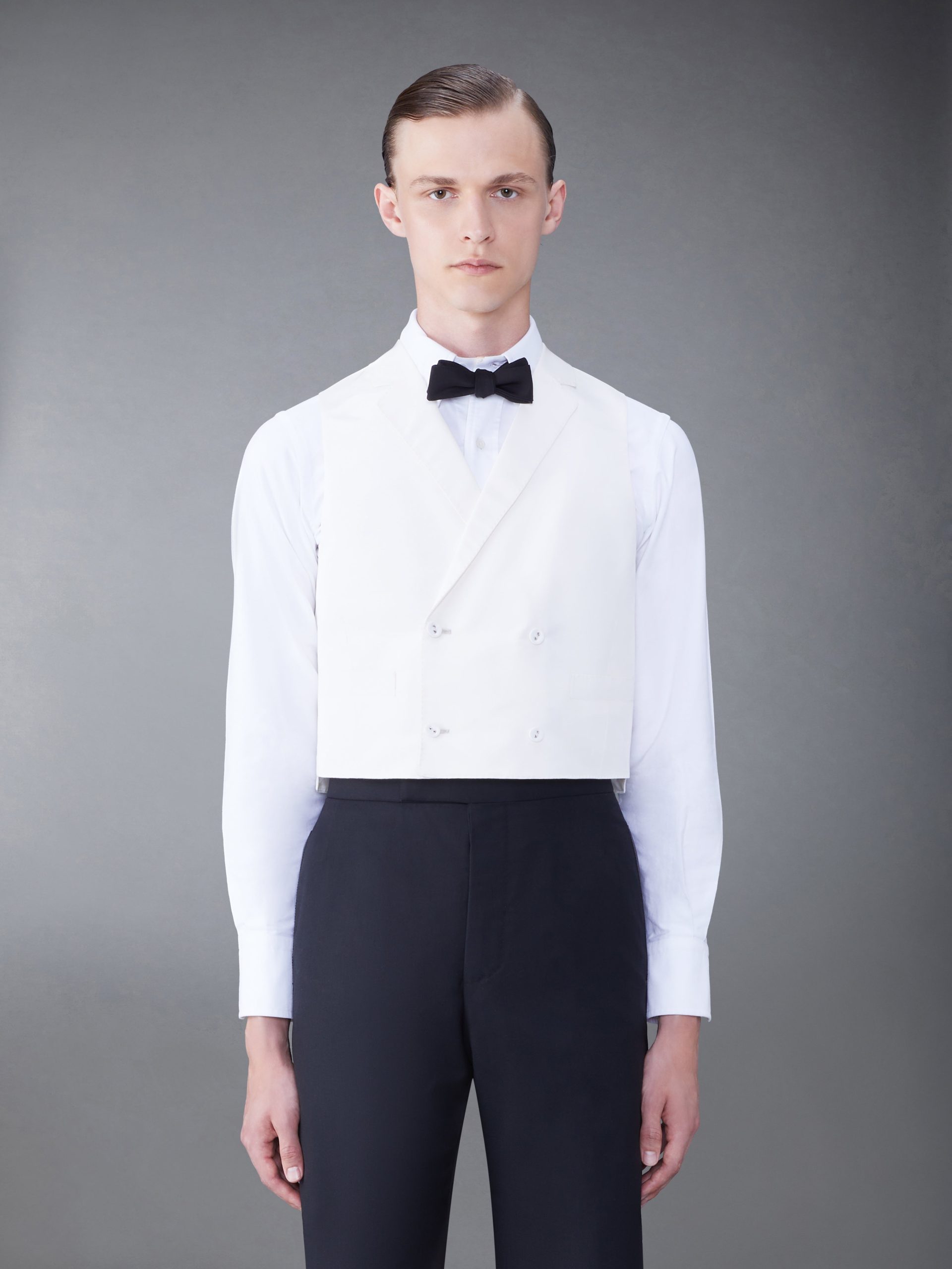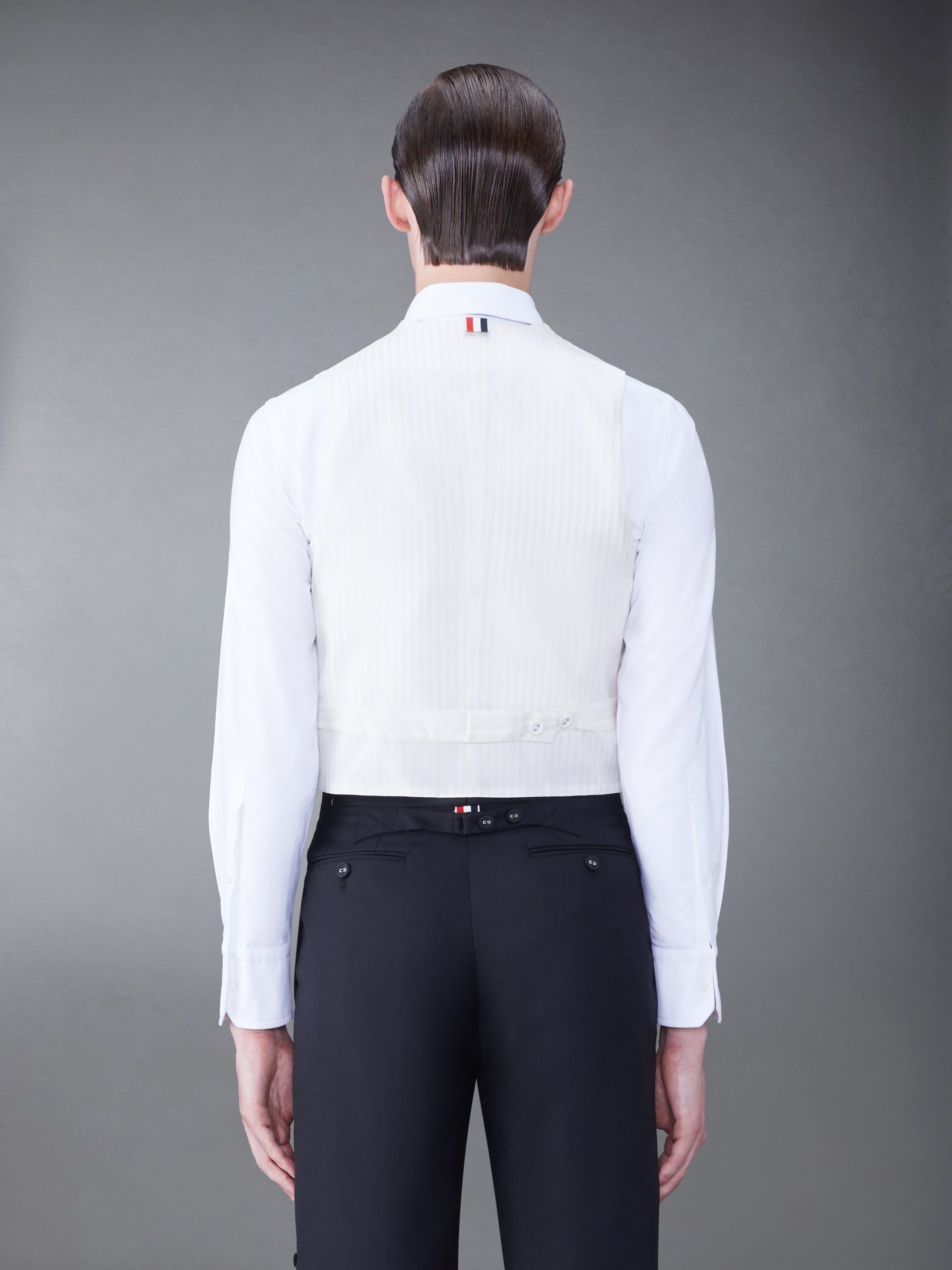 Our Silk Double Breasted Vest in elegant winter white. This silhouette exudes Thom Browne’s mastery of minimalistic design and tailored excellence. A front button closure is at center. while a striped panel and our iconic striped grosgrain loop tab rests at the back.