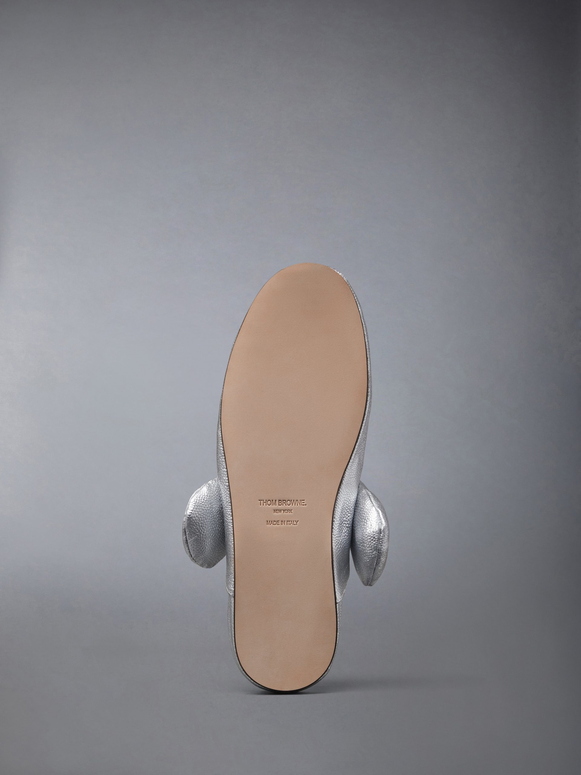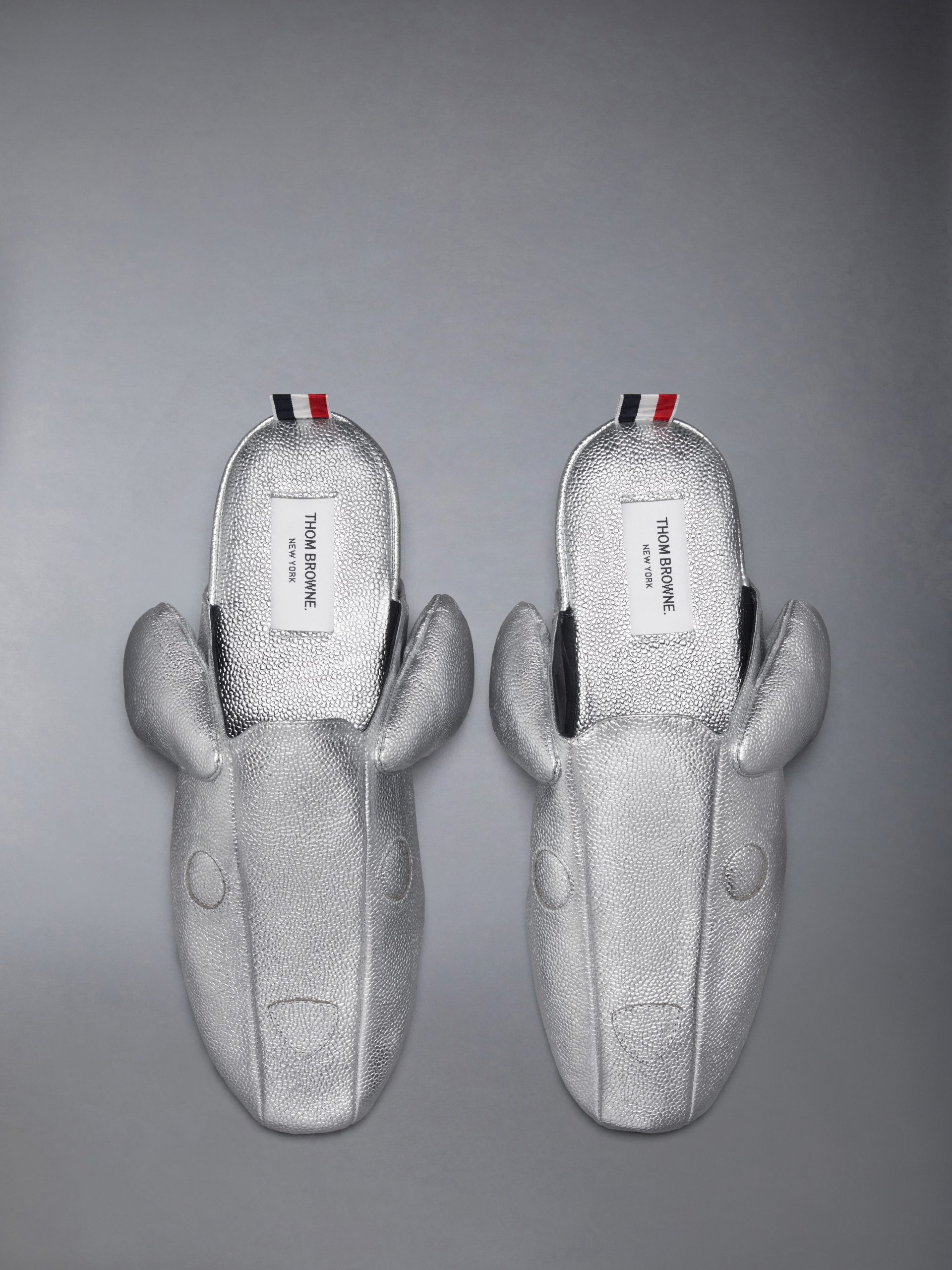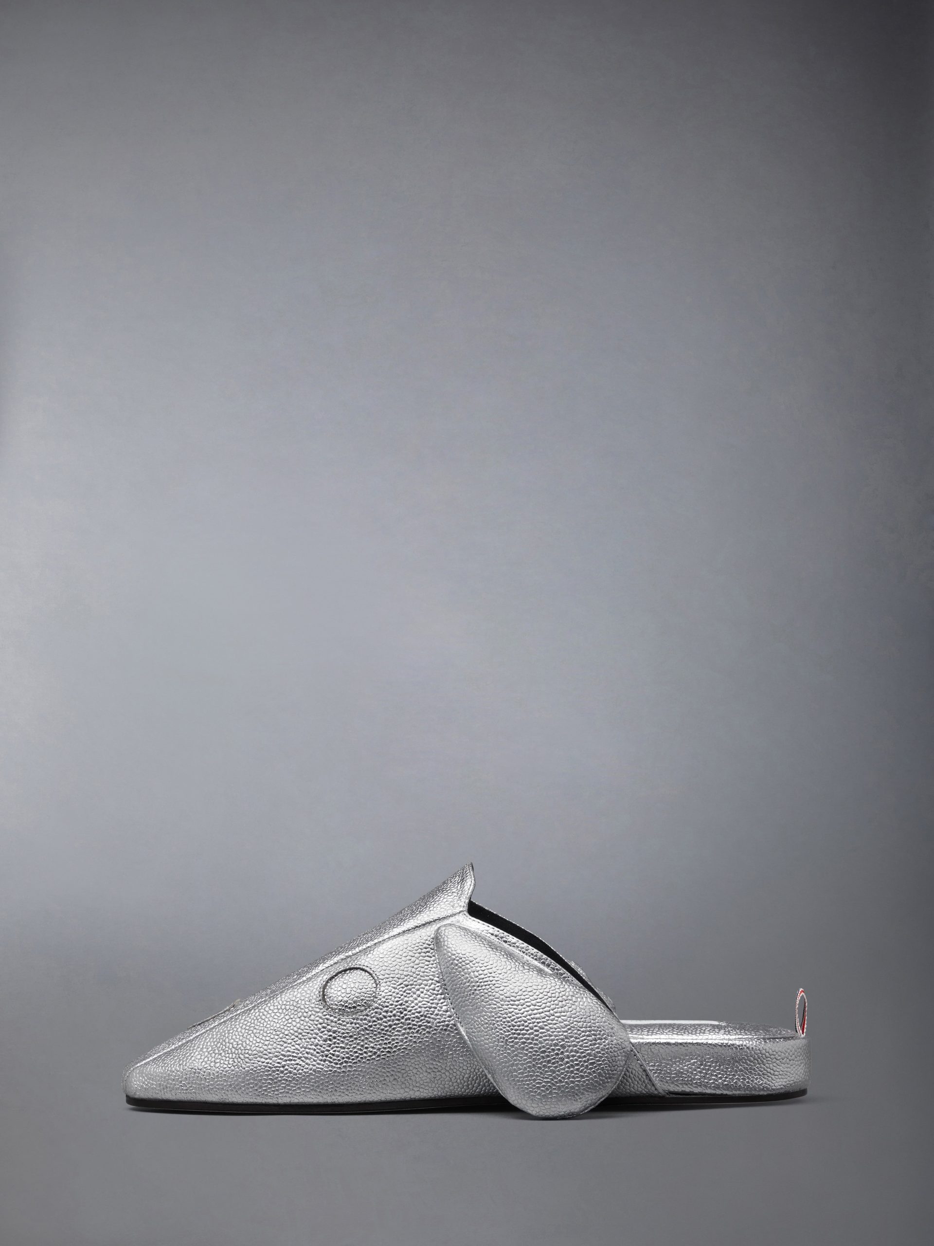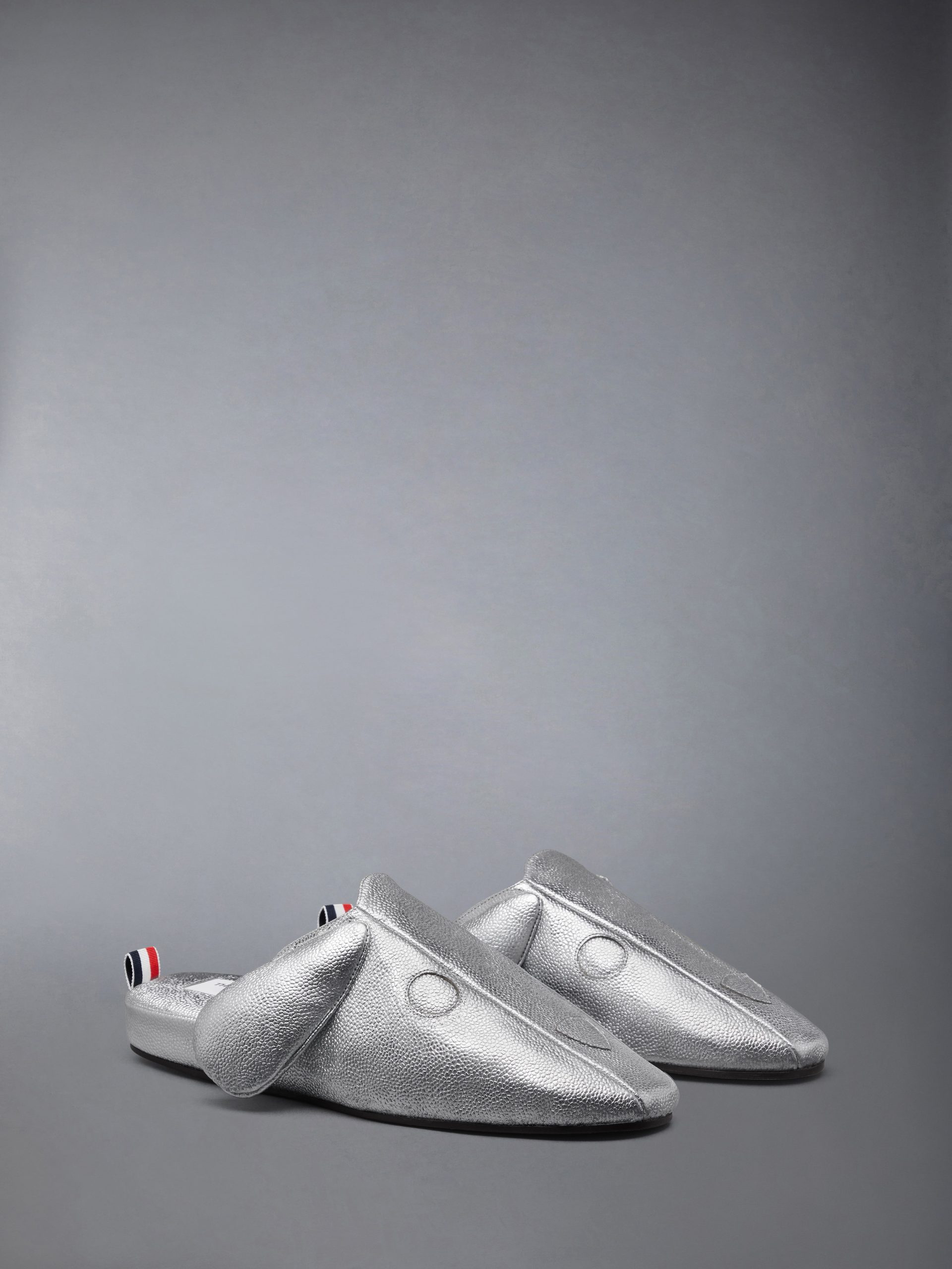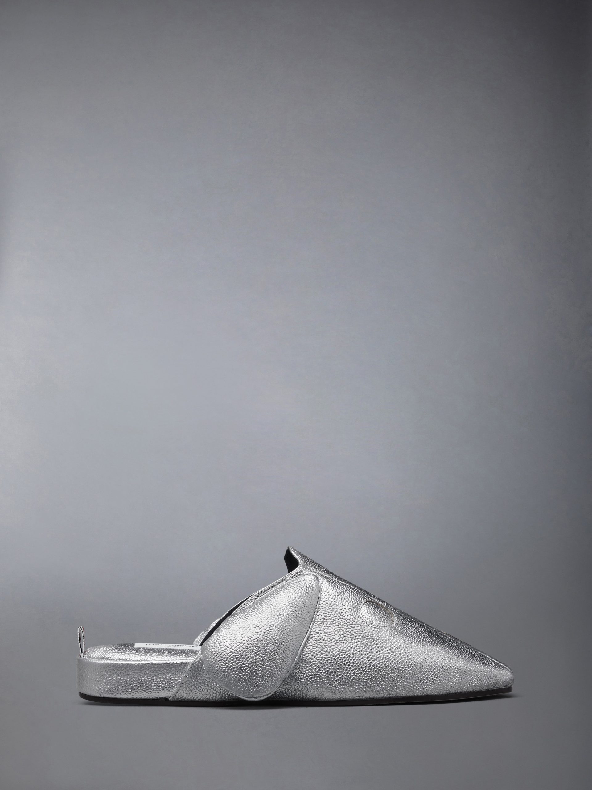 Celebrating a decade of Hector. these slippers blend comfort with character. reimagining Thom Browne’s beloved icon in metallic pebble grain leather. Playful in form yet polished in finish. the design features a padded insole and a refined leather sole. A lighthearted companion designed for ease indoors or out.