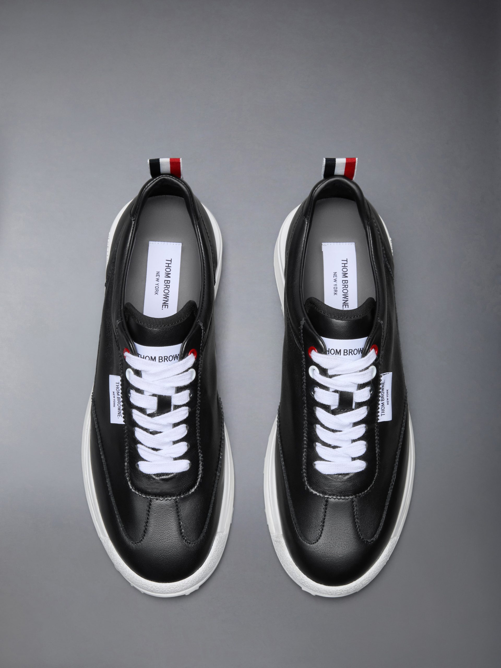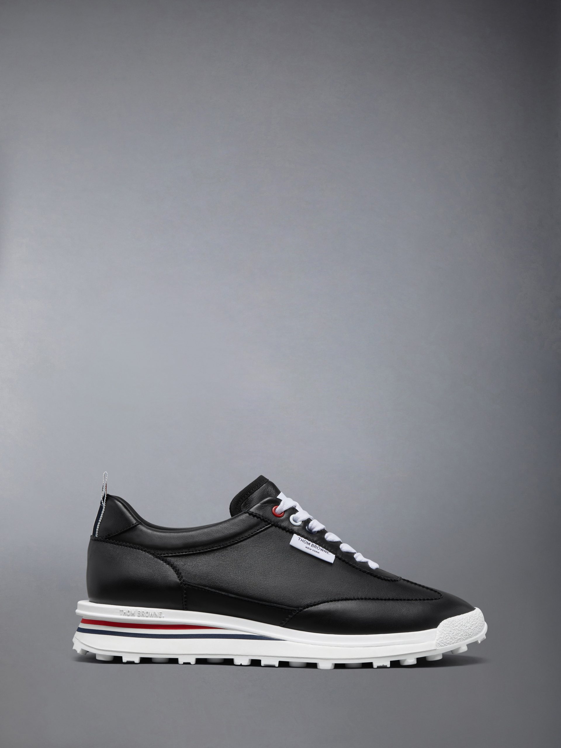 A streamlined take on athletic styling. This Tech Runner sneaker is crafted in soft nappa leather with tonal stitching and an unlined construction that enhances lightness and flexibility. Set on a sculpted sole with tricolor insert. it captures Thom Browne’s signature balance of precision. performance. and pared-back ease.