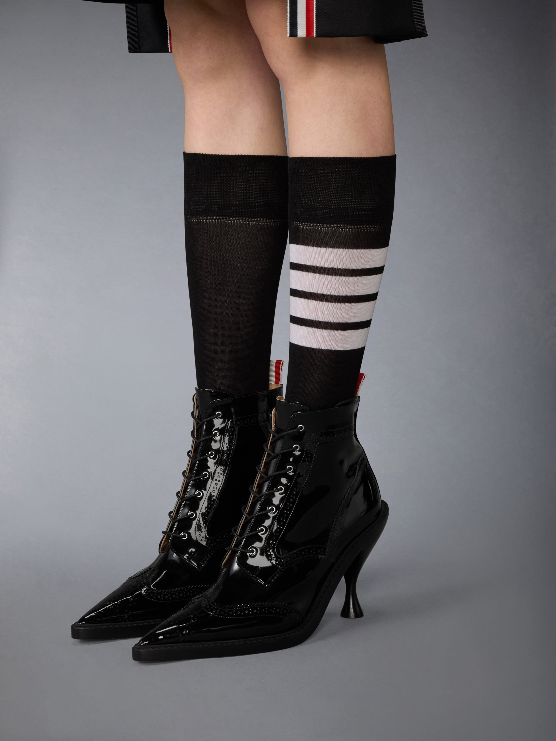 Sleek and sculptural. this wingtip boot reimagines classic brogued footwear with bold precision. Crafted in glossy patent leather. the sharply pointed toe and curved heel bring a directional edge to the silhouette in a balance of heritage detailing and modern refinement.