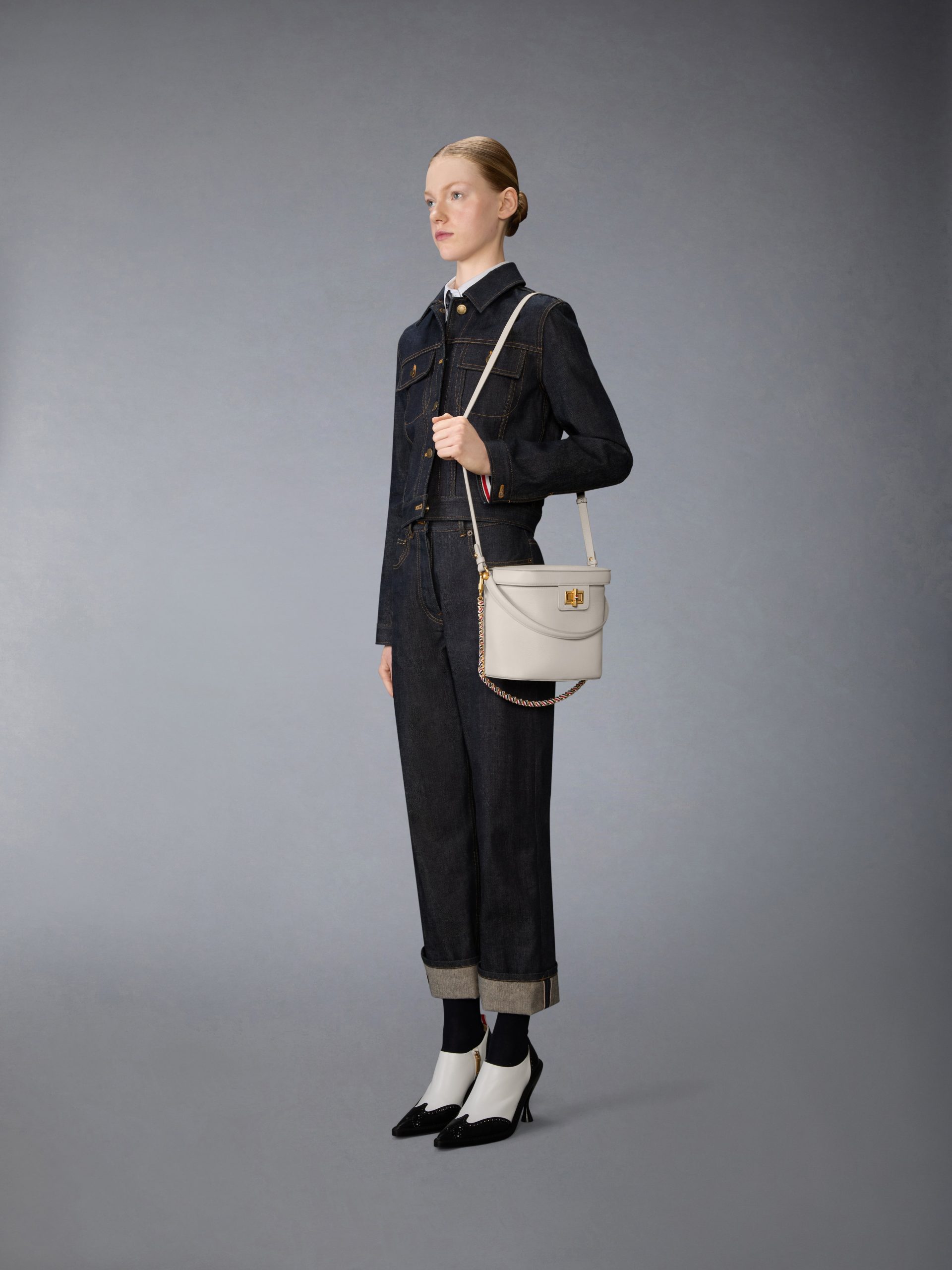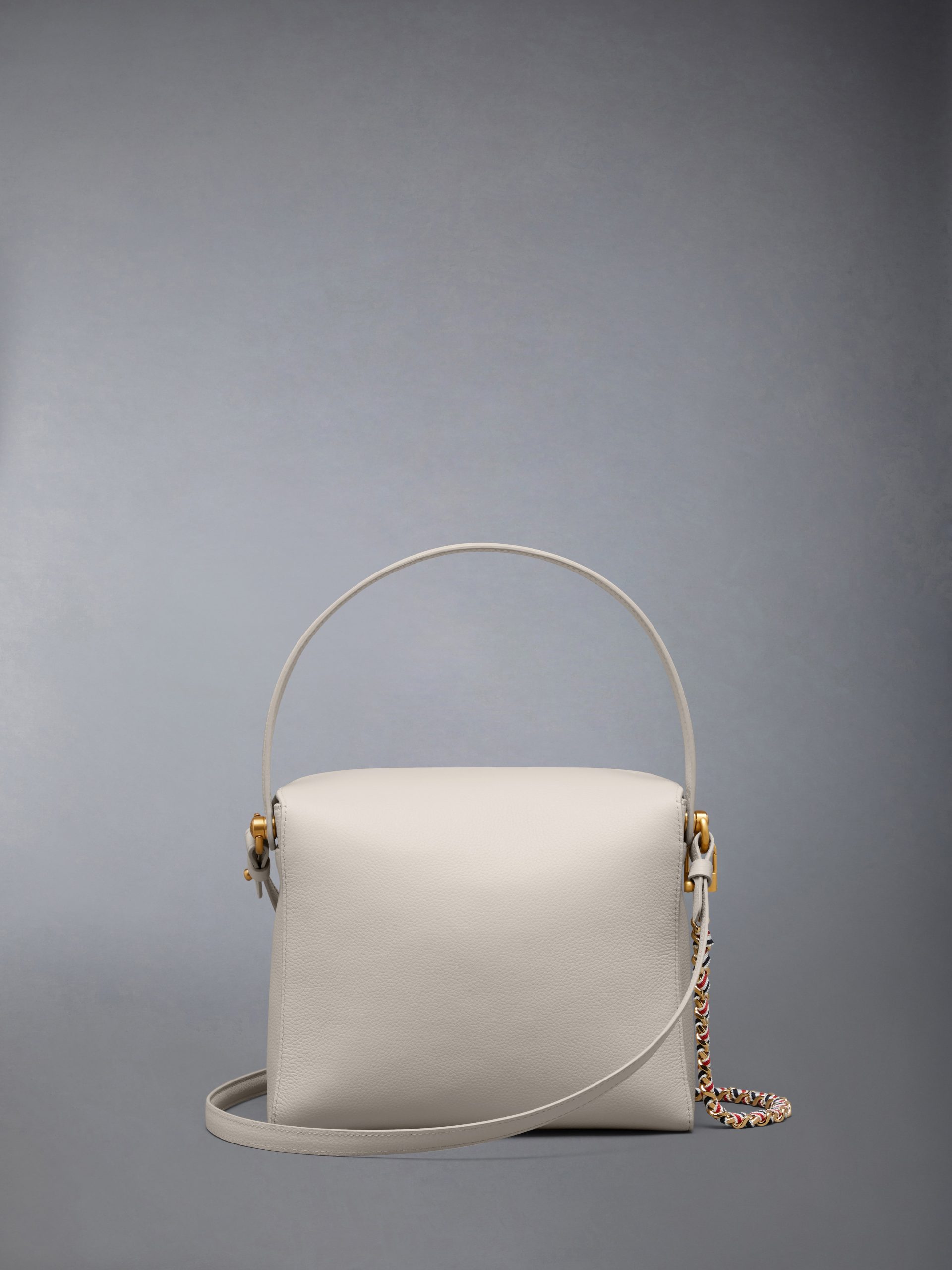 This softly structured box bag balances relaxed shape with signature detailing. Crafted in pebble grain leather. it features a magnetic flap and RWB enamel turn-lock closure. A woven chain strap trimmed in grosgrain adds graphic texture—clean. compact. and distinctly Thom Browne.
