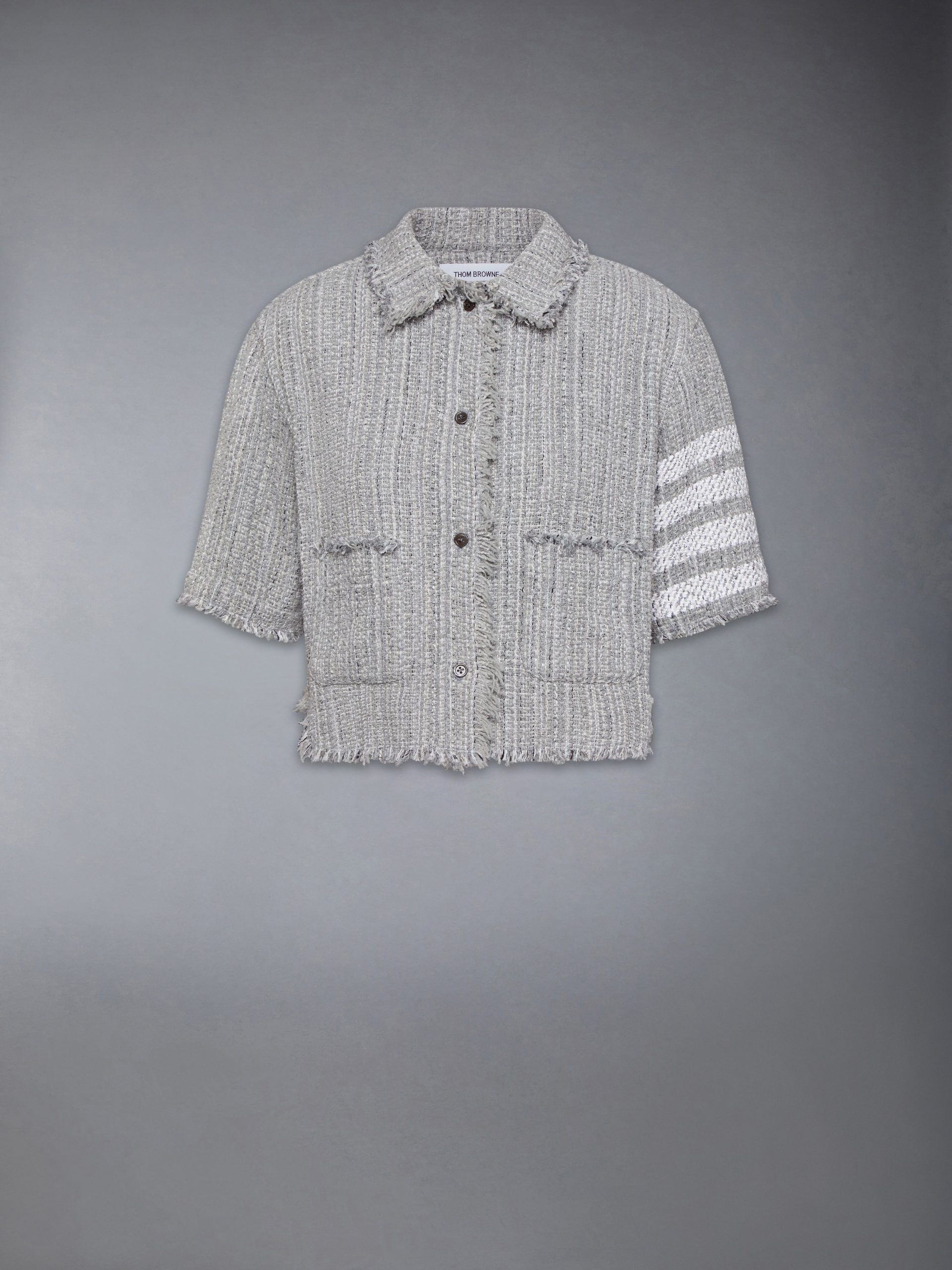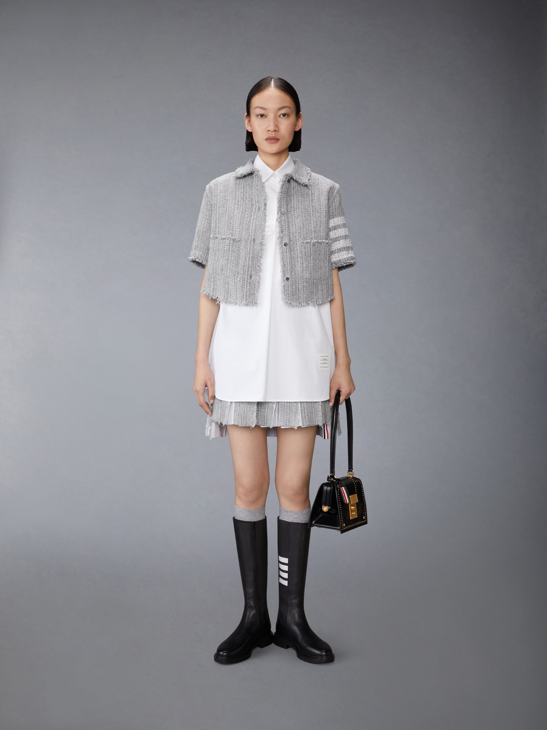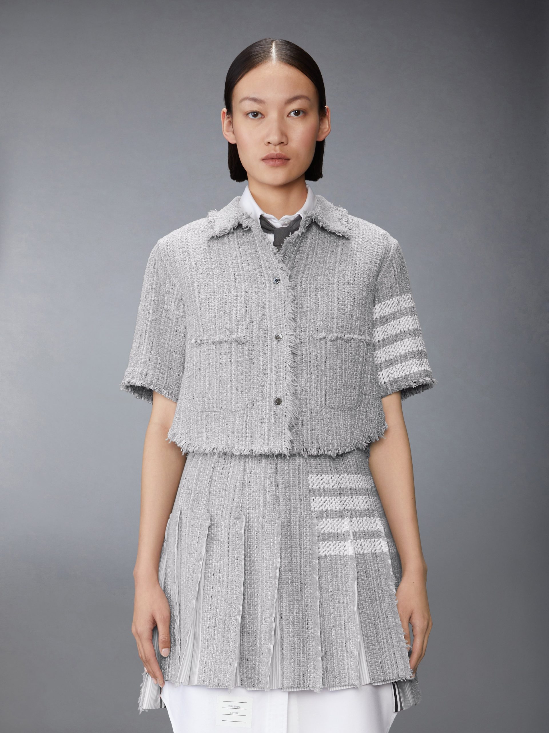 Reimagined Thom Browne look worn by the Grammy-nominated singer of Espresso. this youthful. feminine. cropped shirt is crafted from luxurious solid tweed. Pair it with our matching Solid Tweed 4-Bar Pleated Mini Skirt to complete the outfit.