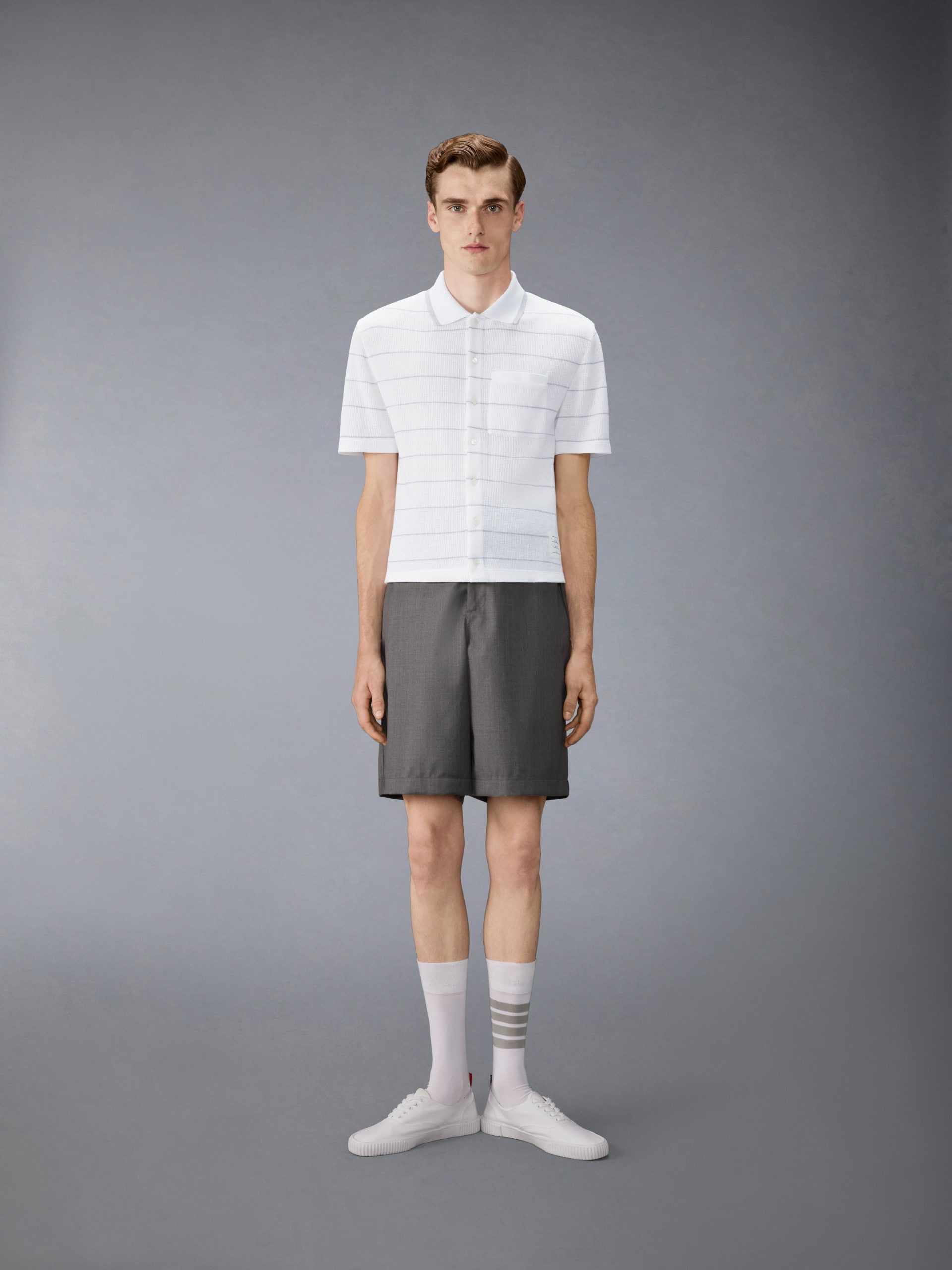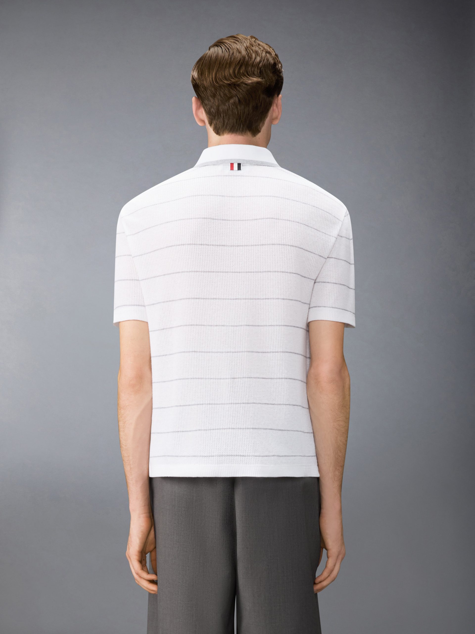 Crafted in a lightweight cotton-linen blend with a waffle stitch and subtle stripe texture. this short-sleeve shirt balances structure and softness with natural composure. The open knit lends lightness to the silhouette. while defined lines give shape to the relaxed construction. Pair it with the Tech Wool Twill Track Shorts and Heritage Trainers.