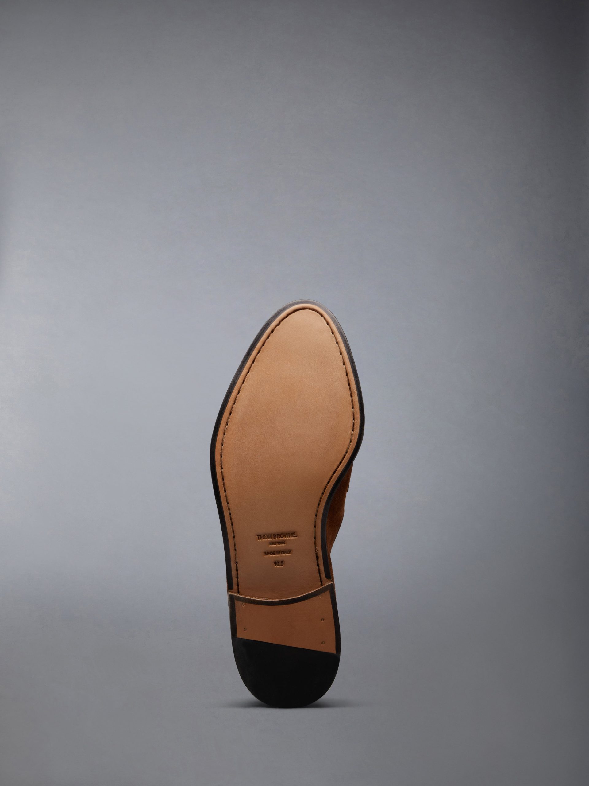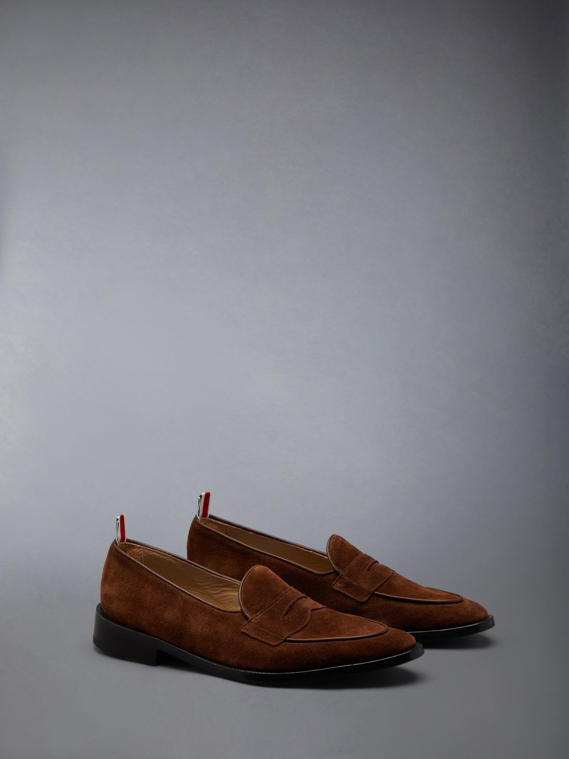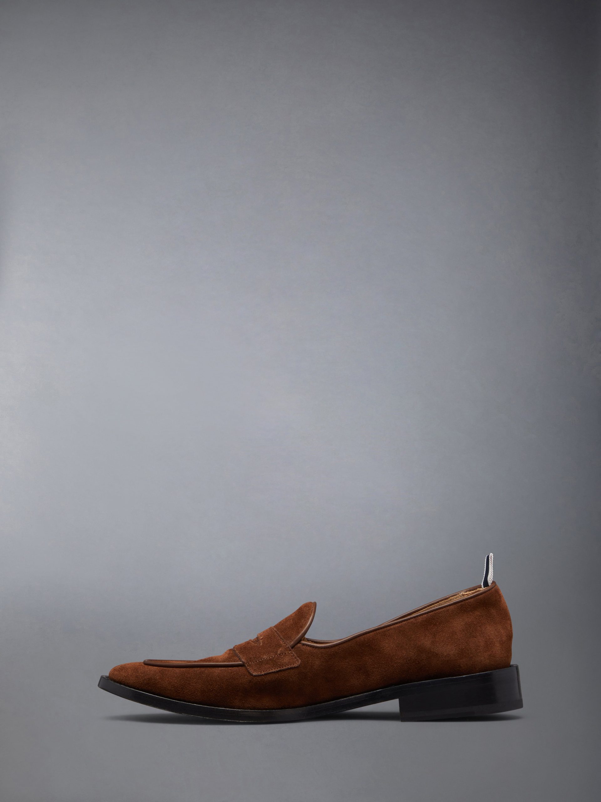A traditional silhouette crafted with the highest quality of classic shoemaking. our Suede Varsity Penny Loafers feature a flexible leather sole for comfort and rich suede upper. perfect for elevated spring evenings. or days at the office.