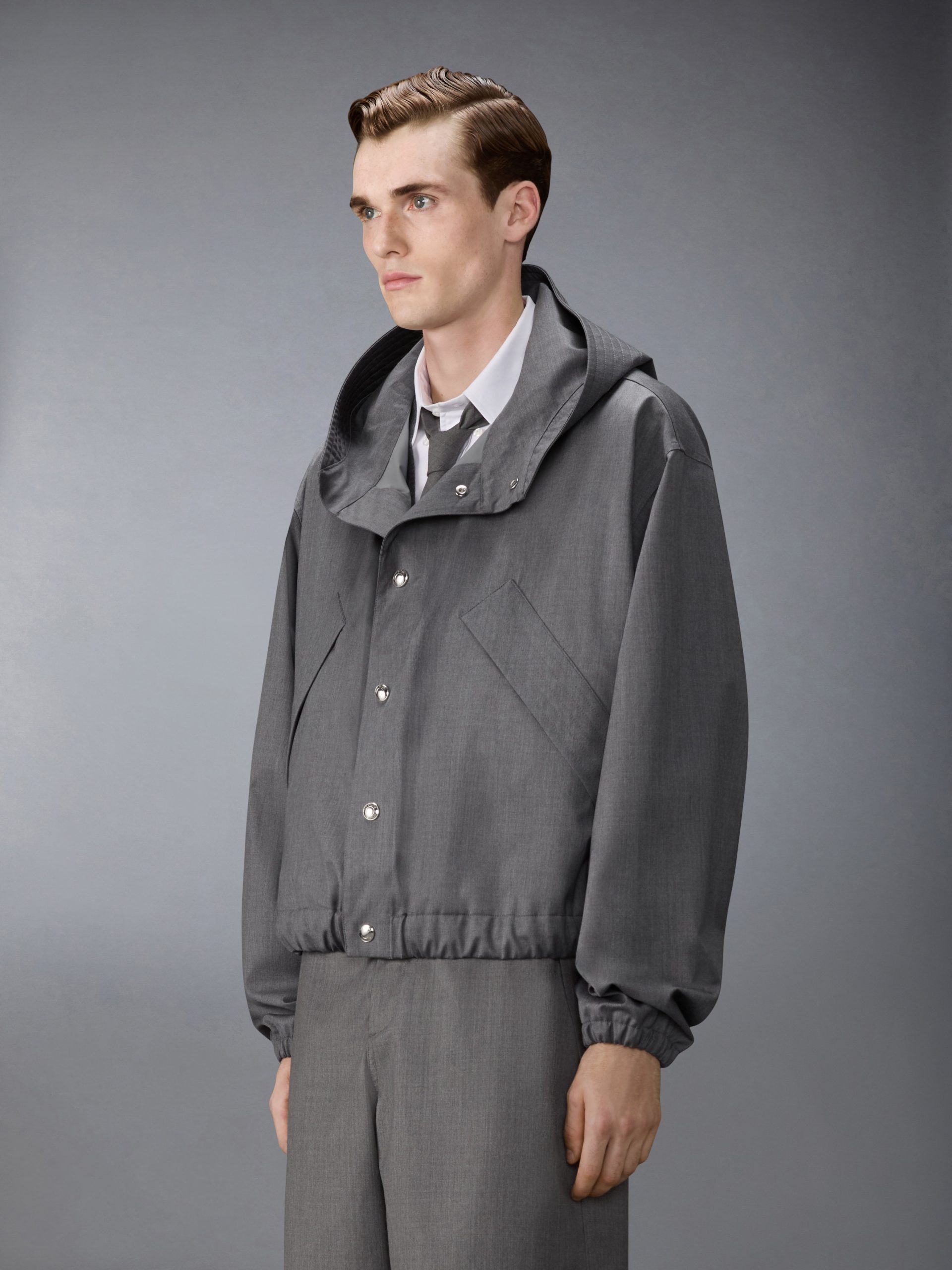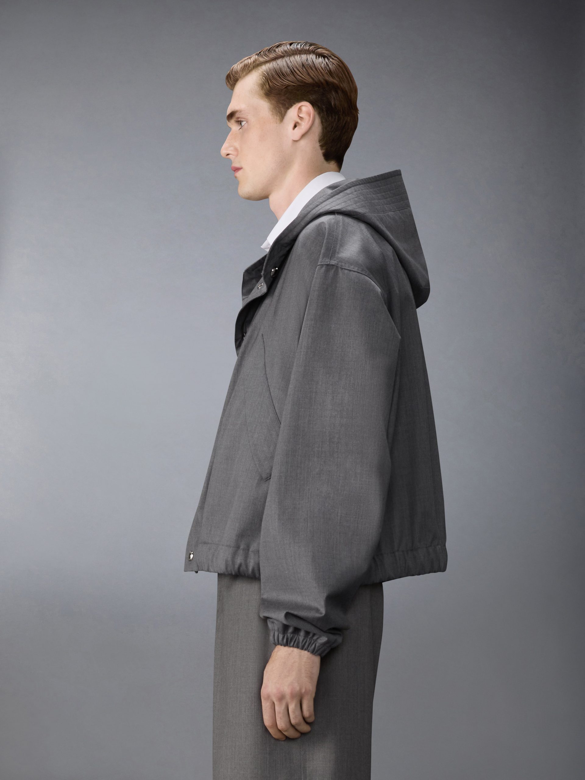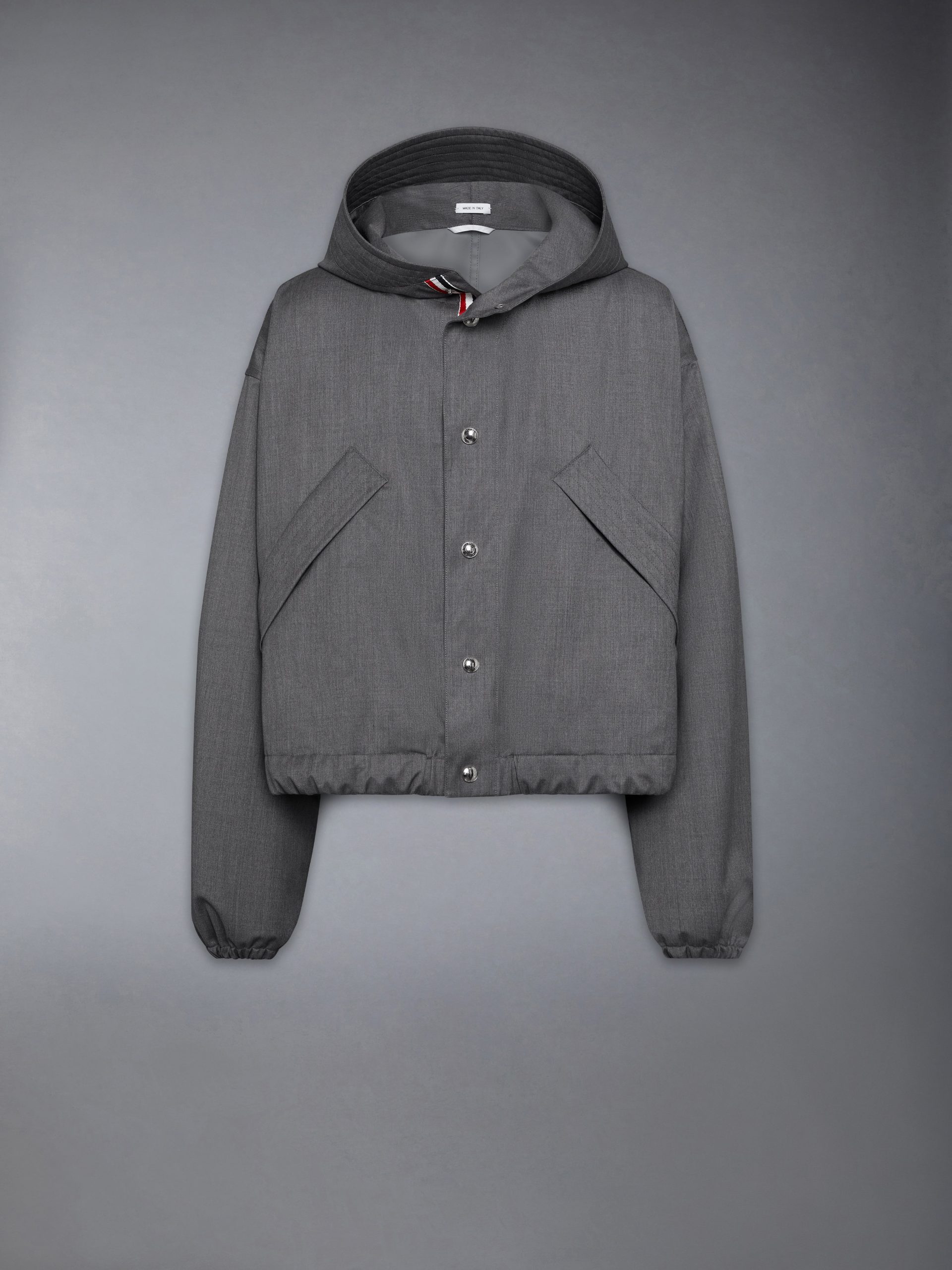 This cropped parka is crafted in 2-layer wool twill combining a cotton-faced exterior with a structured nylon back for light structure and subtle weather protection. Wear over a classic 4-bar cardigan to balance technical tailoring with casual polish.