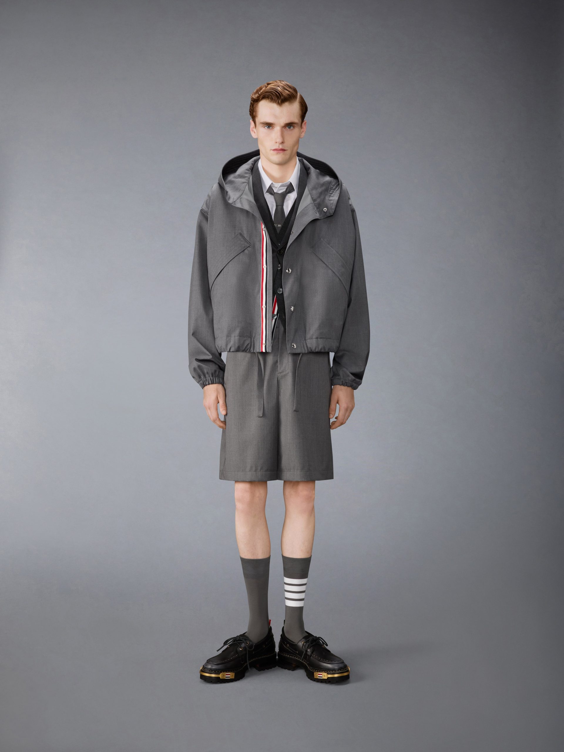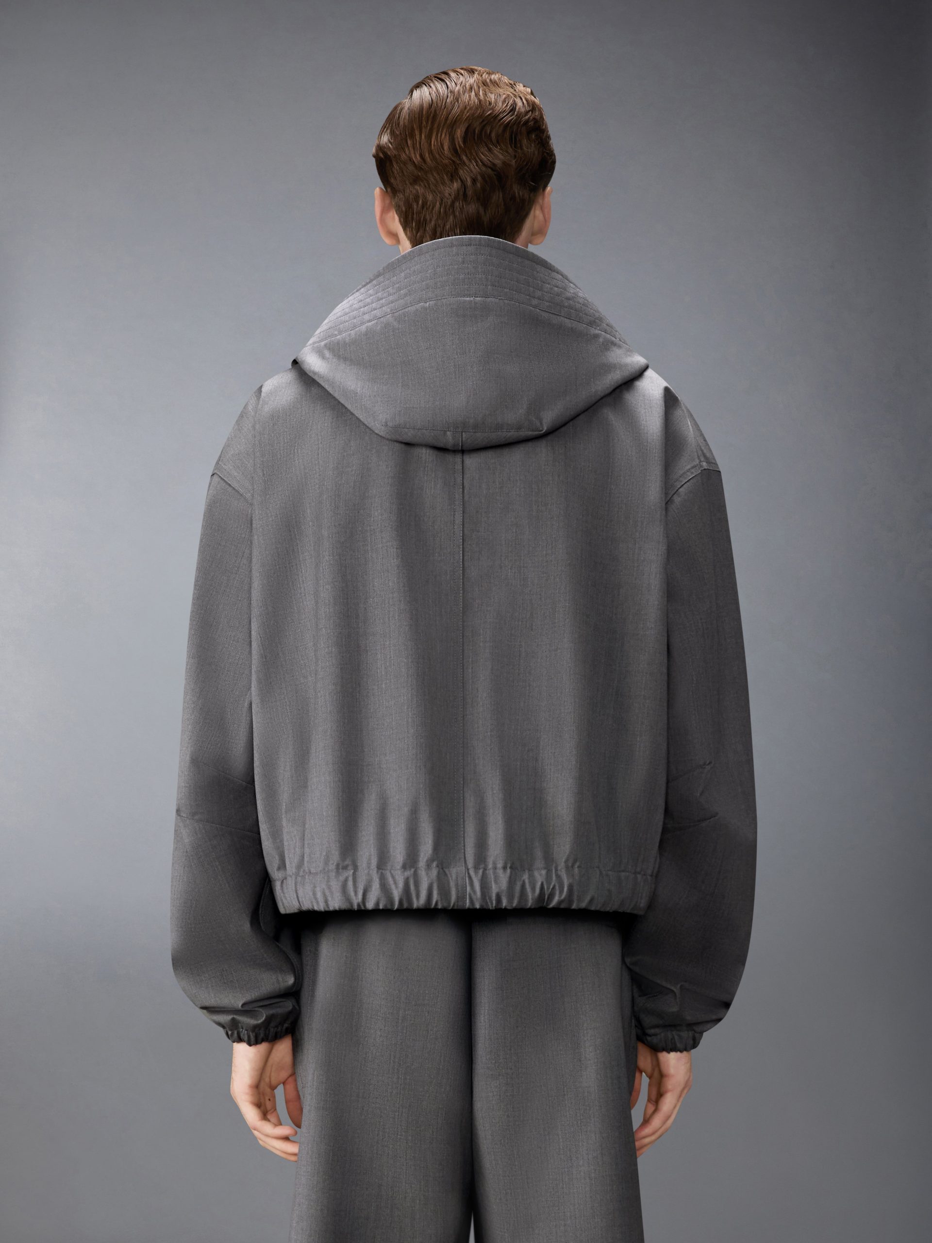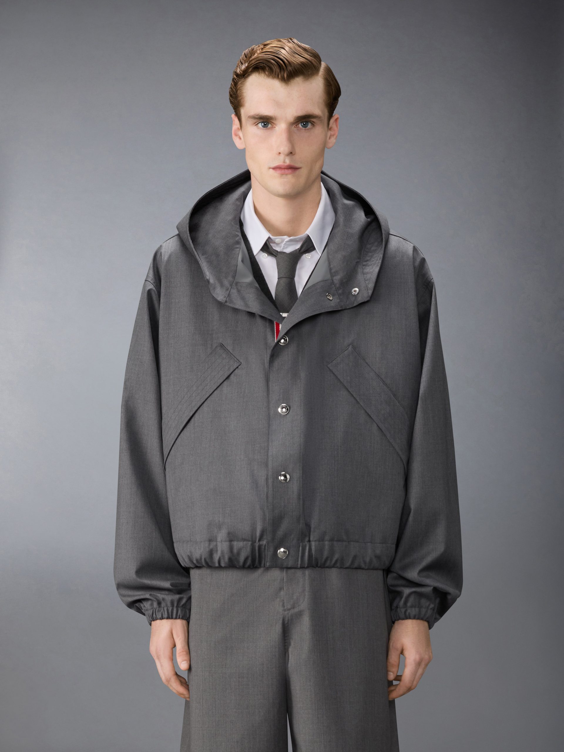 This cropped parka is crafted in 2-layer wool twill combining a cotton-faced exterior with a structured nylon back for light structure and subtle weather protection. Wear over a classic 4-bar cardigan to balance technical tailoring with casual polish.