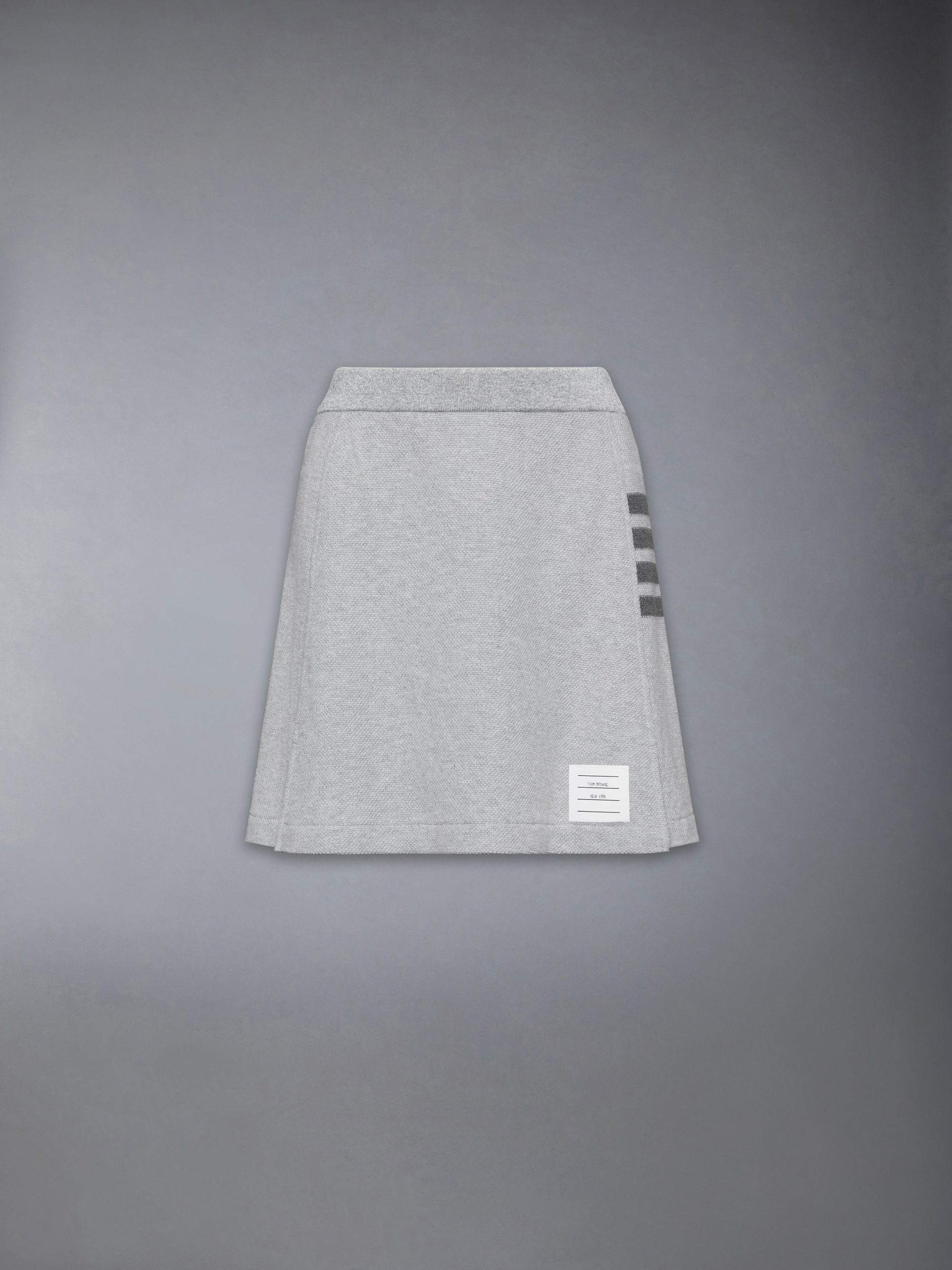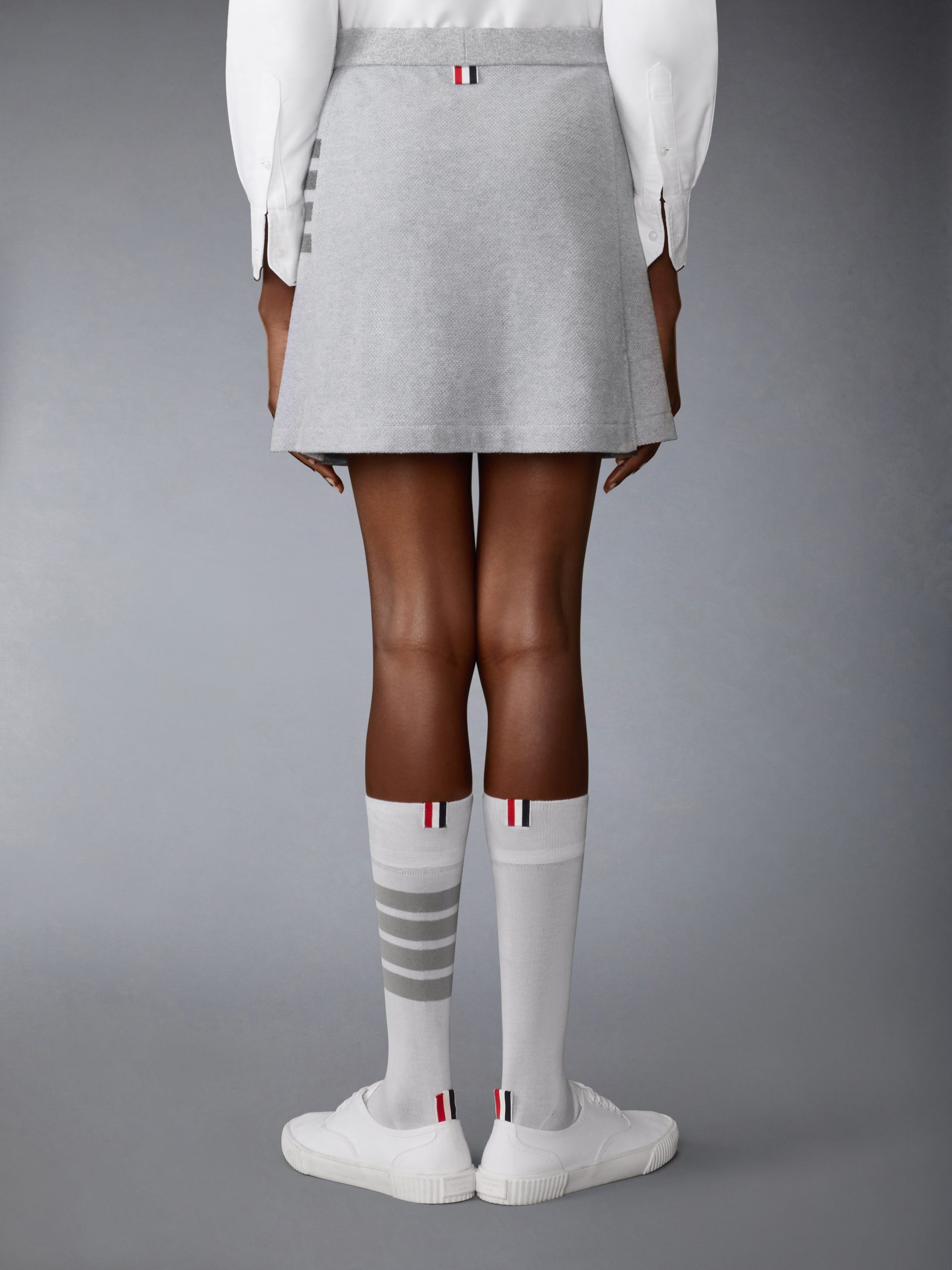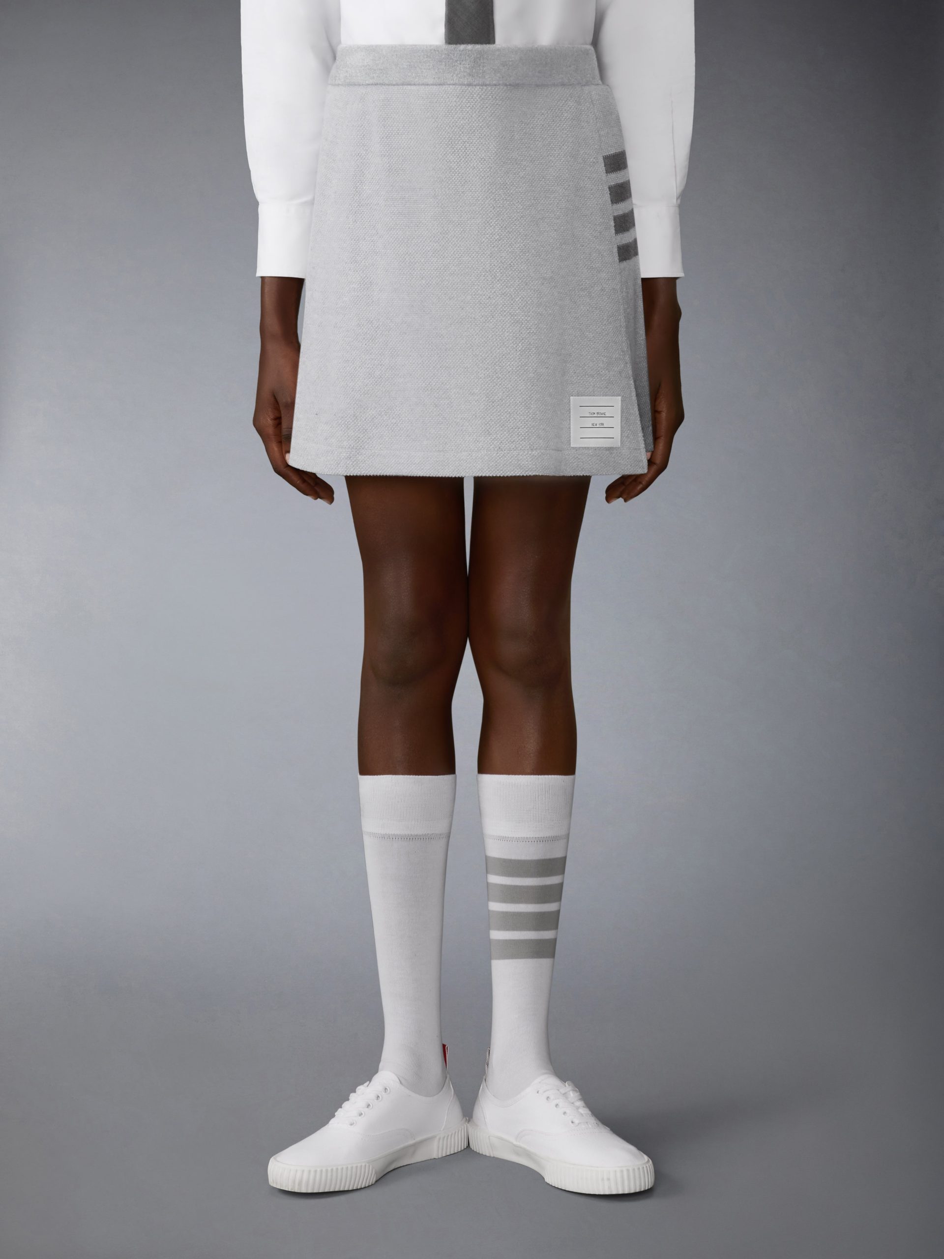 Rooted in uniform tradition. this mini skirt refines a classic silhouette through the Thom Browne lens. Defined by structured box pleats and signature 4-bar detailing. it brings a sense of order to everyday dressing—disciplined. direct. and unmistakably part of the vocabulary.