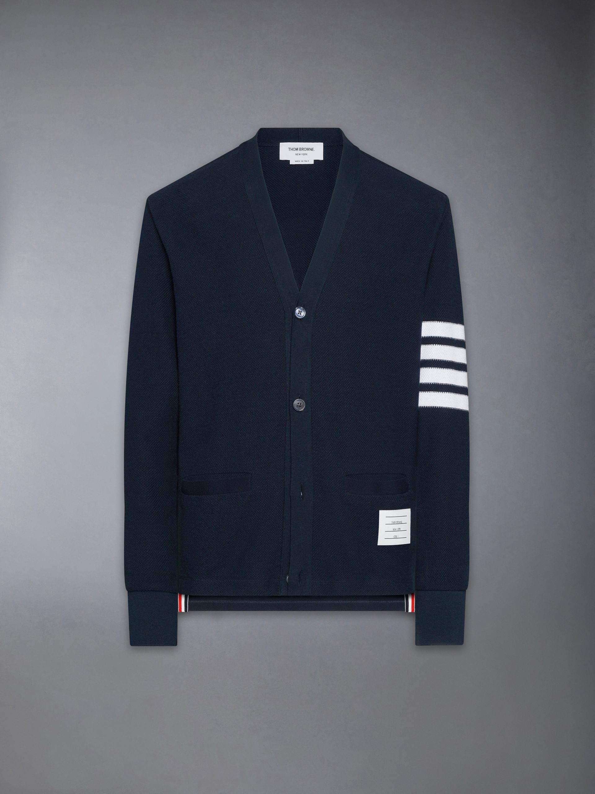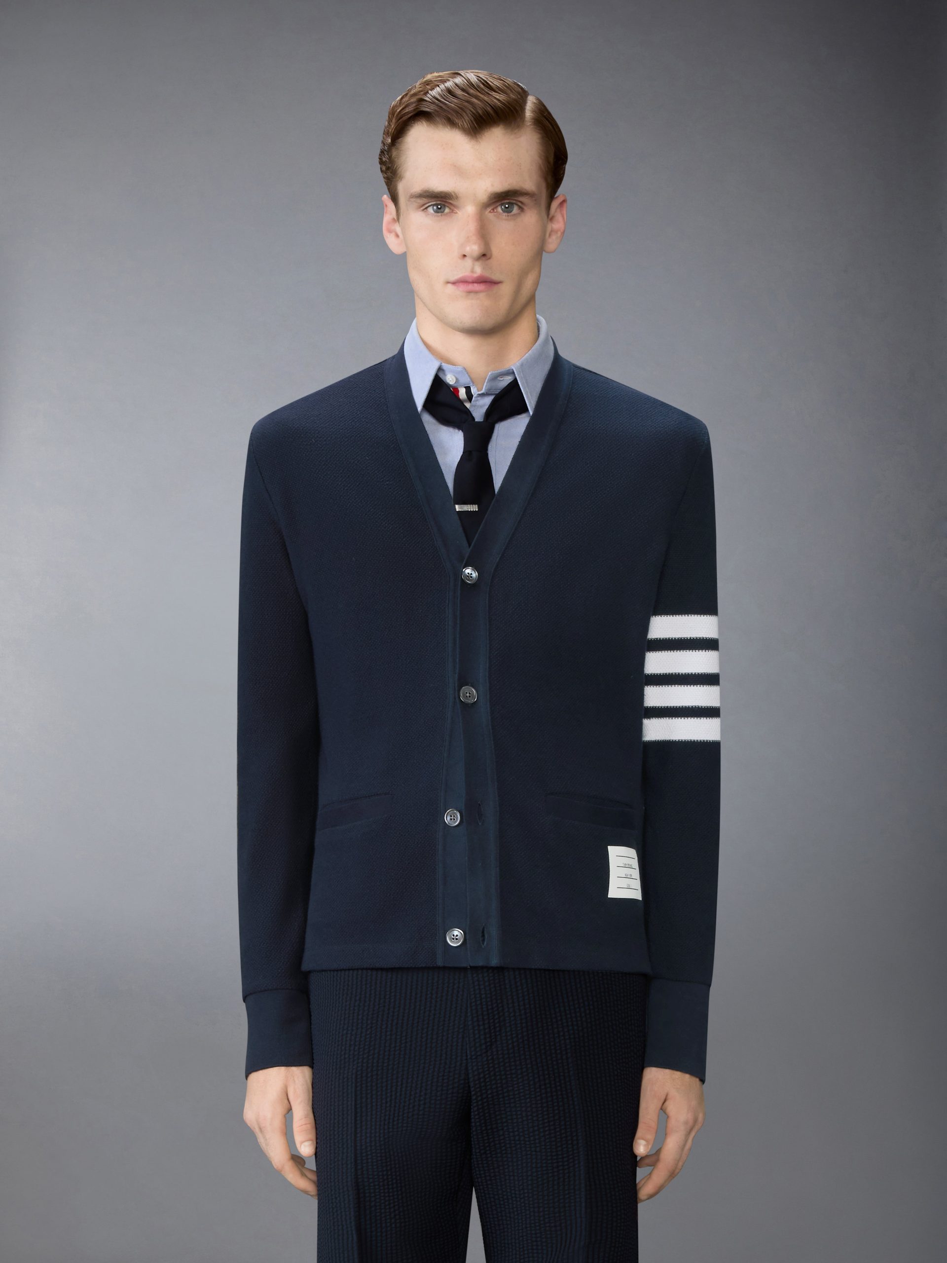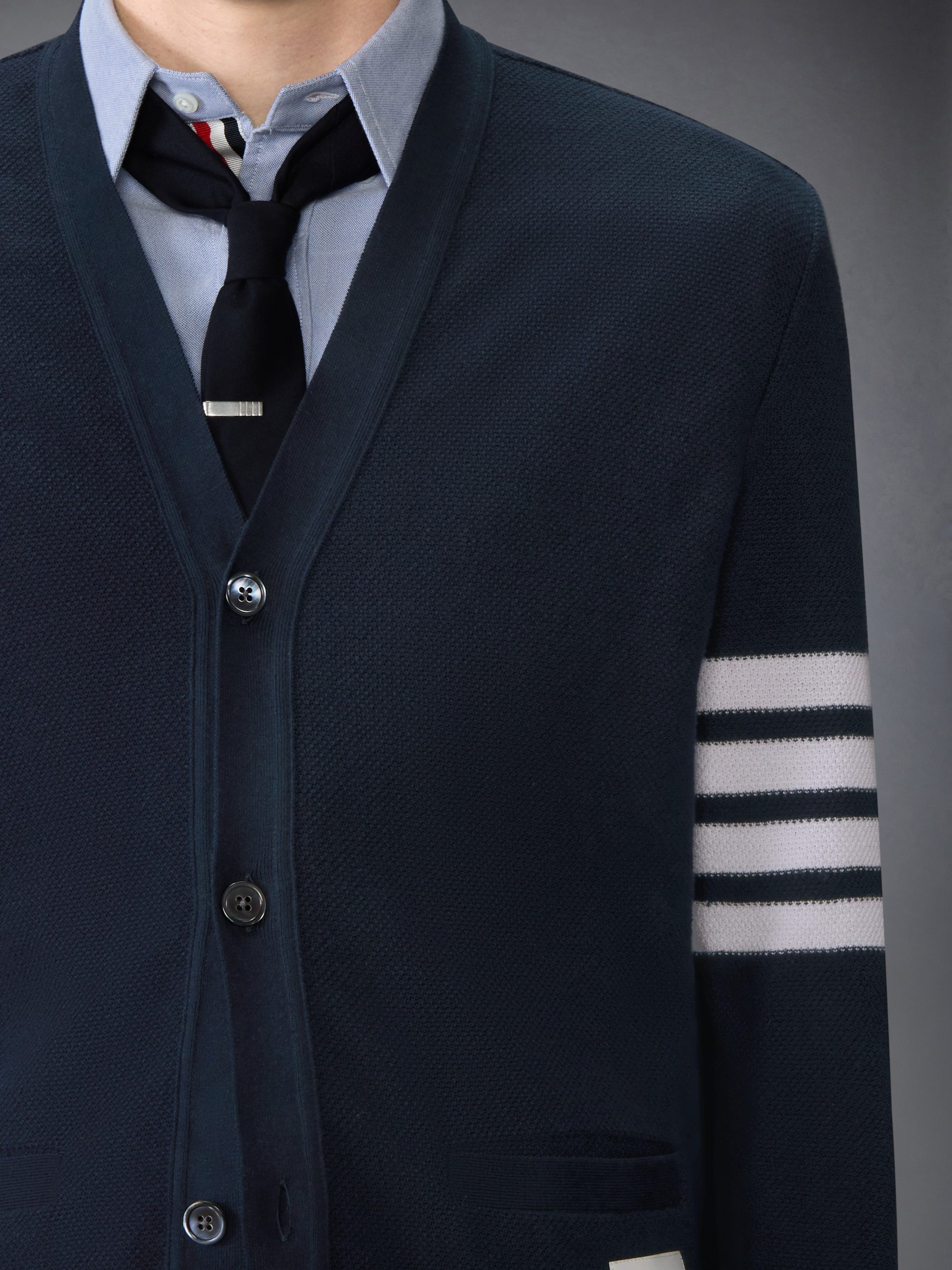 This cardigan is knit in textured cotton piqu??. offering a breathable structure and a crisp. dimensional surface. Finished with engineered 4-bar detailing. it reinterprets a signature layer through the Thom Browne lens. Style with a classic oxford shirt and striped tie to underscore its collegiate roots.