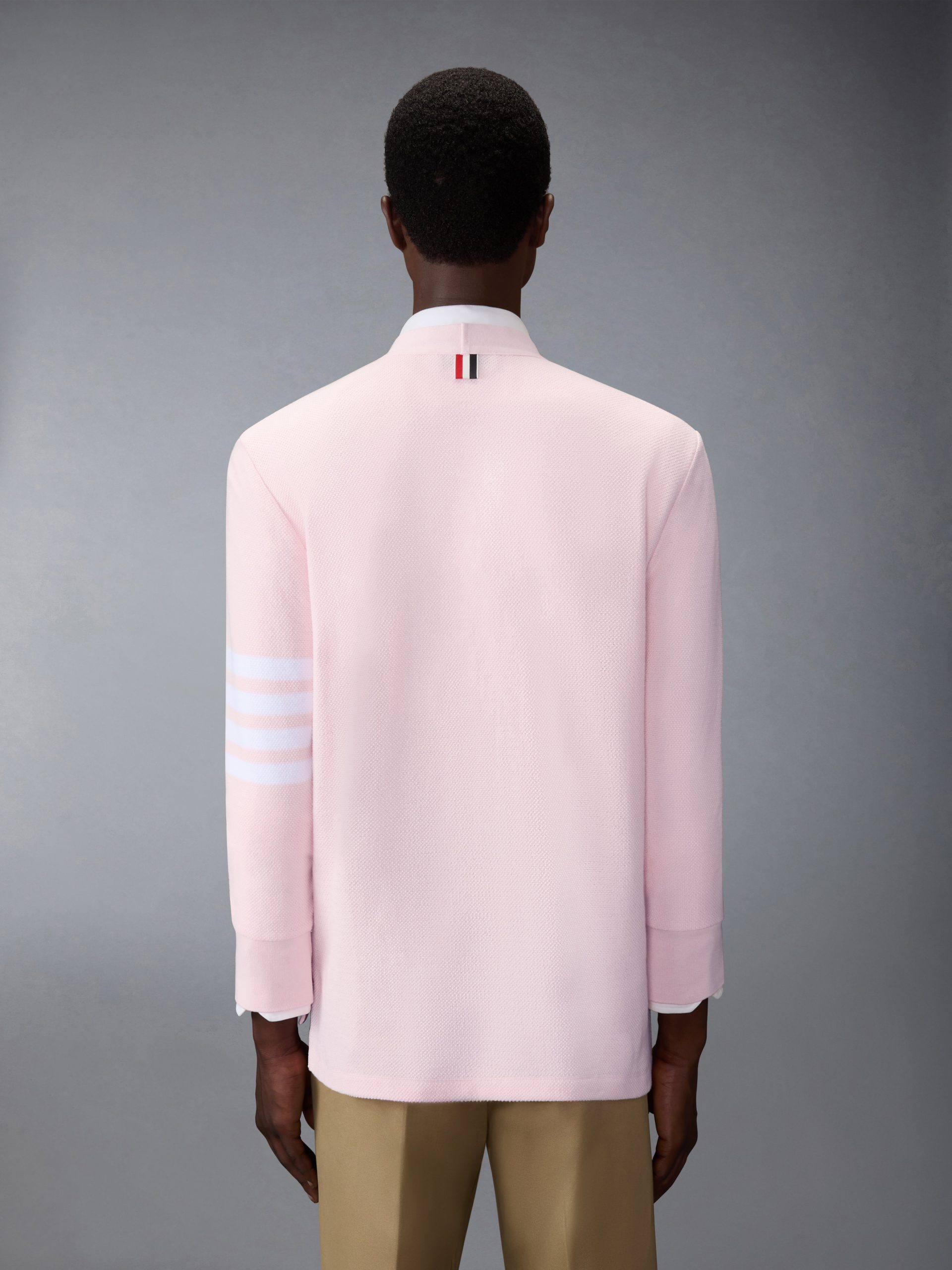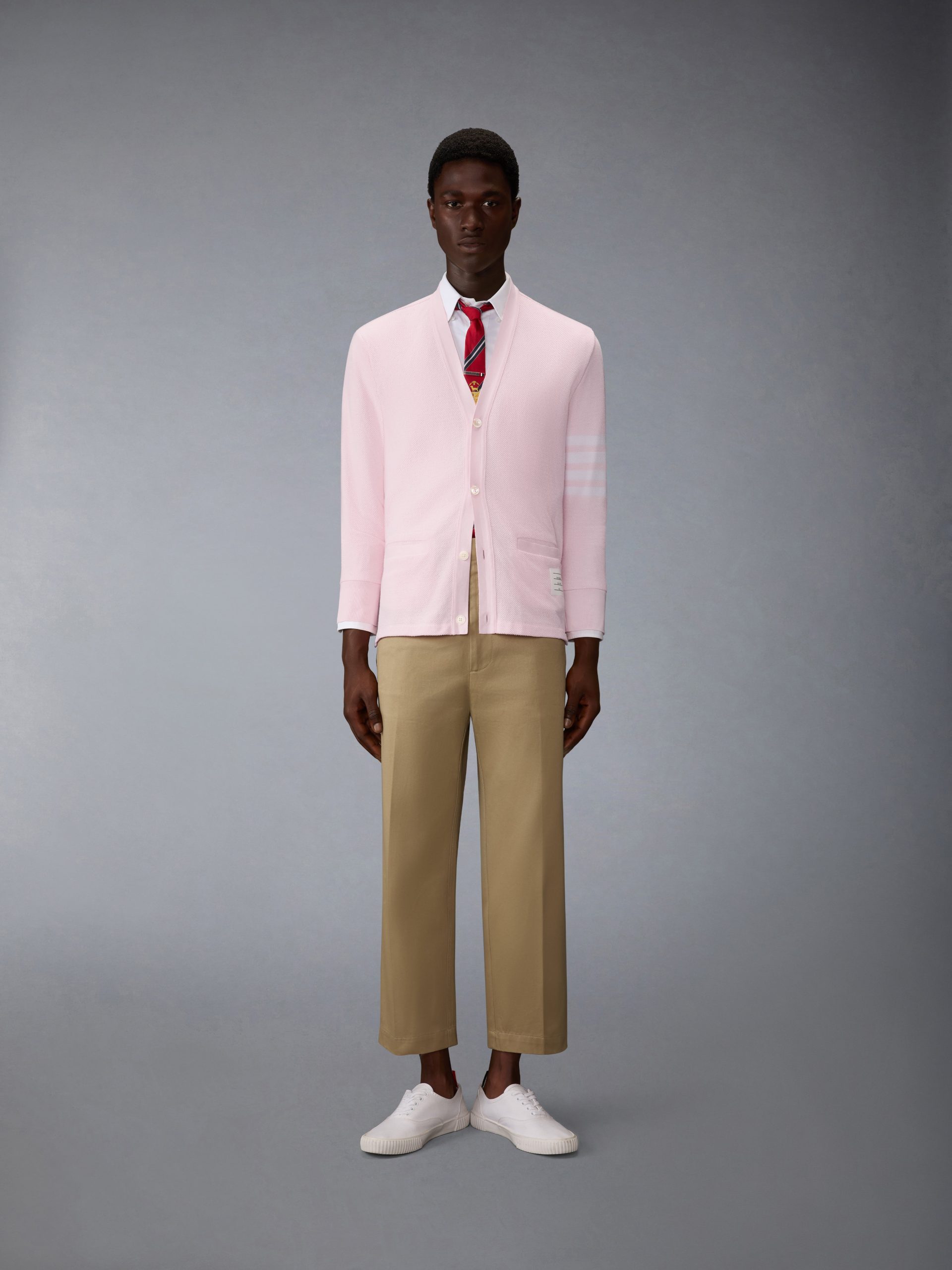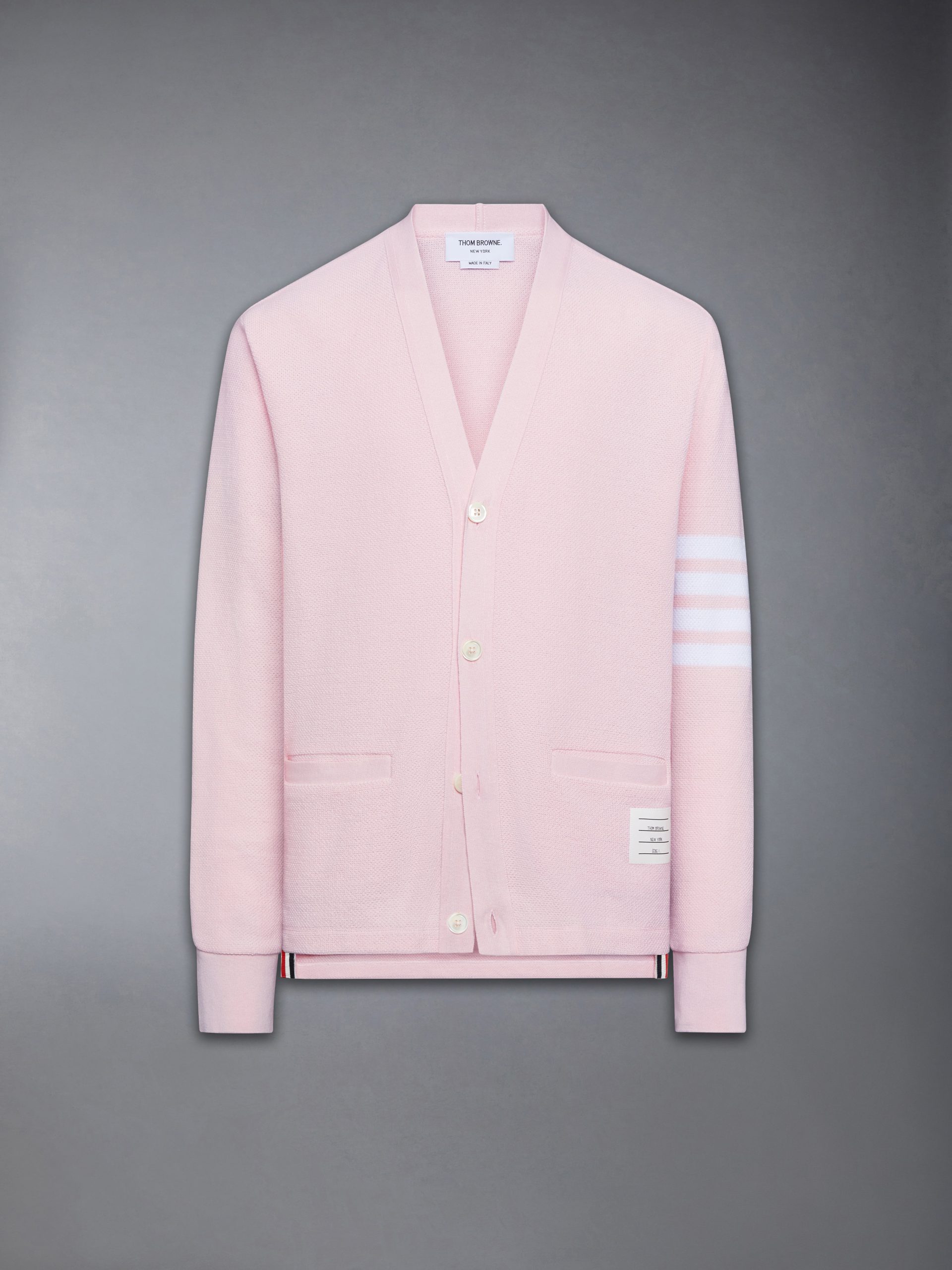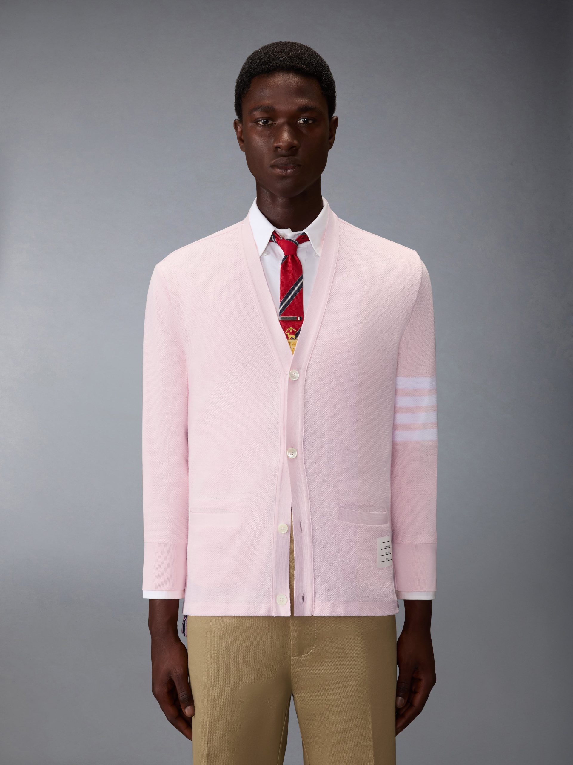 This cardigan is knit in textured cotton piqu??. offering a breathable structure and a crisp. dimensional surface. Finished with engineered 4-bar detailing. it reinterprets a signature layer through the Thom Browne lens. Style with a classic oxford shirt and striped tie to underscore its collegiate roots.