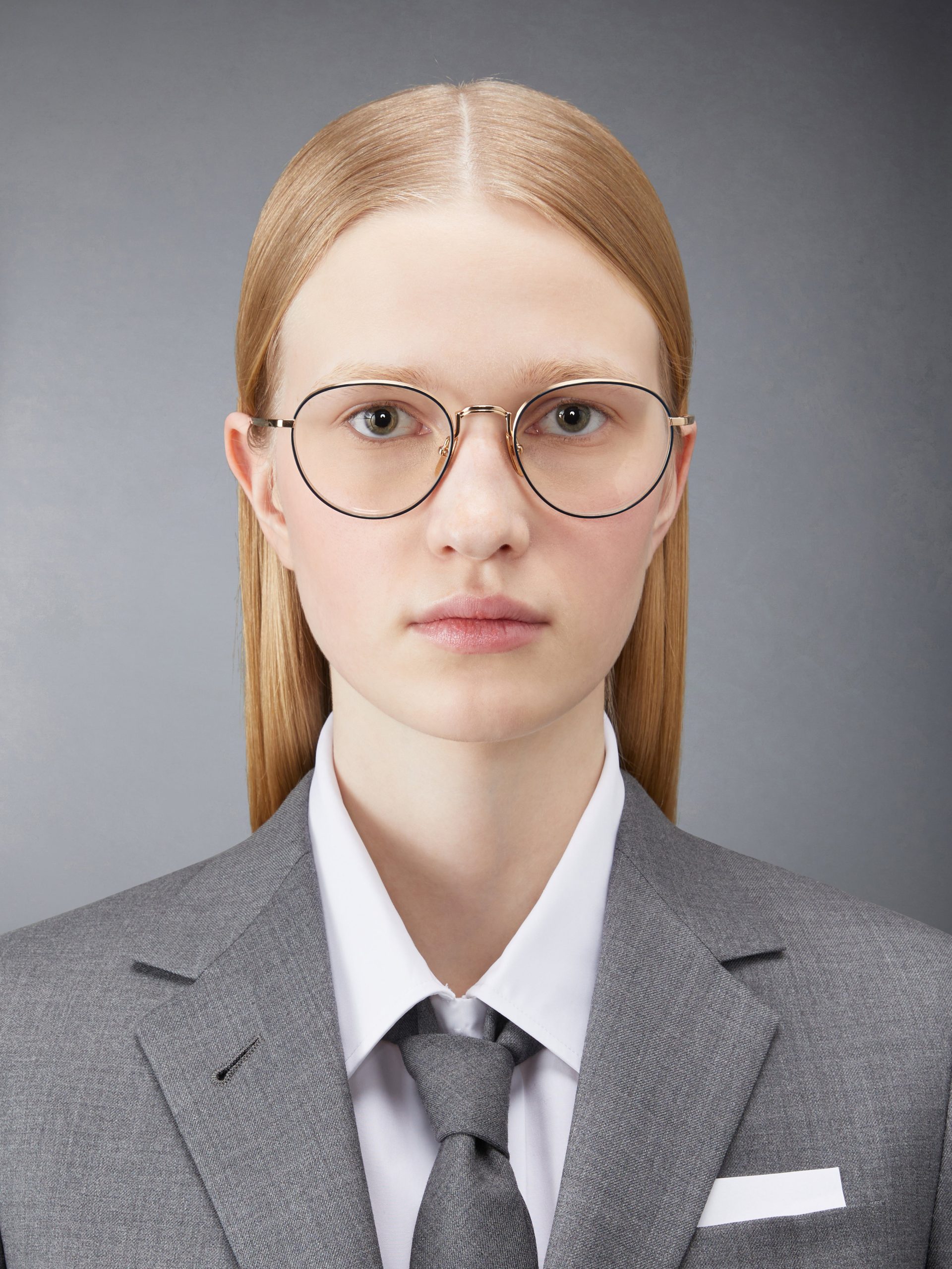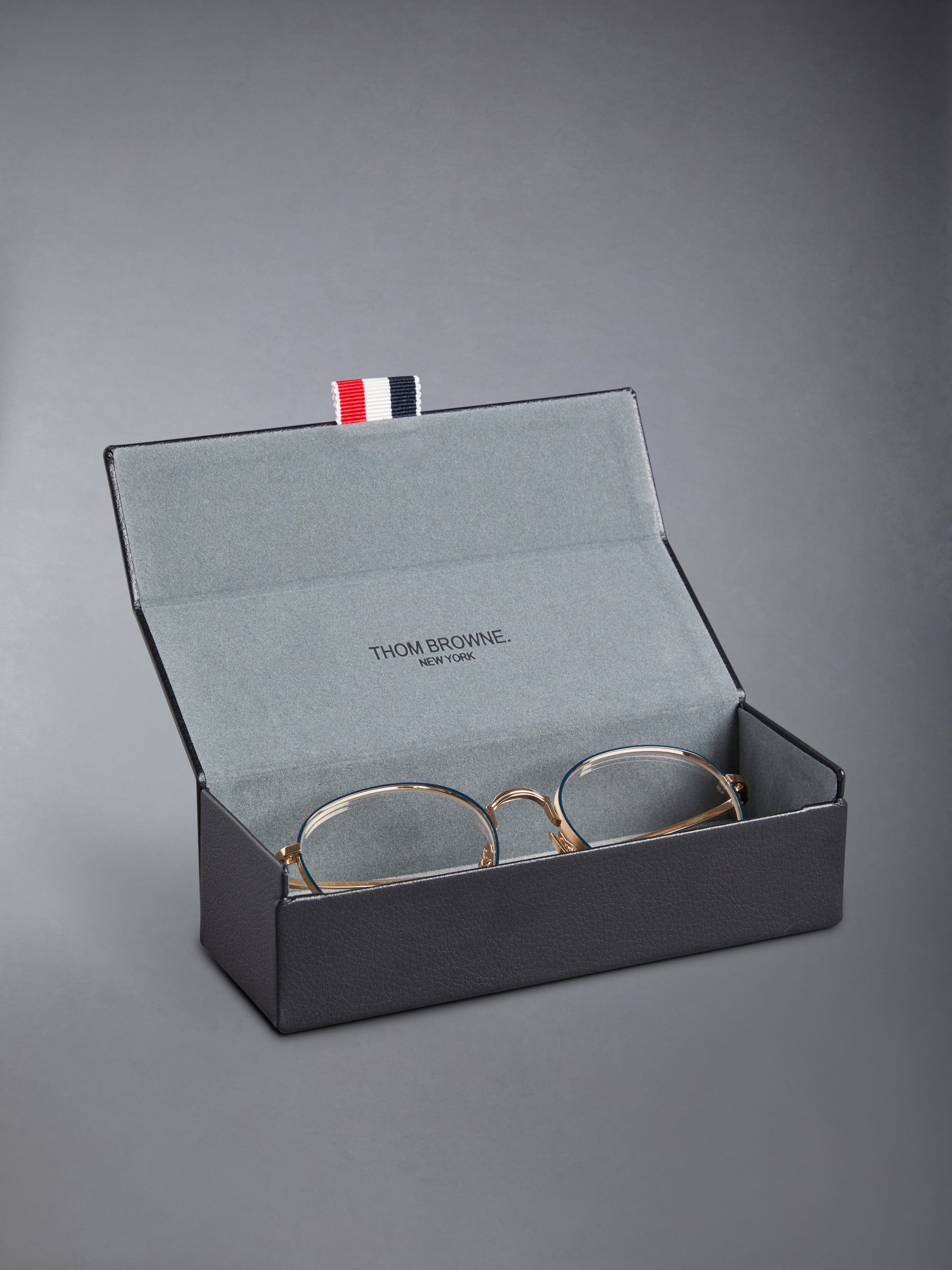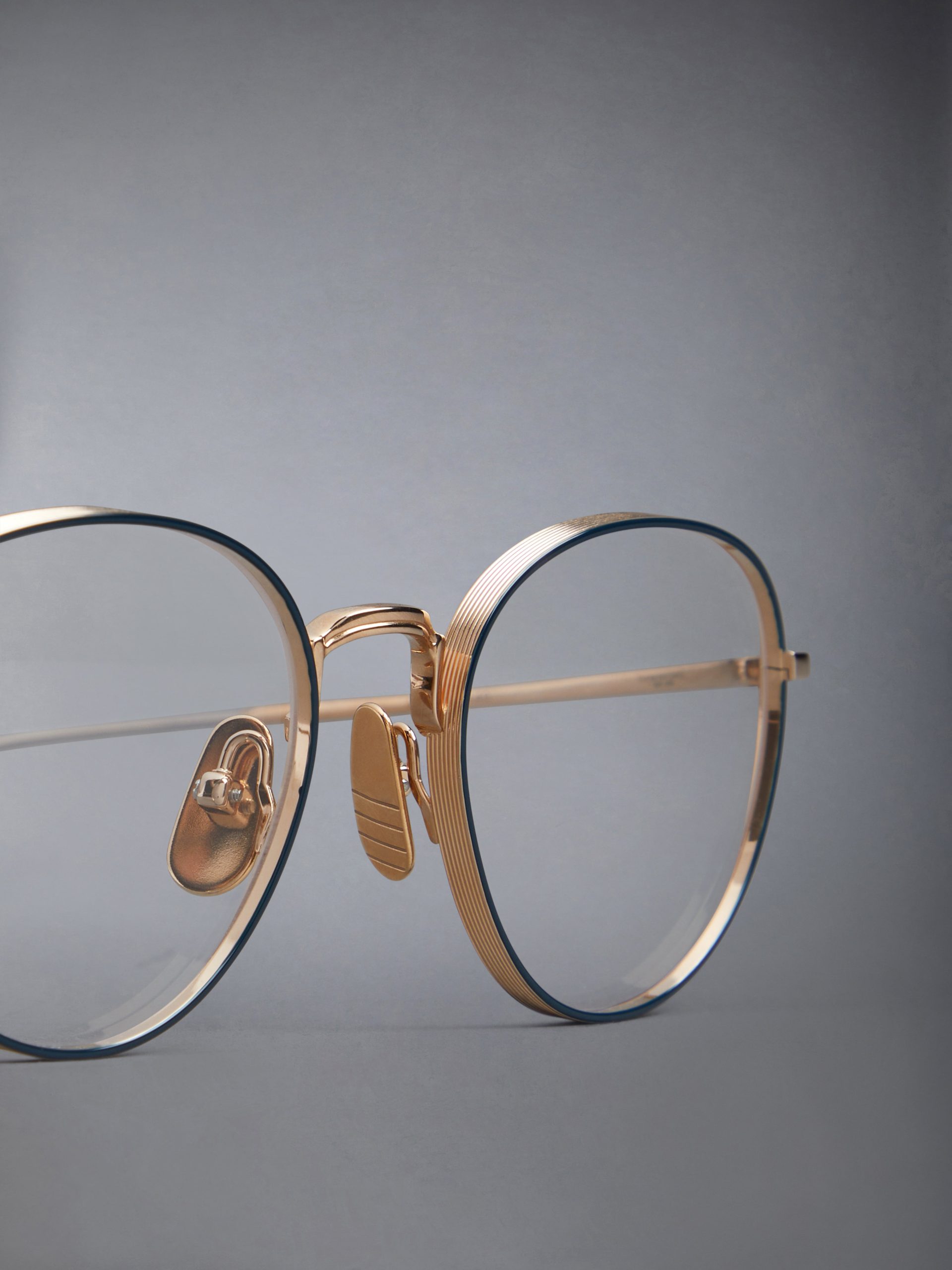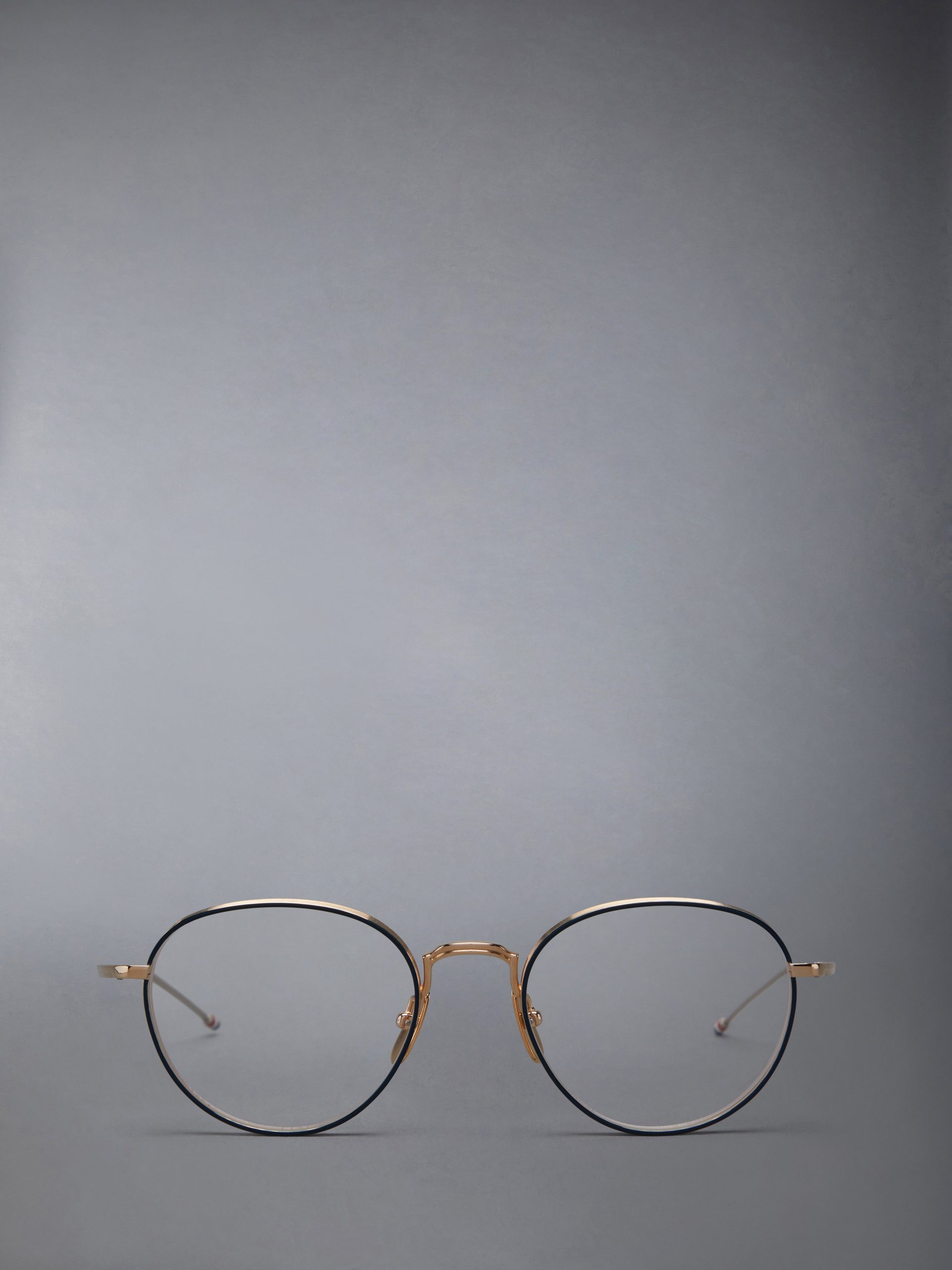 Round eyeglasses in gold tone titanium with navy acetate frame edge details. Textured nose bridge and frame. gold tone nose pads and temples with striped enamel detail. Leather case with signature striped grosgrain loop tab at entry.