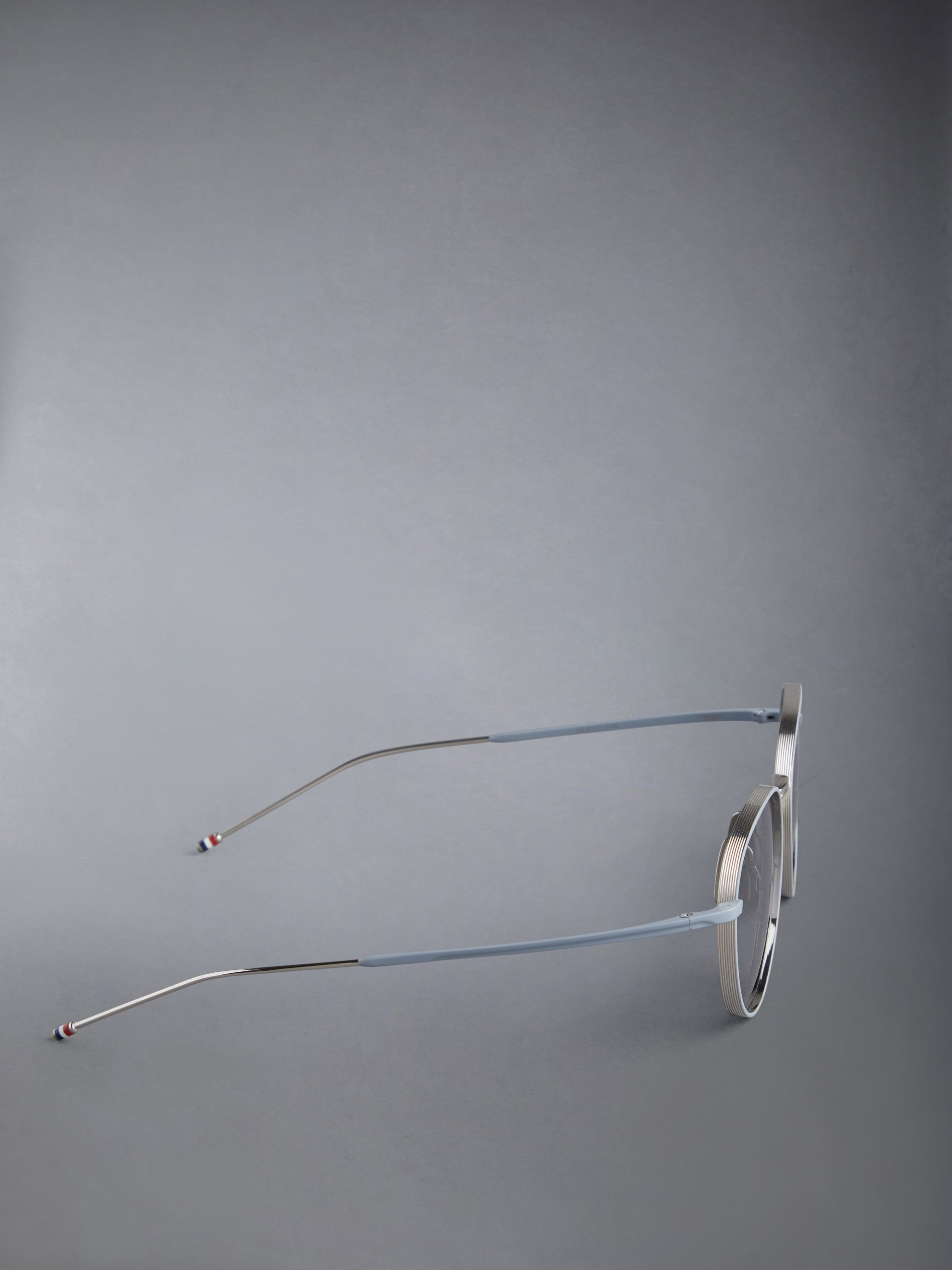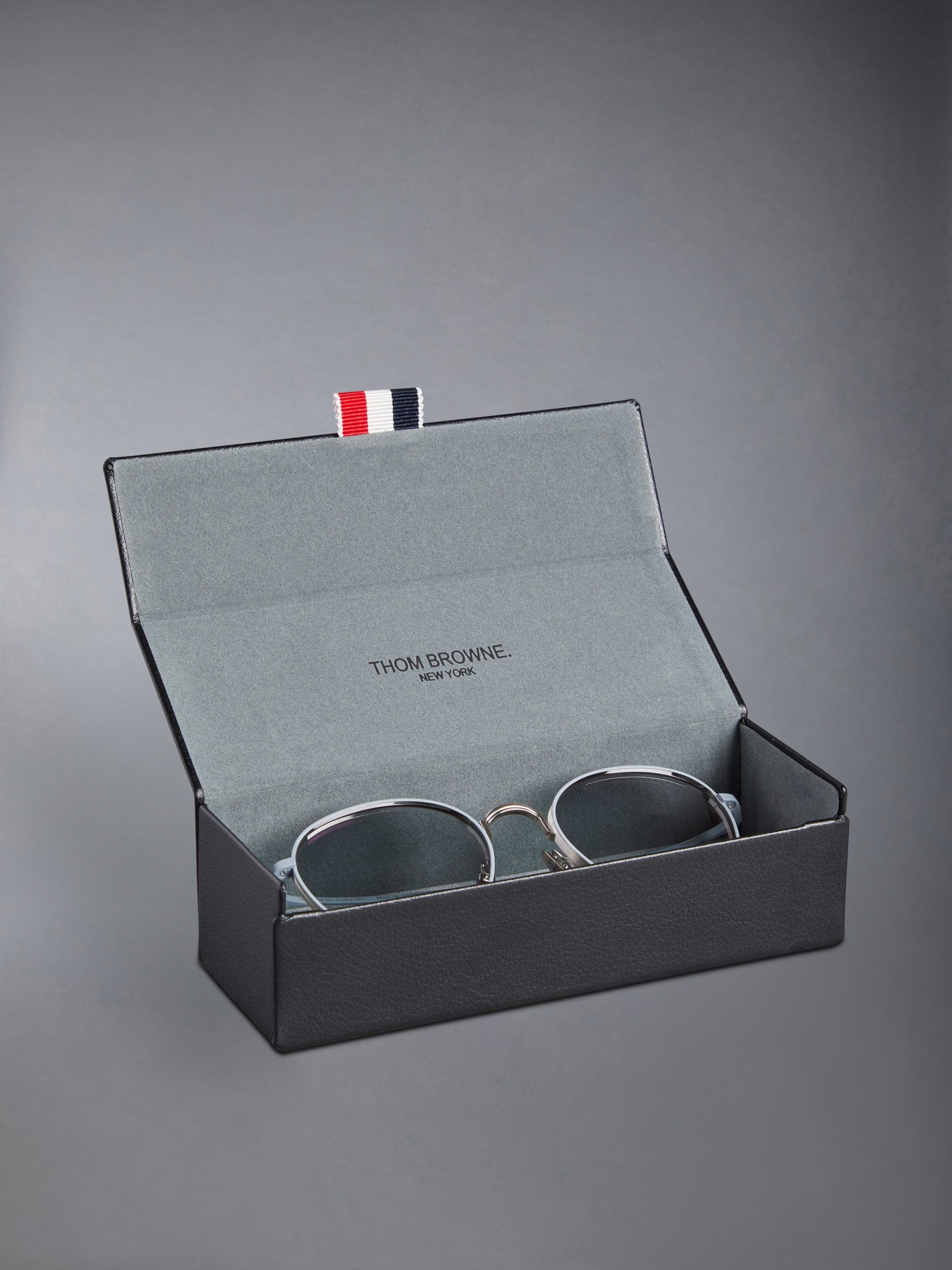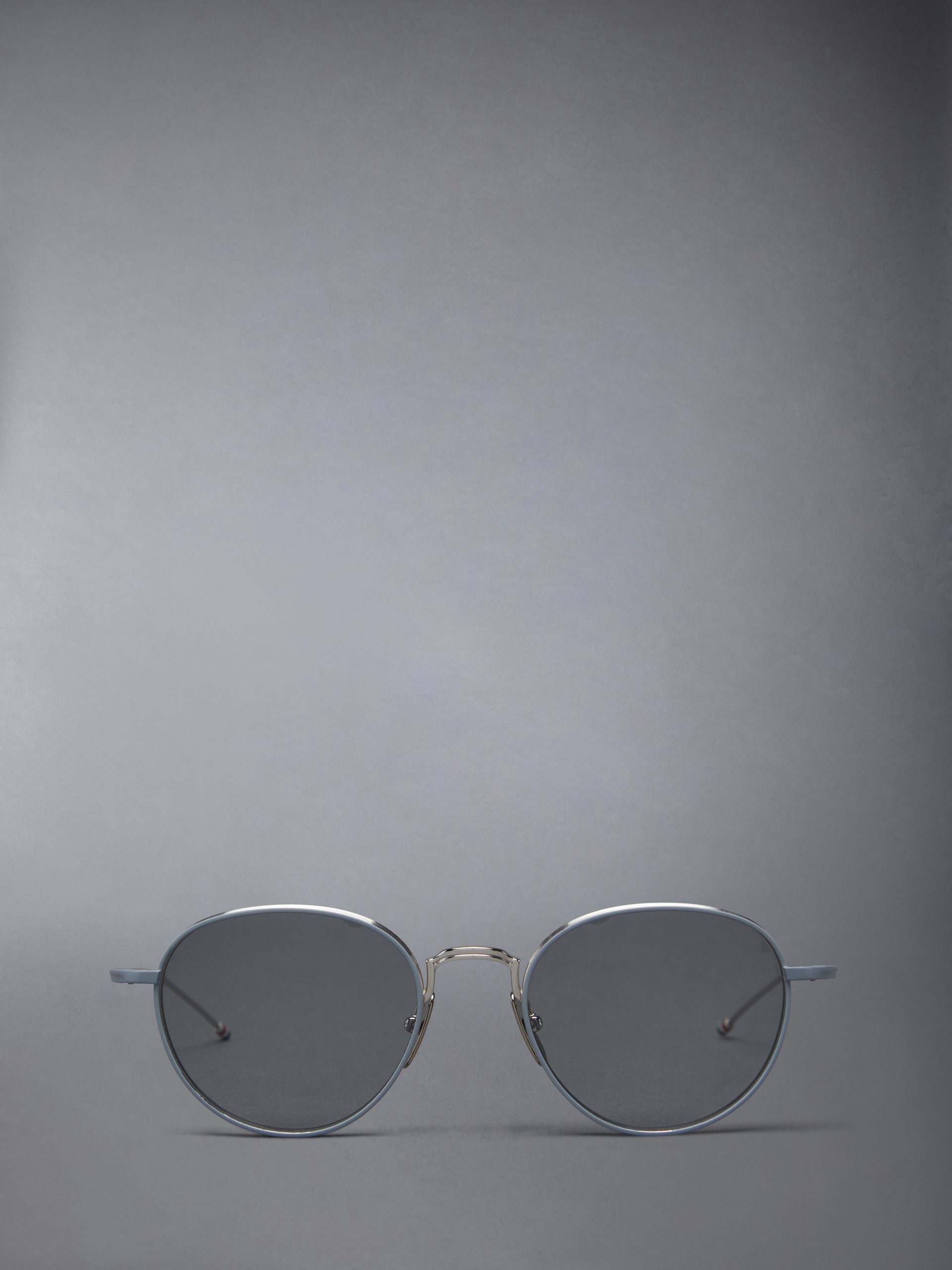 Round sunglasses in titanium with grey tinted lenses and light blue acetate temples. Textured nose bridge. titanium frame and nose pads. striped enamel temple tips. Eco-Leather case with signature striped grosgrain loop tab at entry.