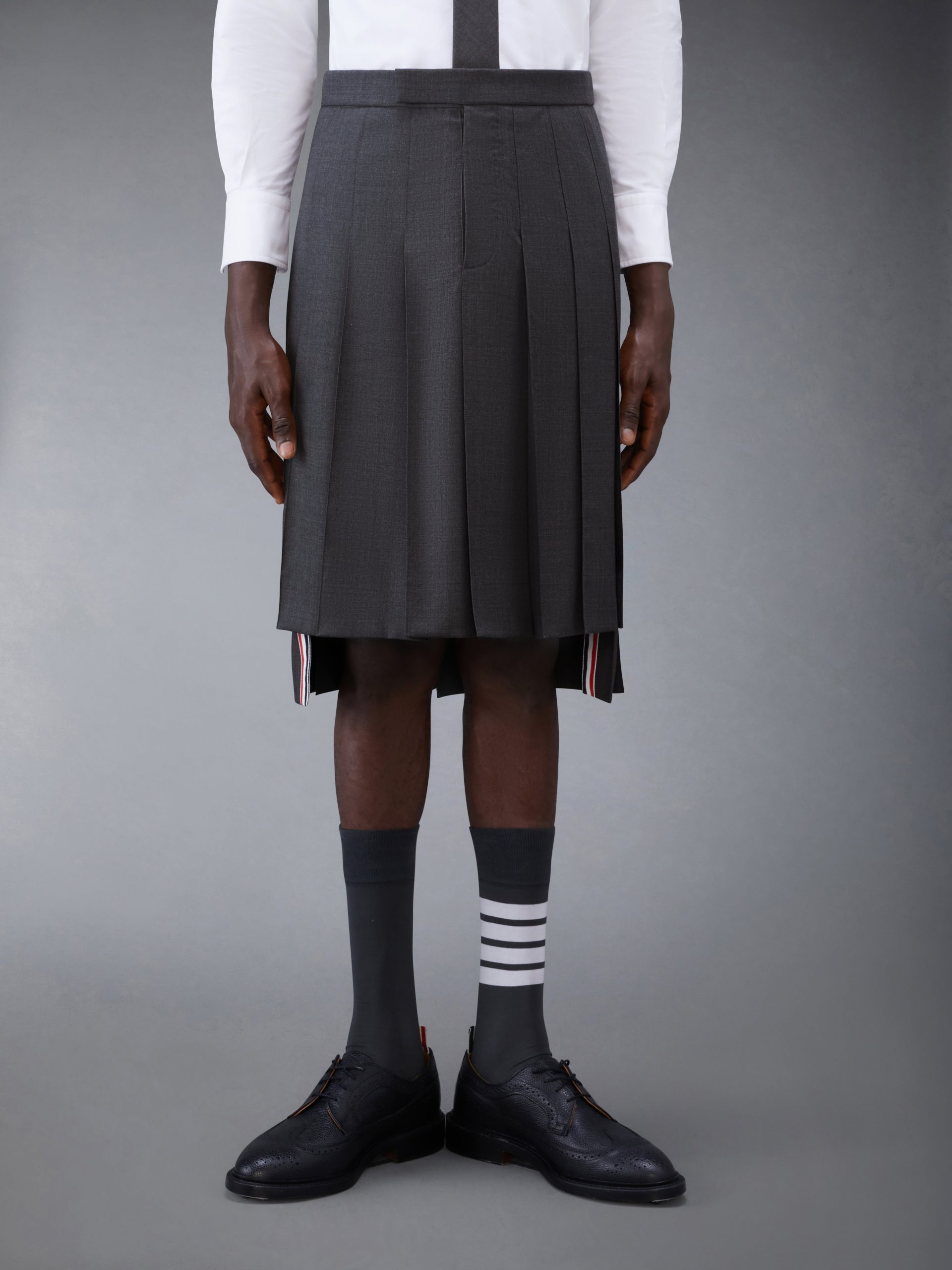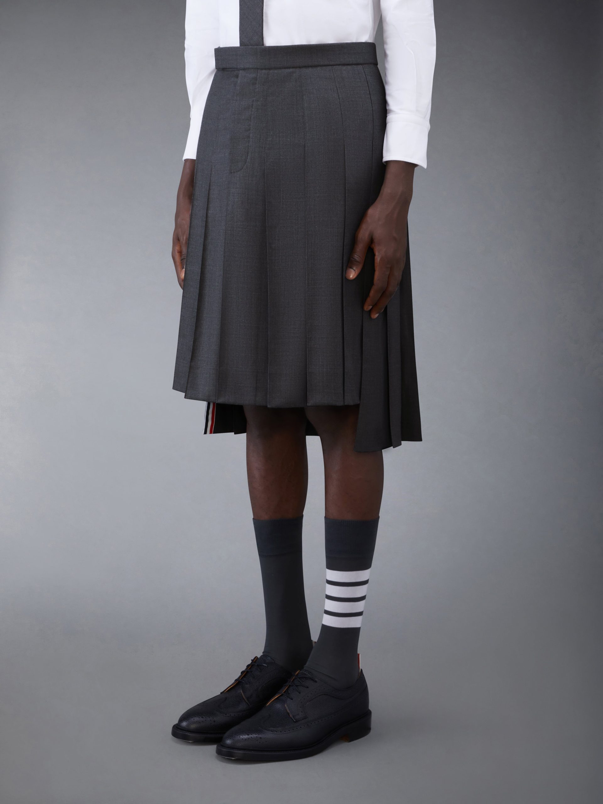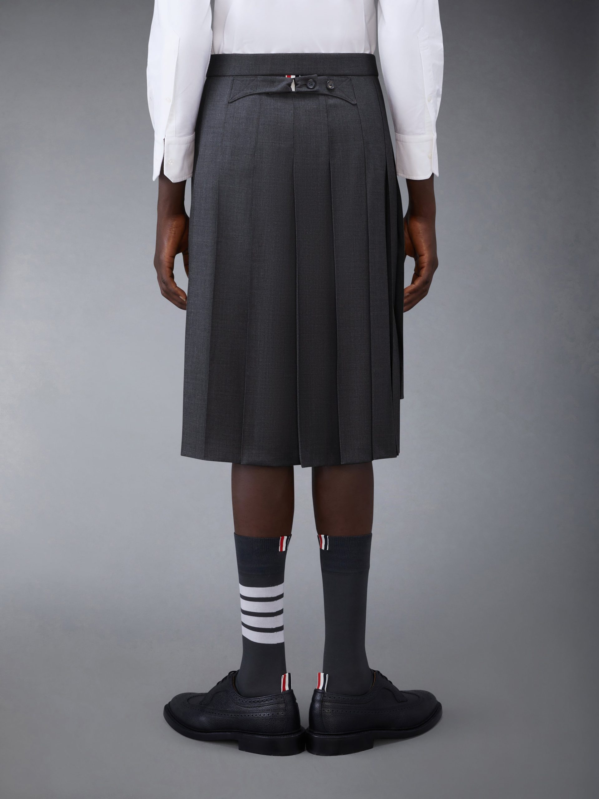 Inspired by East Coast preppy icons but reimagined with inventive proportions and quality craftsmanship. our Classic Rise Backstrap Knee Length Pleated Skirt is a fresh take on a traditional silhouette.
