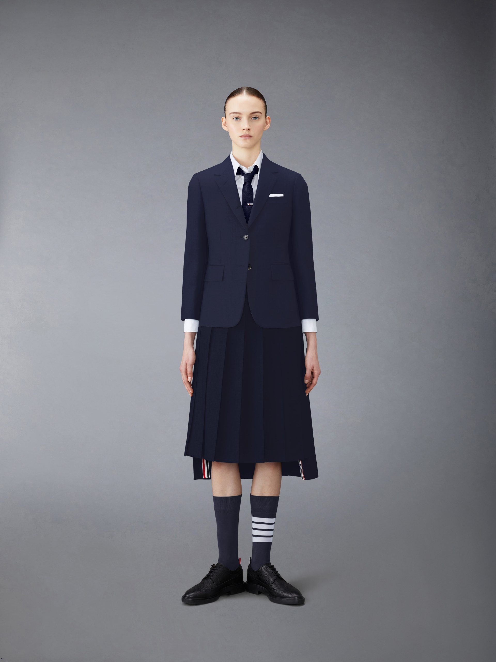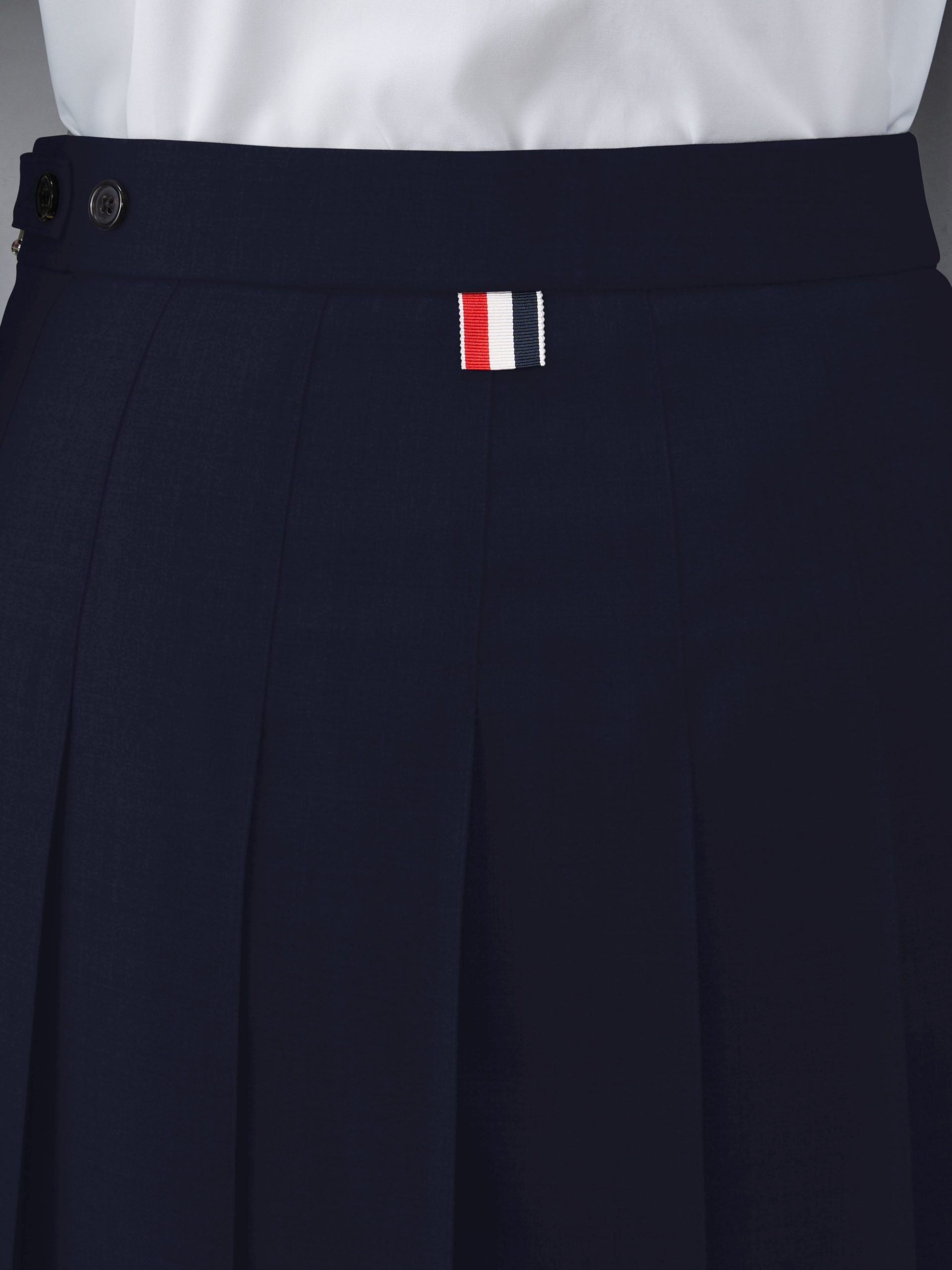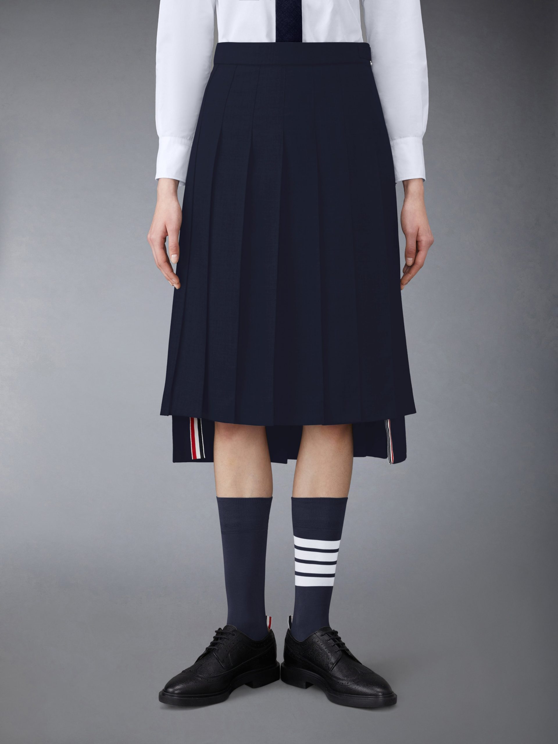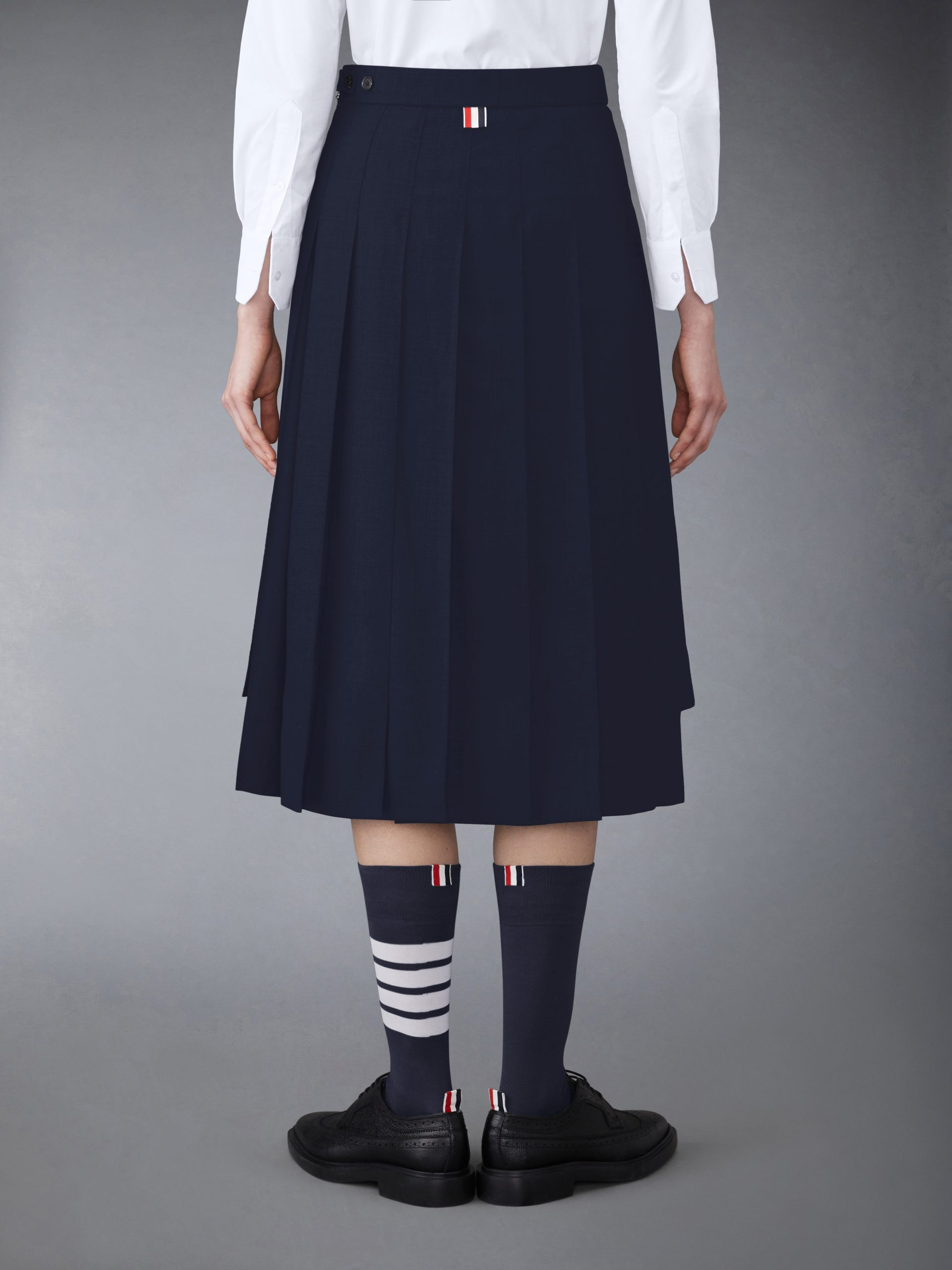 Inspired by East Coast preppy icons but reimagined with inventive proportions and quality craftsmanship. our Classic Dropped Back Below Knee Pleated Skirt is a fresh take on a traditional silhouette.