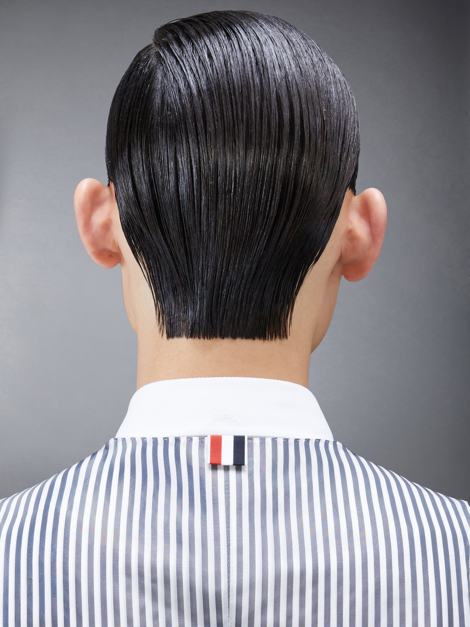 Signature striped grosgrain loop tab at back of neck
