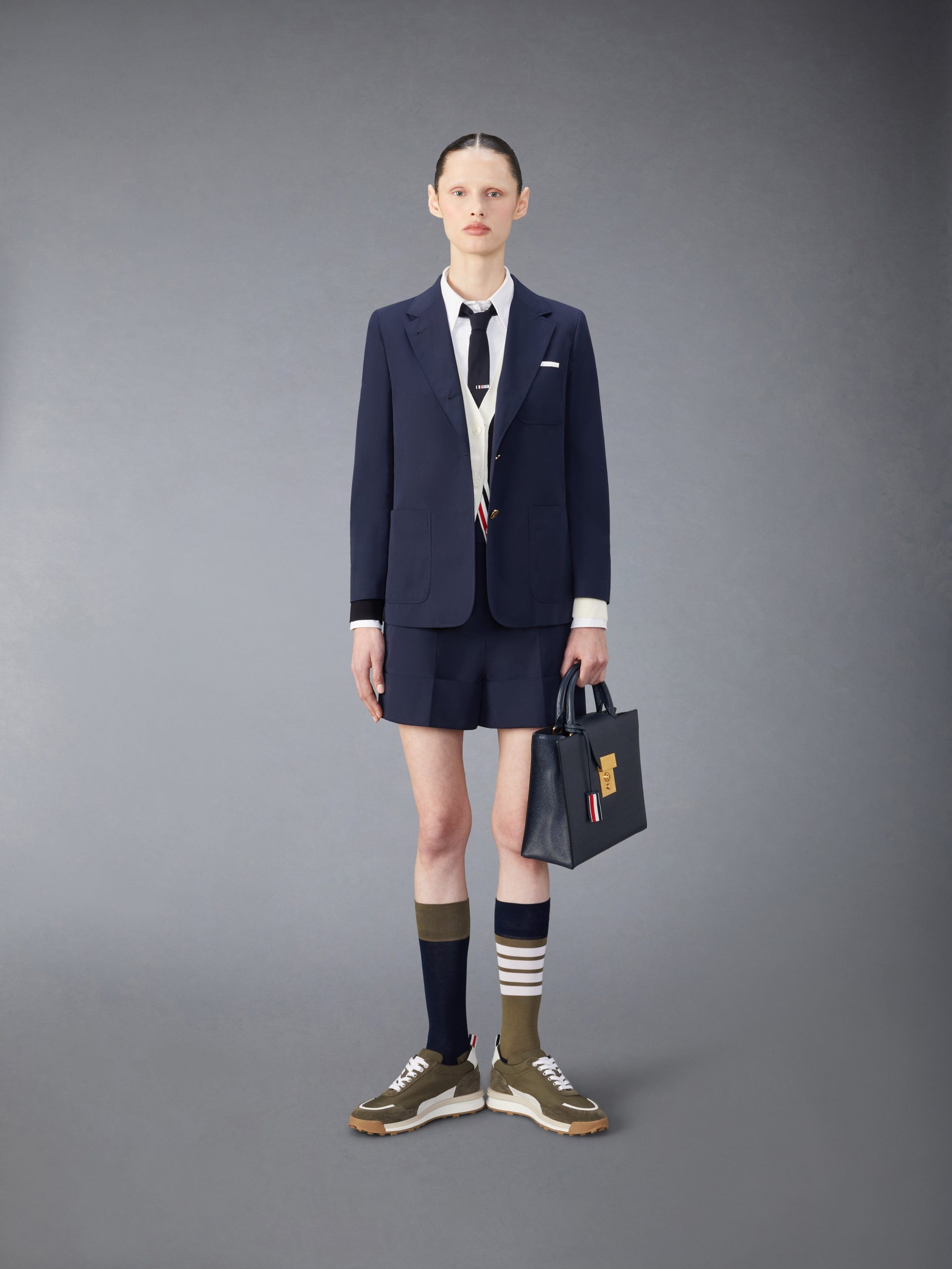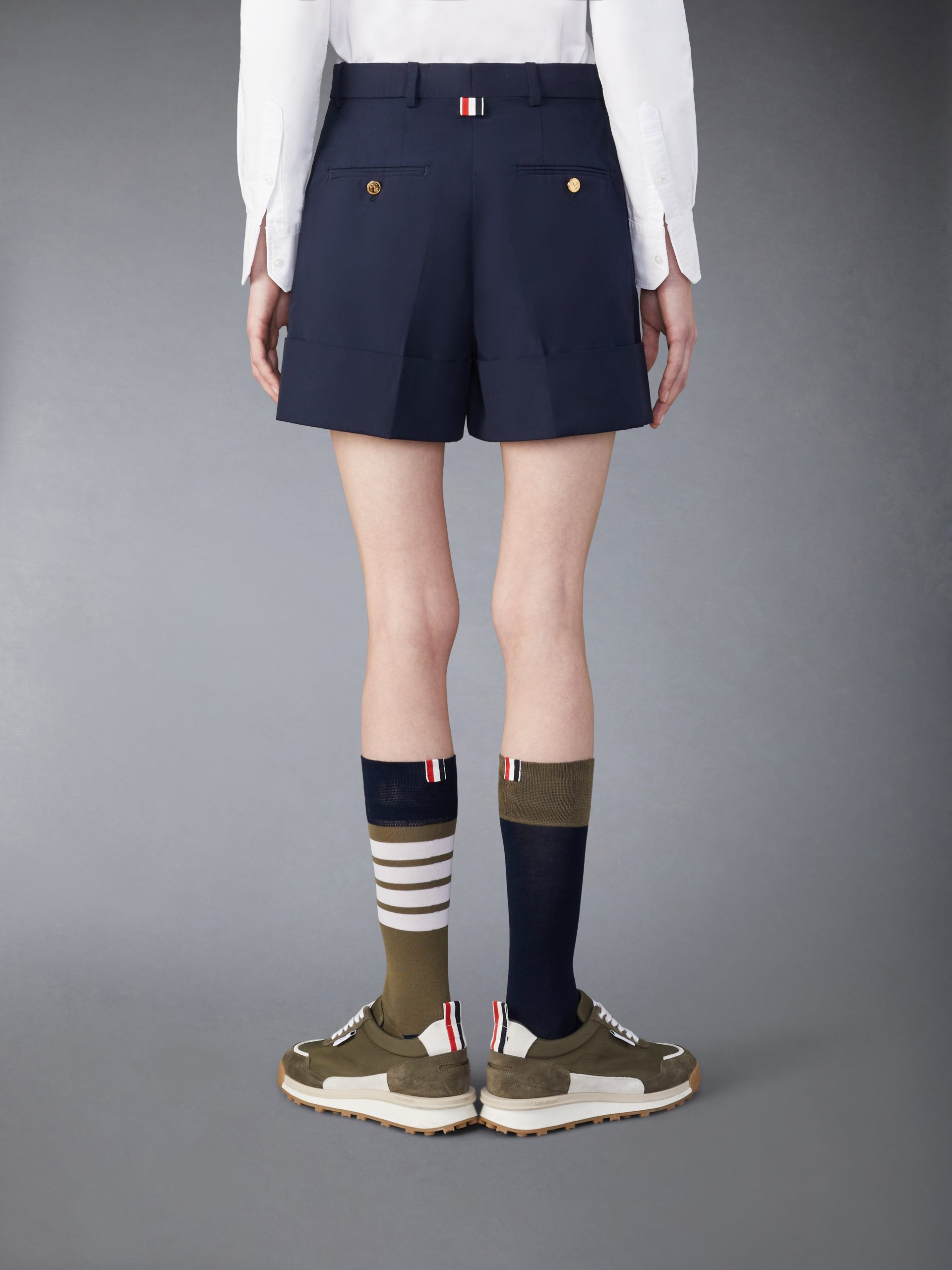 Tab front closure Button-fastening back welt pockets