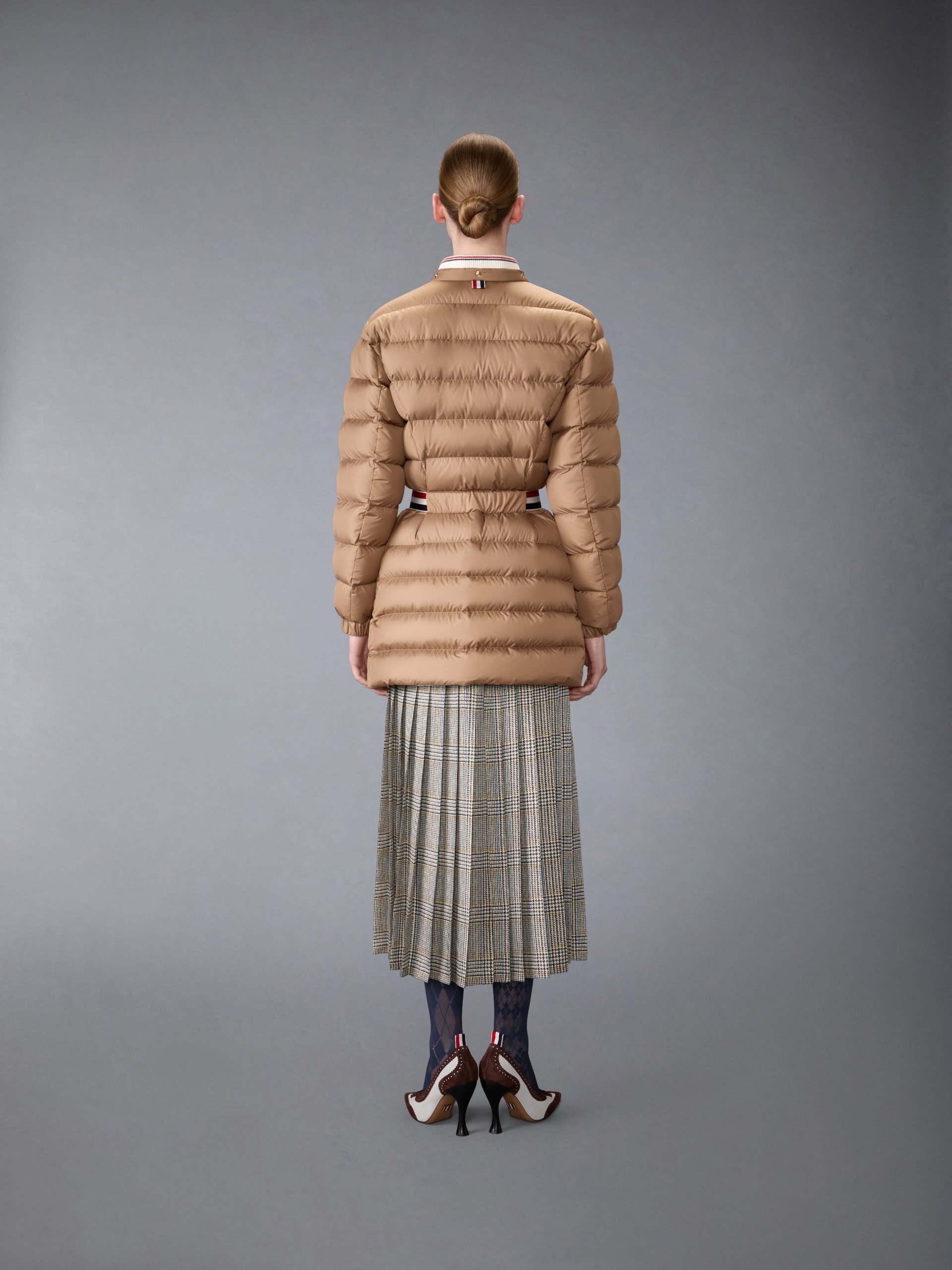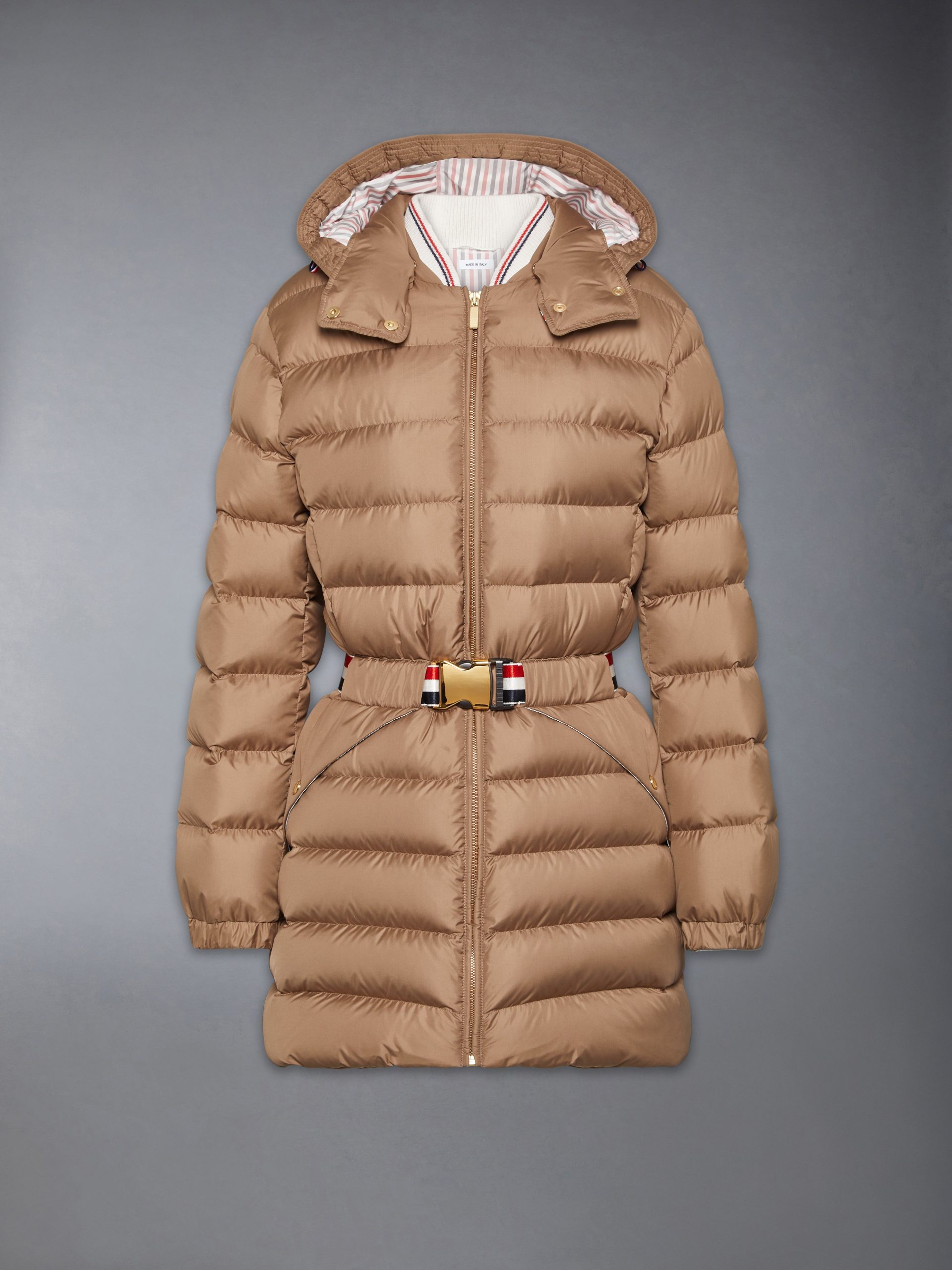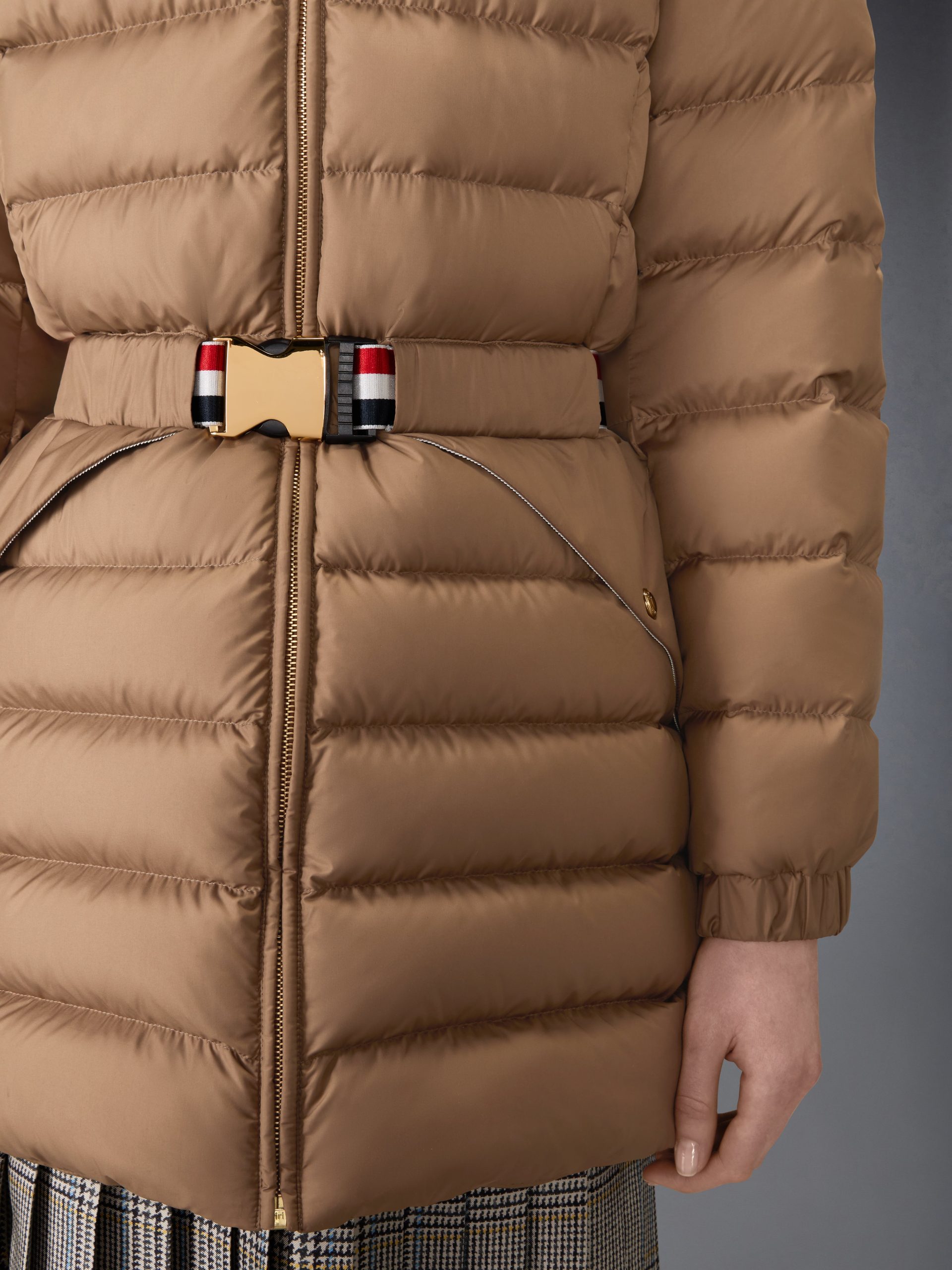 Effortless sophistication meets everyday practicality. This luxurious down jacket features a flattering belted waist and is finished with a gold buckle framed by our signature red. white. and blue trim. Two discreet. roomy pockets with snap button closures—engraved with the Thom Browne insignia—reflect Thom’s meticulous eye. never compromising functionality for elegance. Stay warm all season long in ultimate style.