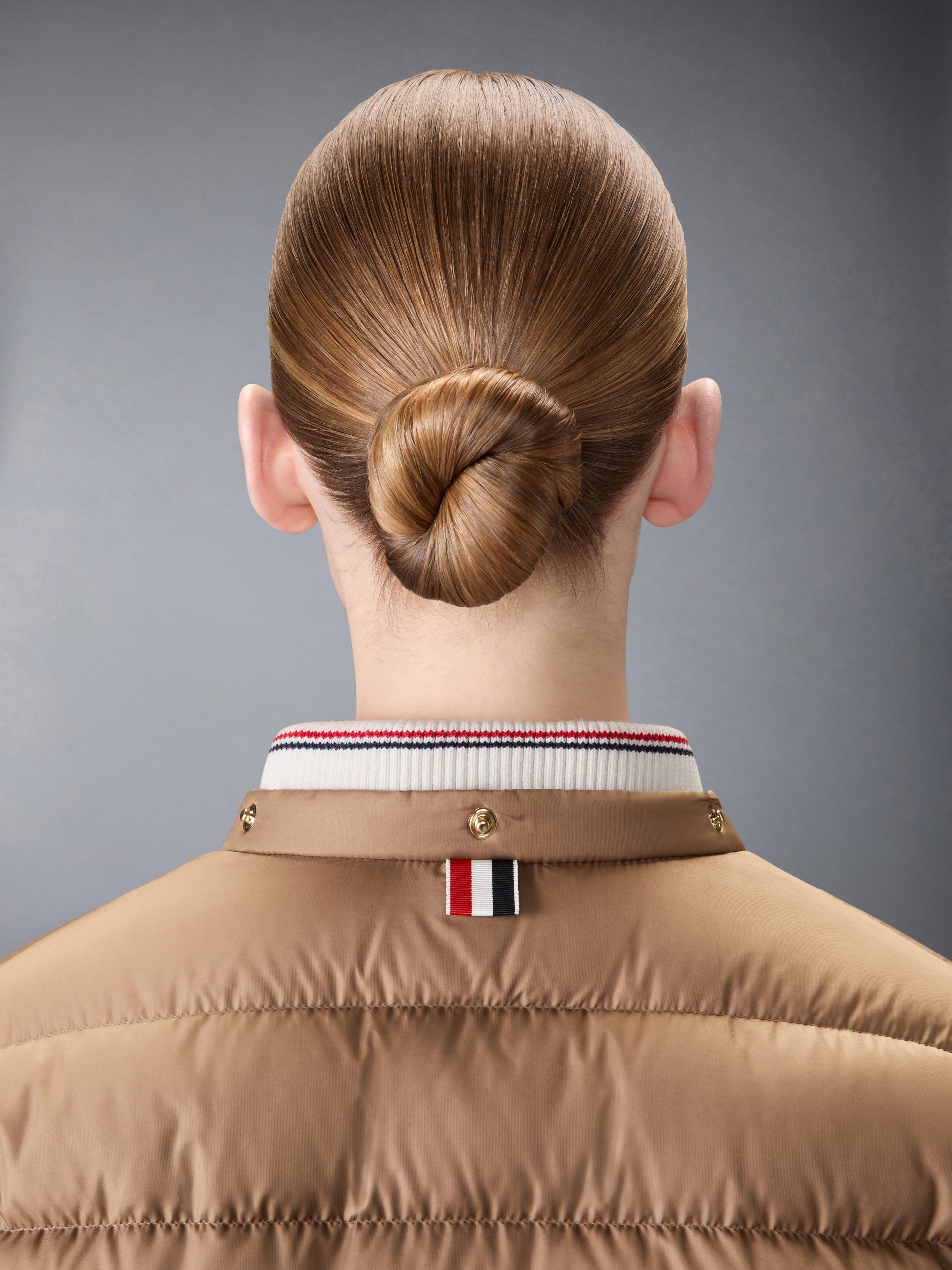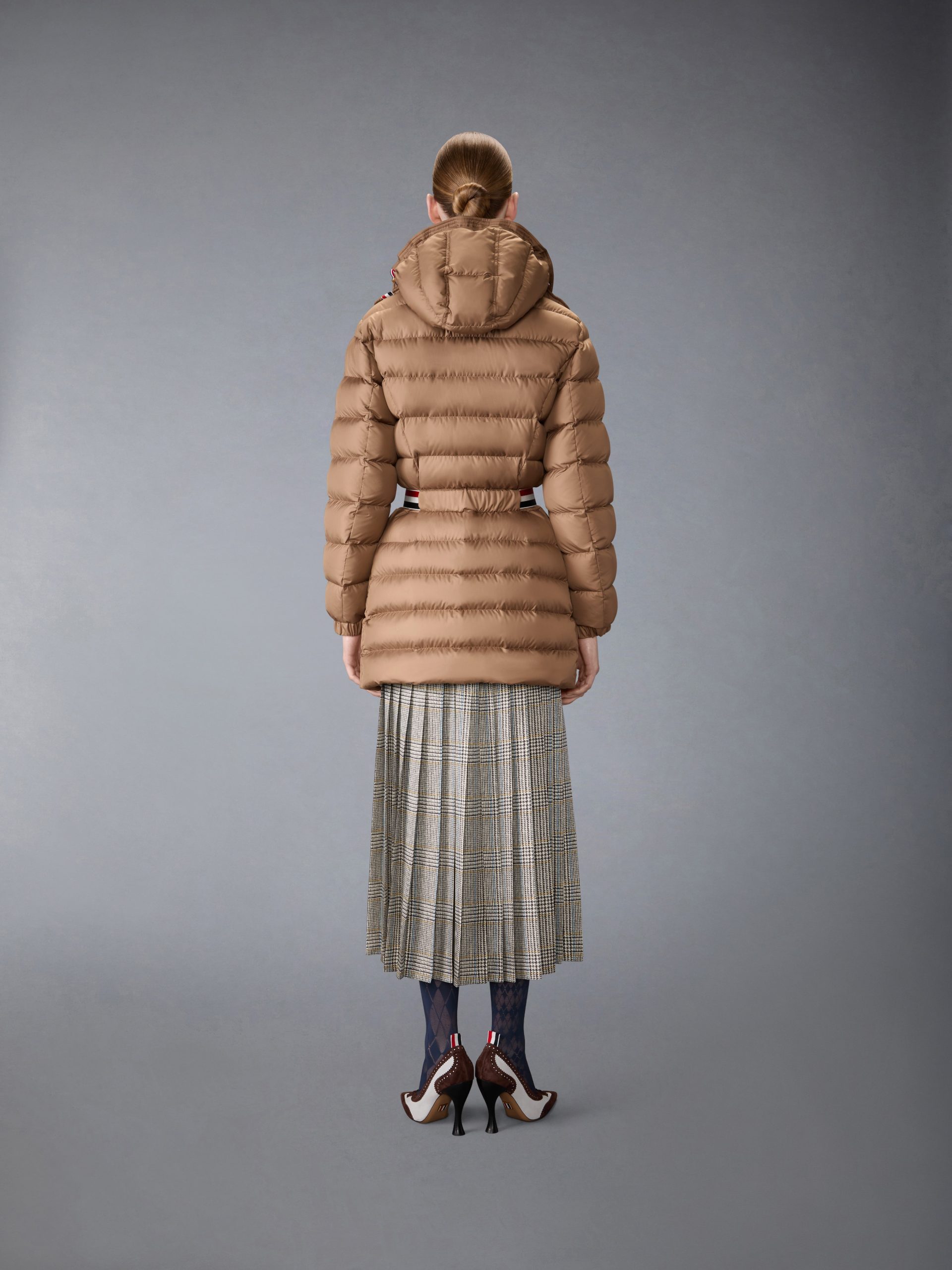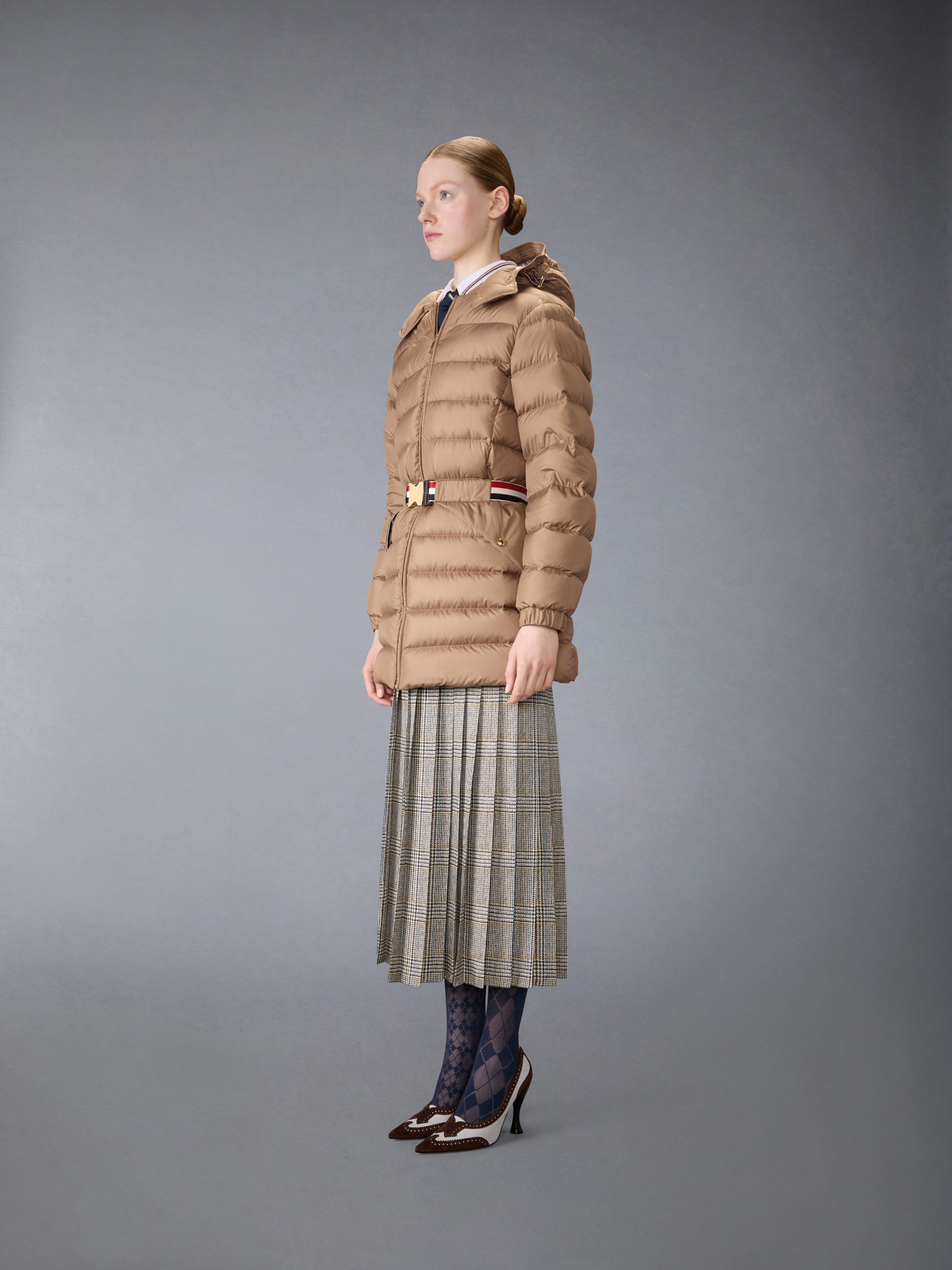 Effortless sophistication meets everyday practicality. This luxurious down jacket features a flattering belted waist and is finished with a gold buckle framed by our signature red. white. and blue trim. Two discreet. roomy pockets with snap button closures—engraved with the Thom Browne insignia—reflect Thom’s meticulous eye. never compromising functionality for elegance. Stay warm all season long in ultimate style.