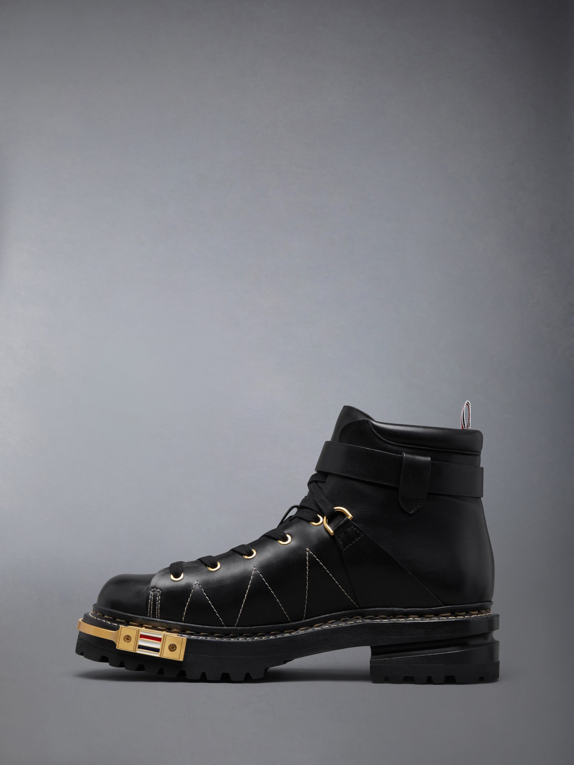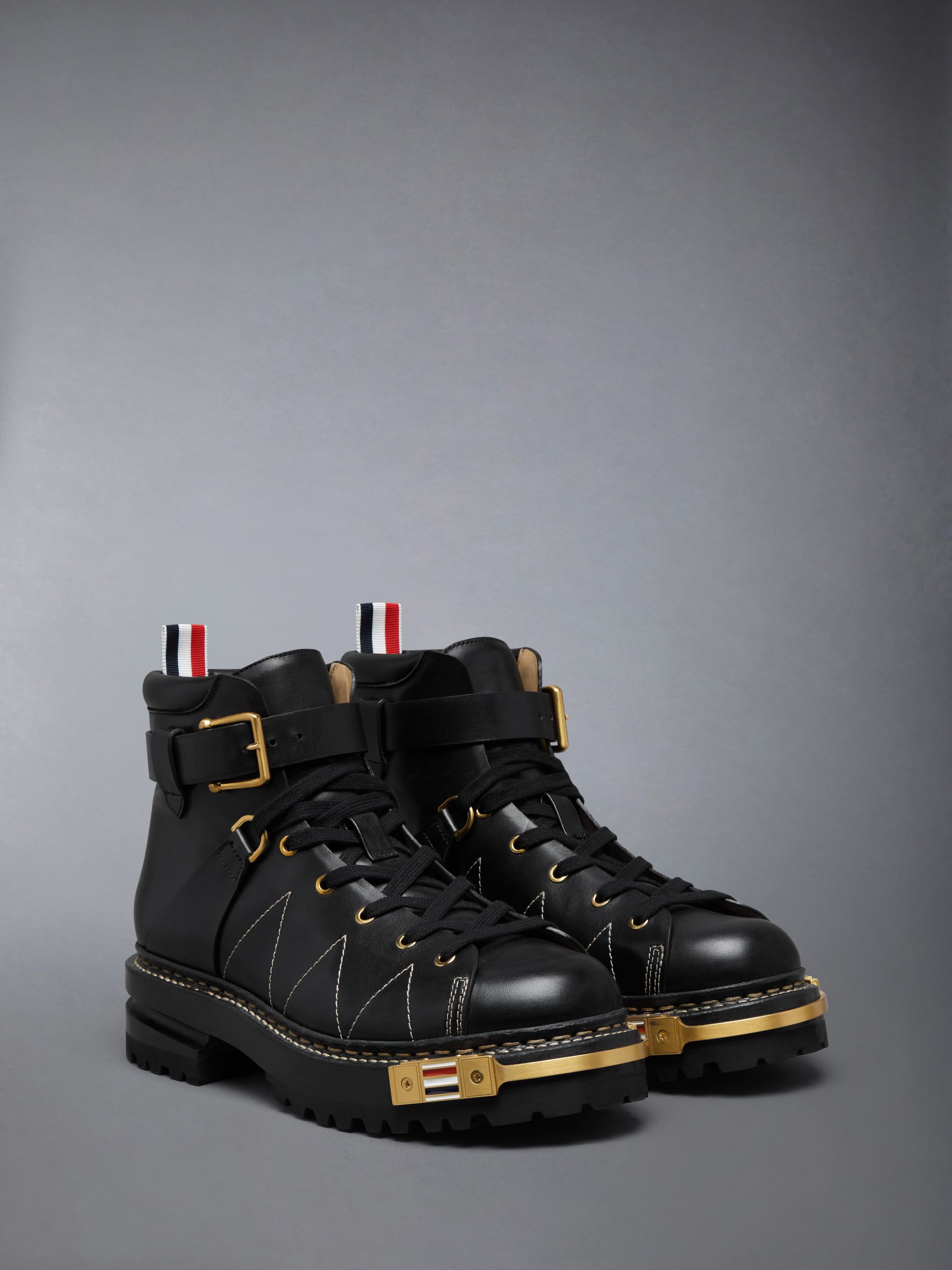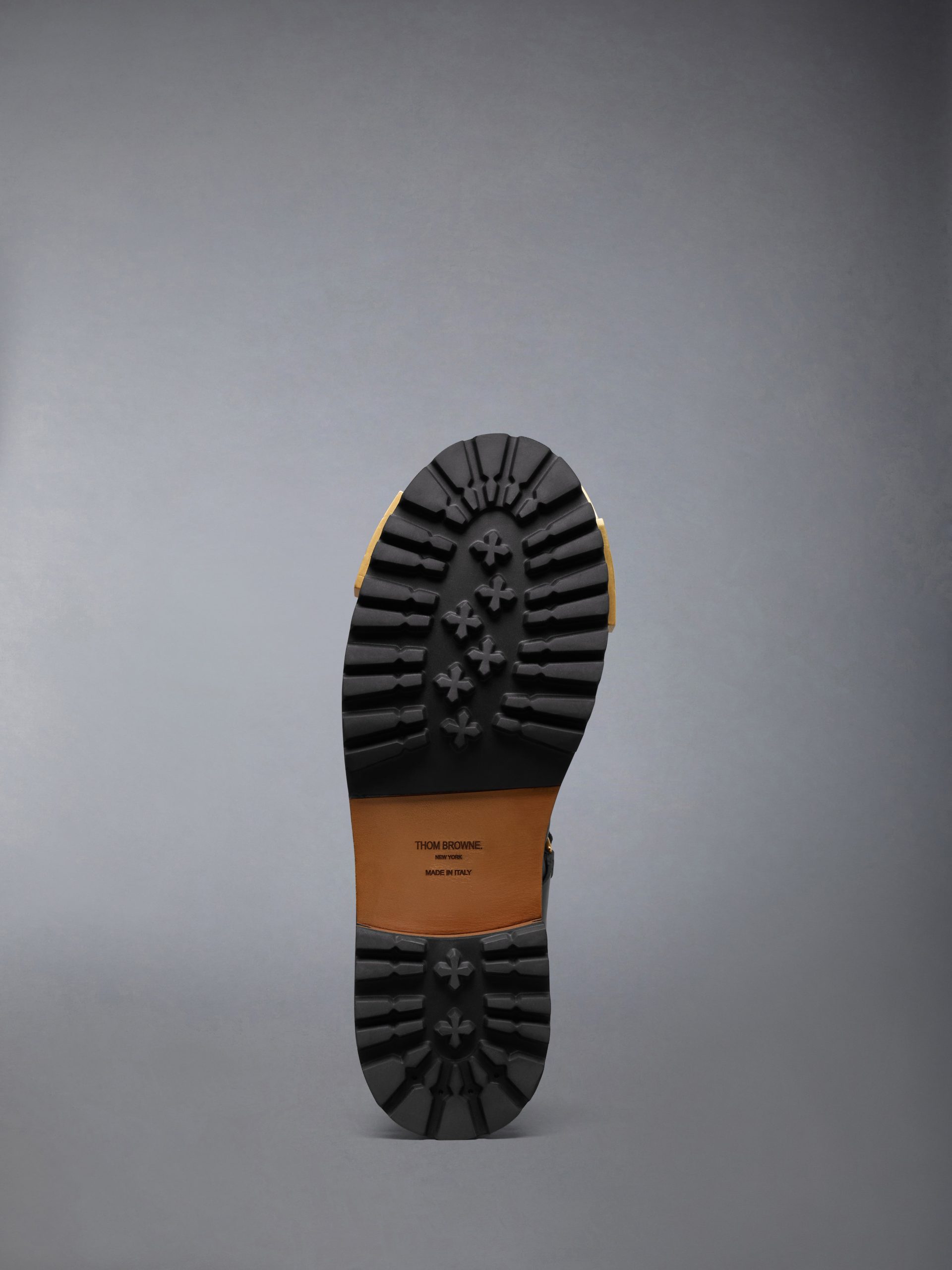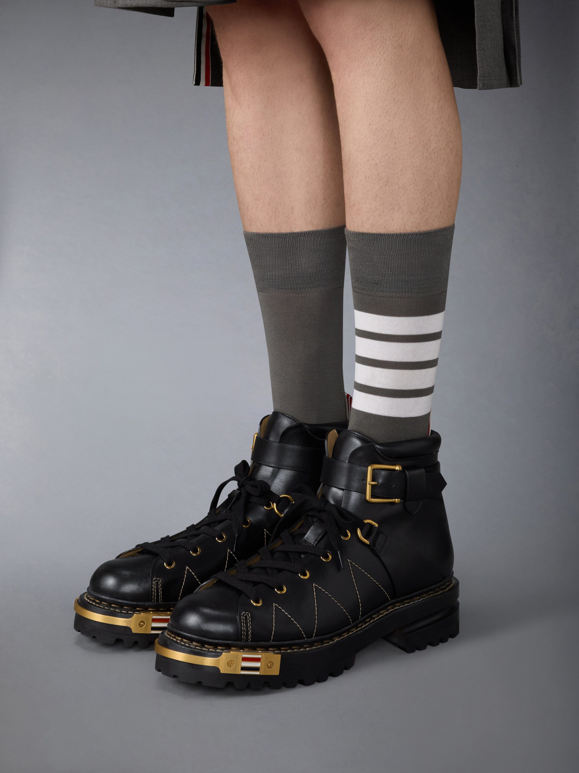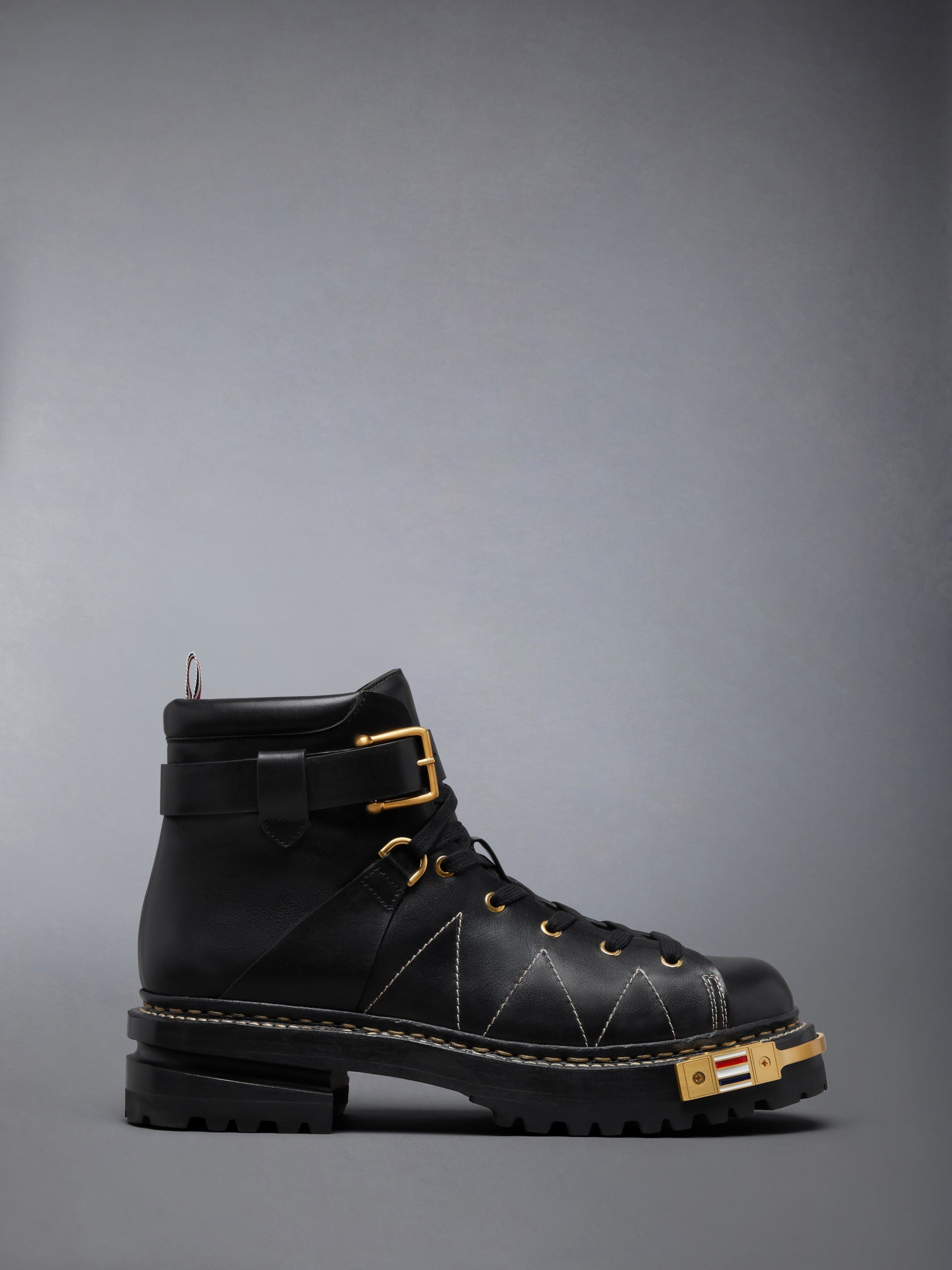 Crafted in calf leather and set on Thom Browne’s signature hiking sole. this elevated all-terrain boot merges alpine heritage with engineered polish. The rugged tread and contrast stitching are balanced by precise details—from gold-toned hardware to tricolor striping at the welt. A bold seasonal statement built on durability and directional style.