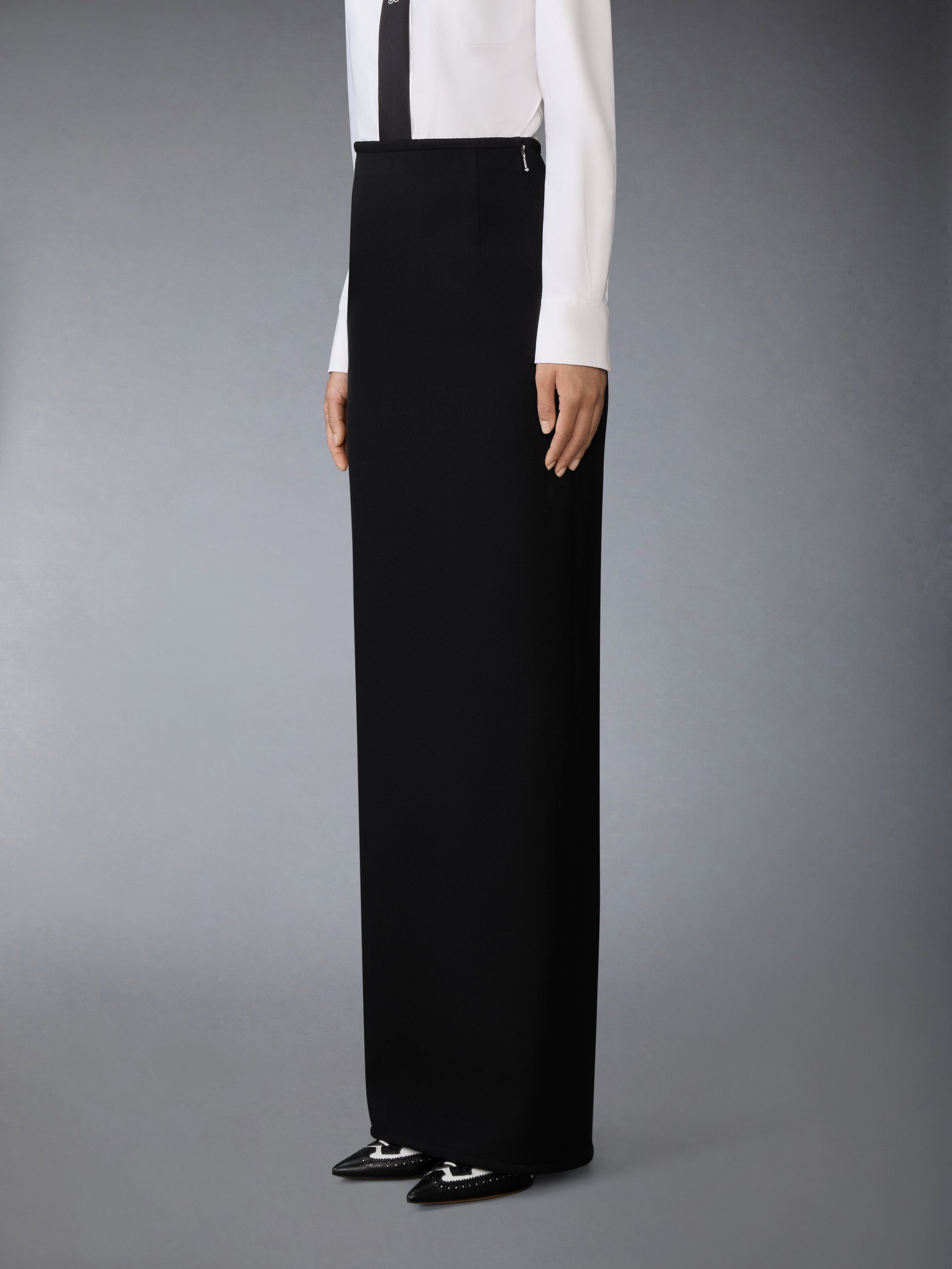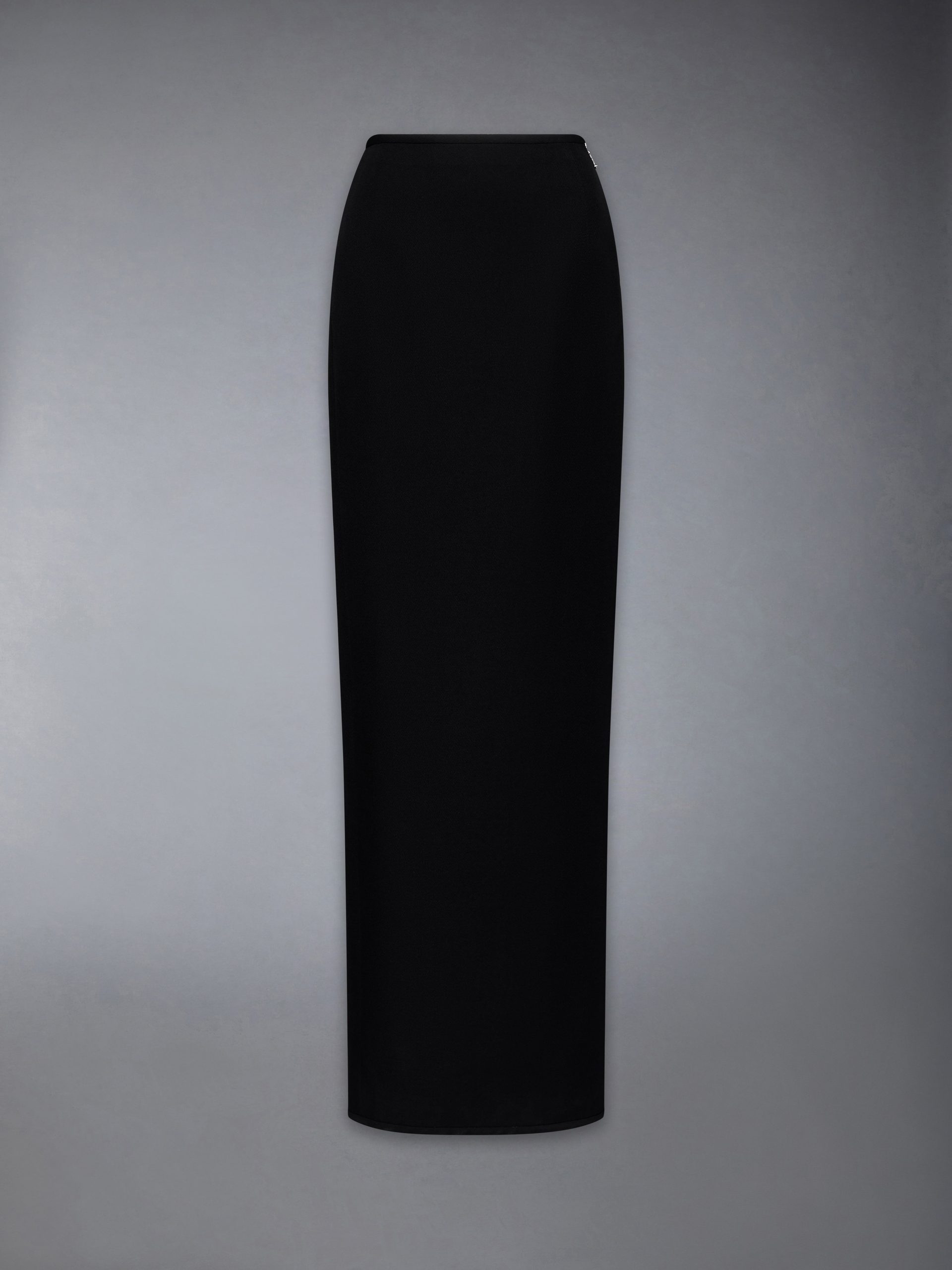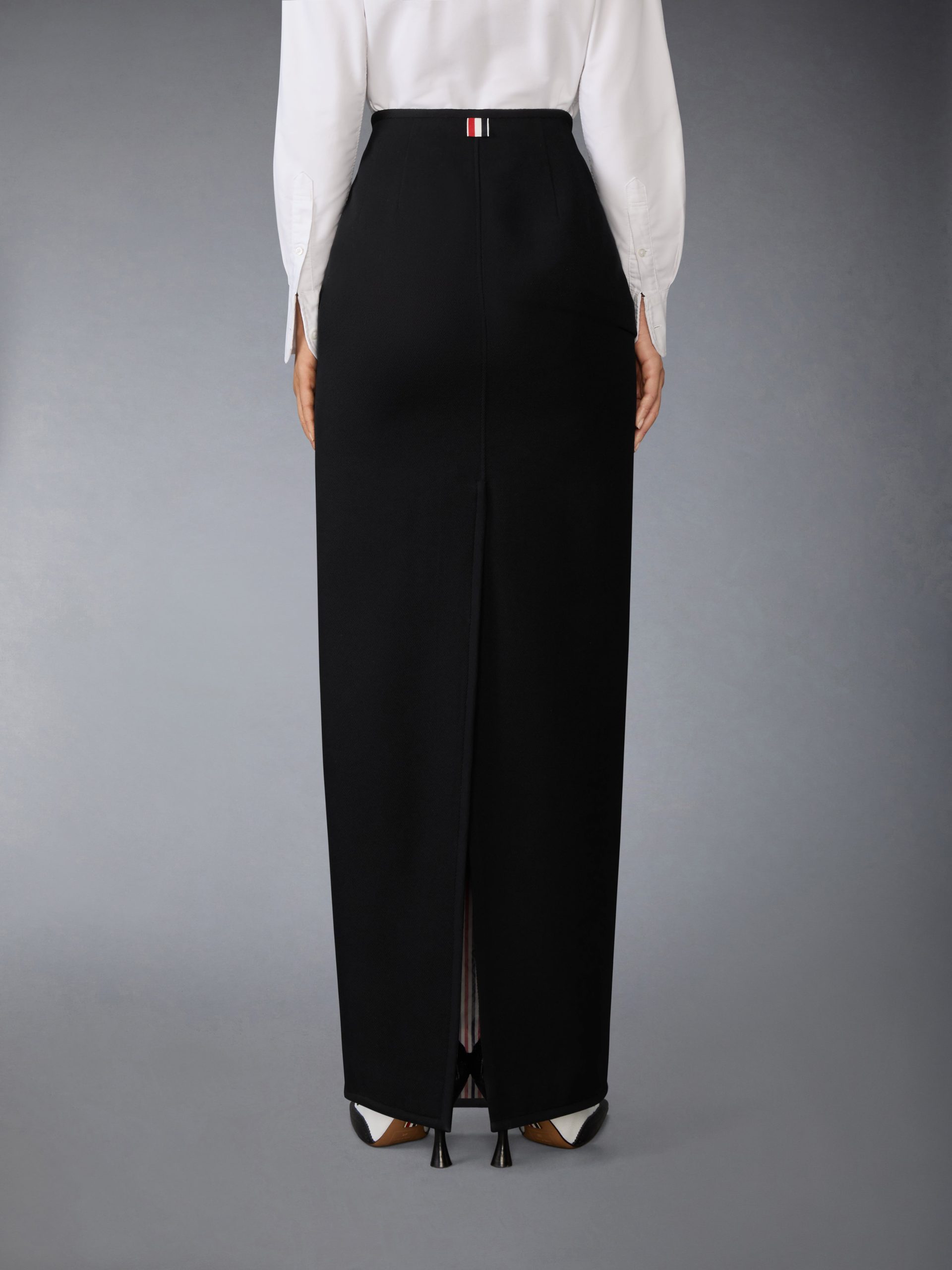 Tailored in structured wool whipcord. this floor-length hobble skirt channels Thom Browne’s black tie vocabulary through precise construction and bold proportion. Shaping darts and a high rise create a clean. architectural fit. while self-tipping adds a refined finish. Pair with the Patent Leather 4-Bar High-Heel Sandal for a playful contrast.