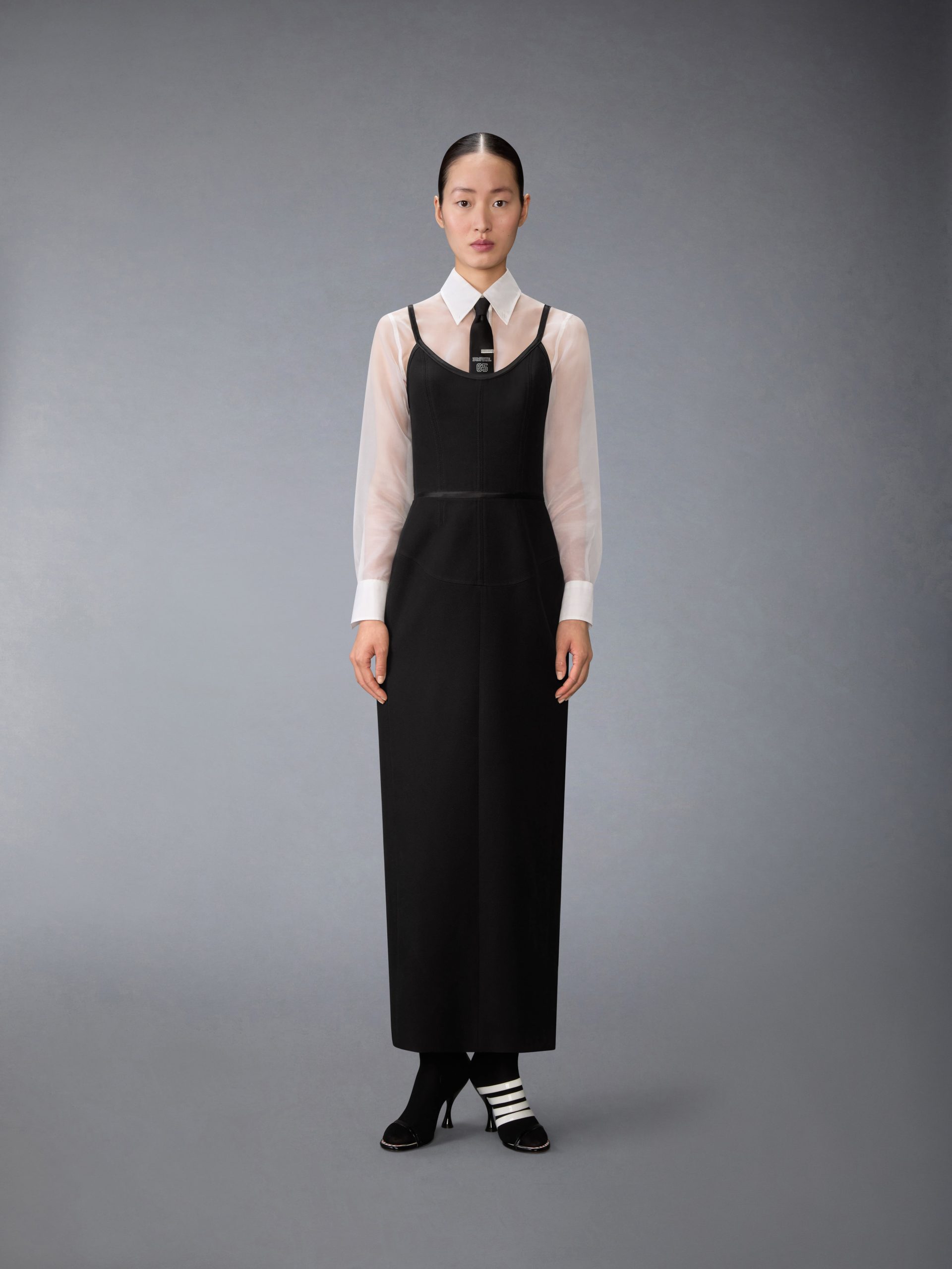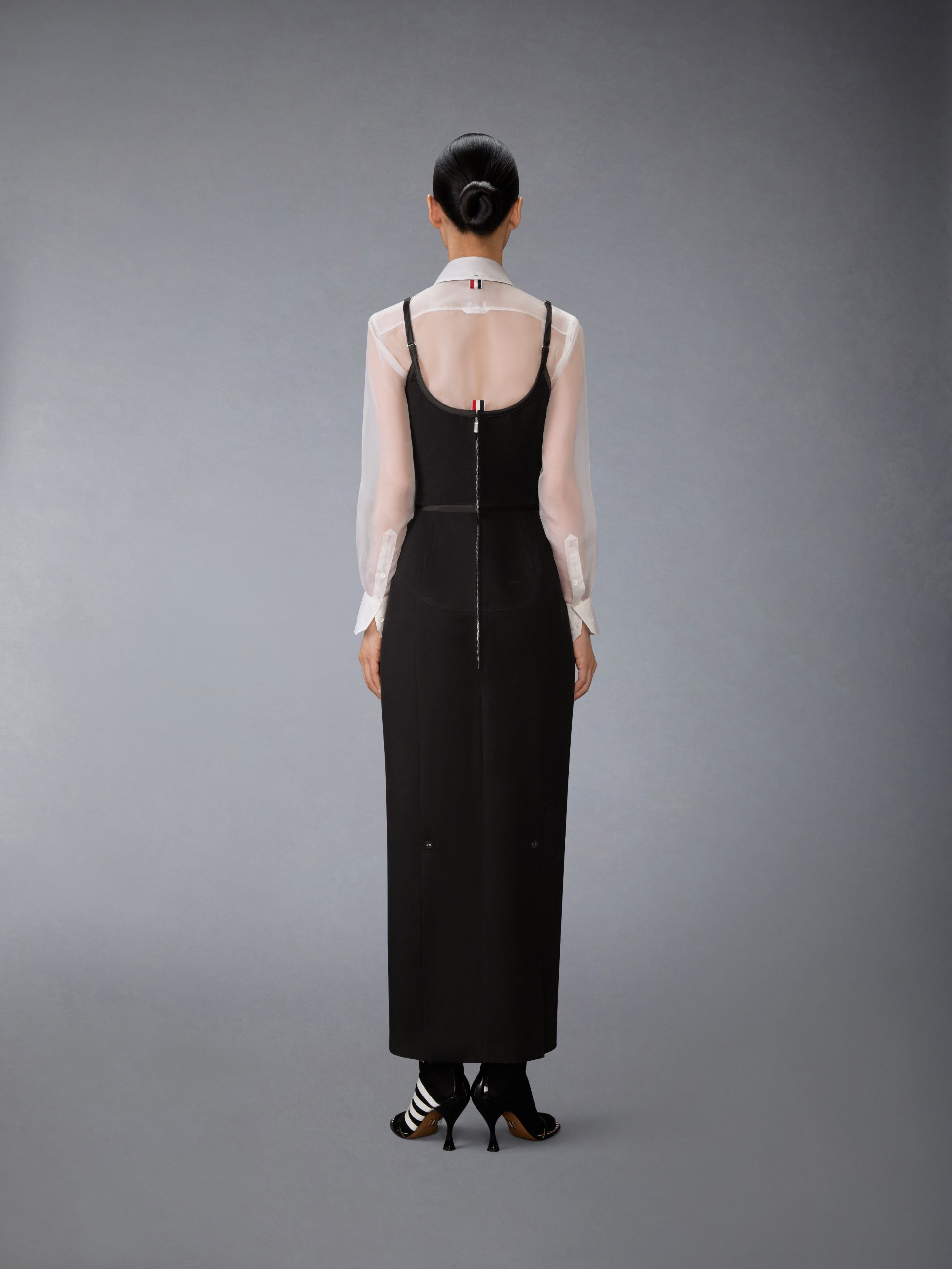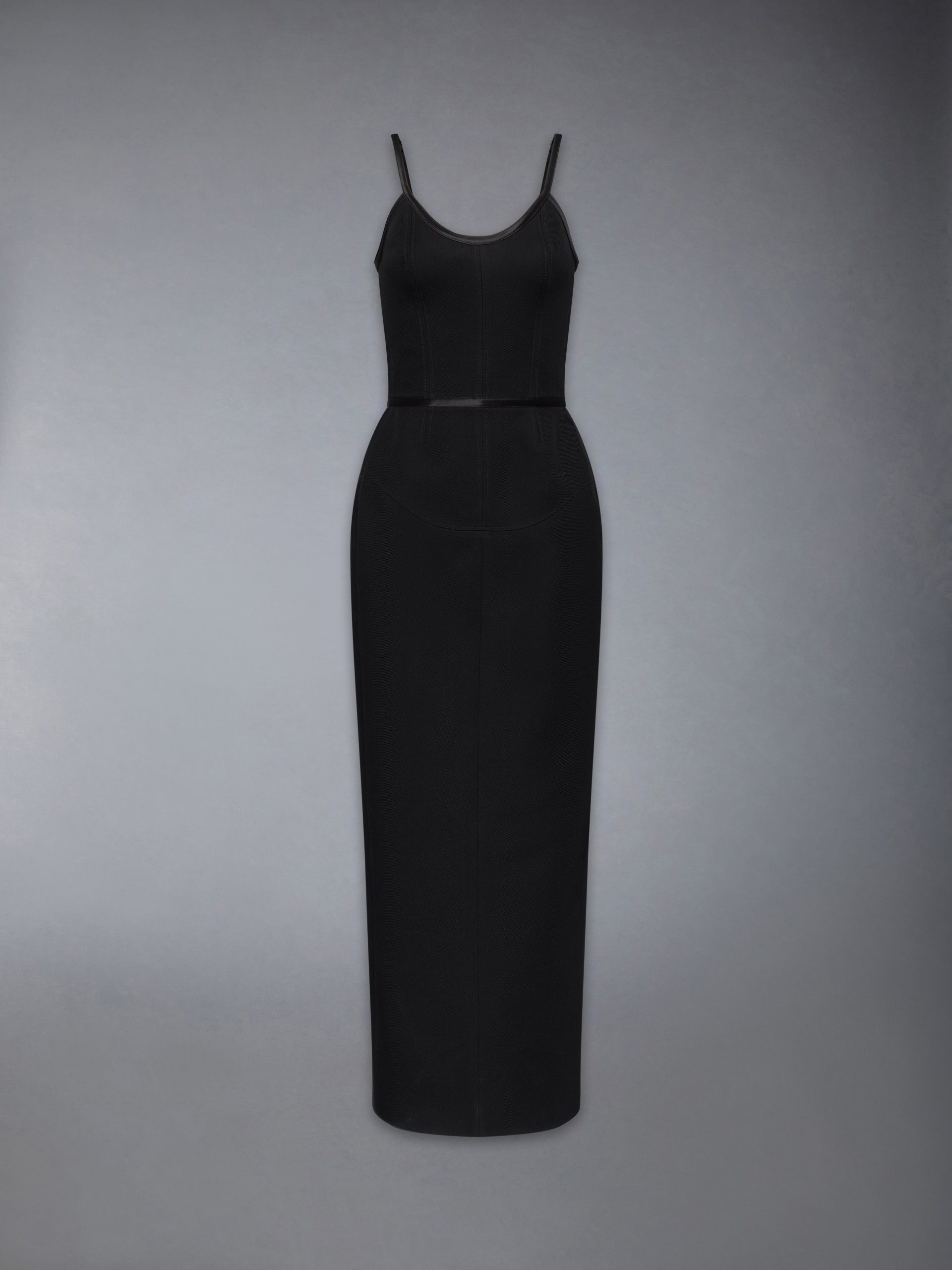 A study in construction and contrast. this corset dress reinterprets tailoring through a sculpted lens. Crafted in structured wool whipcord with allover satin tipping. it blends bustier-inspired shaping with softened edges. Adjustable straps and a striped silk interior balance discipline and delicacy—revealing the precision beneath its quiet surface.