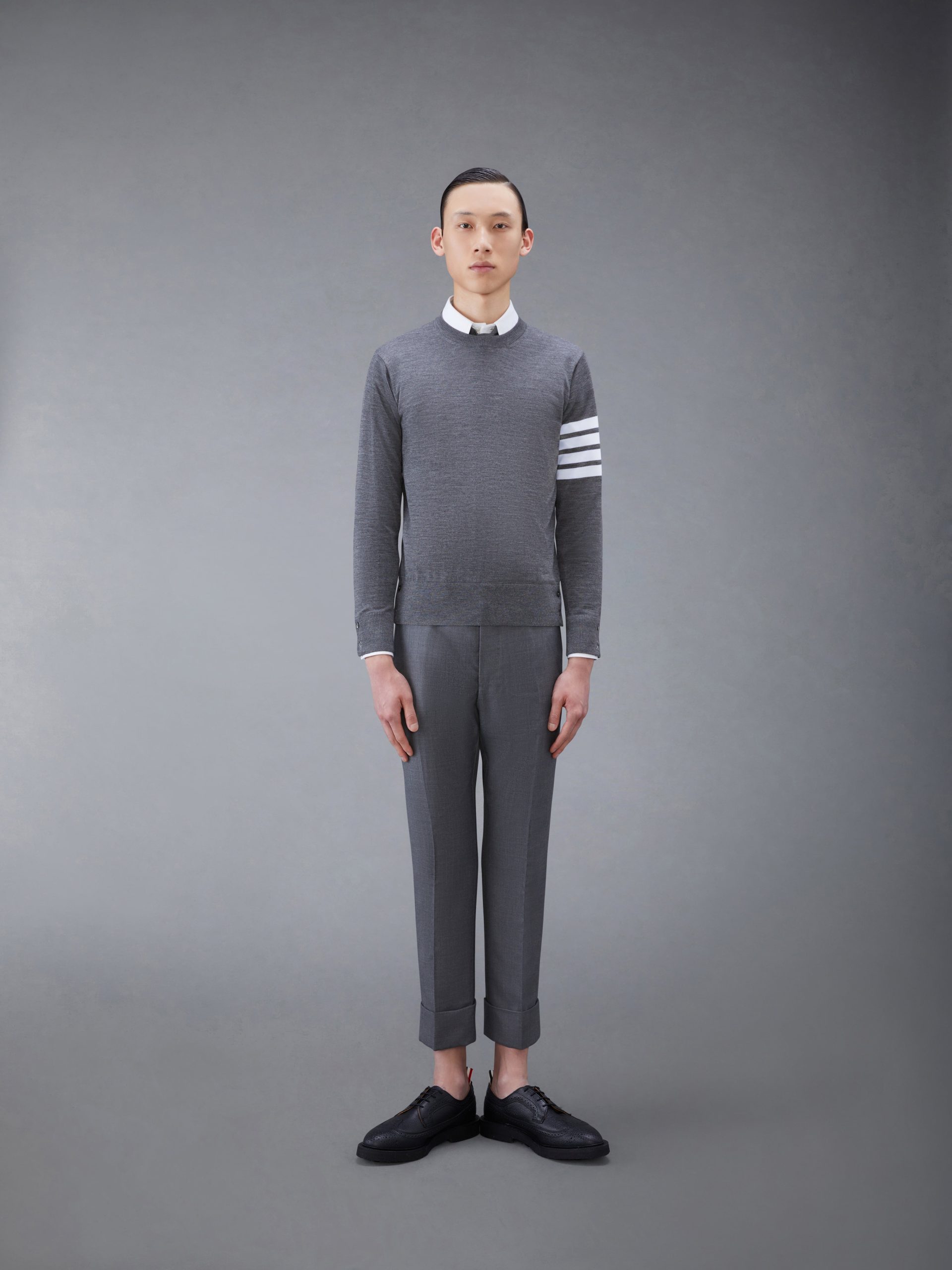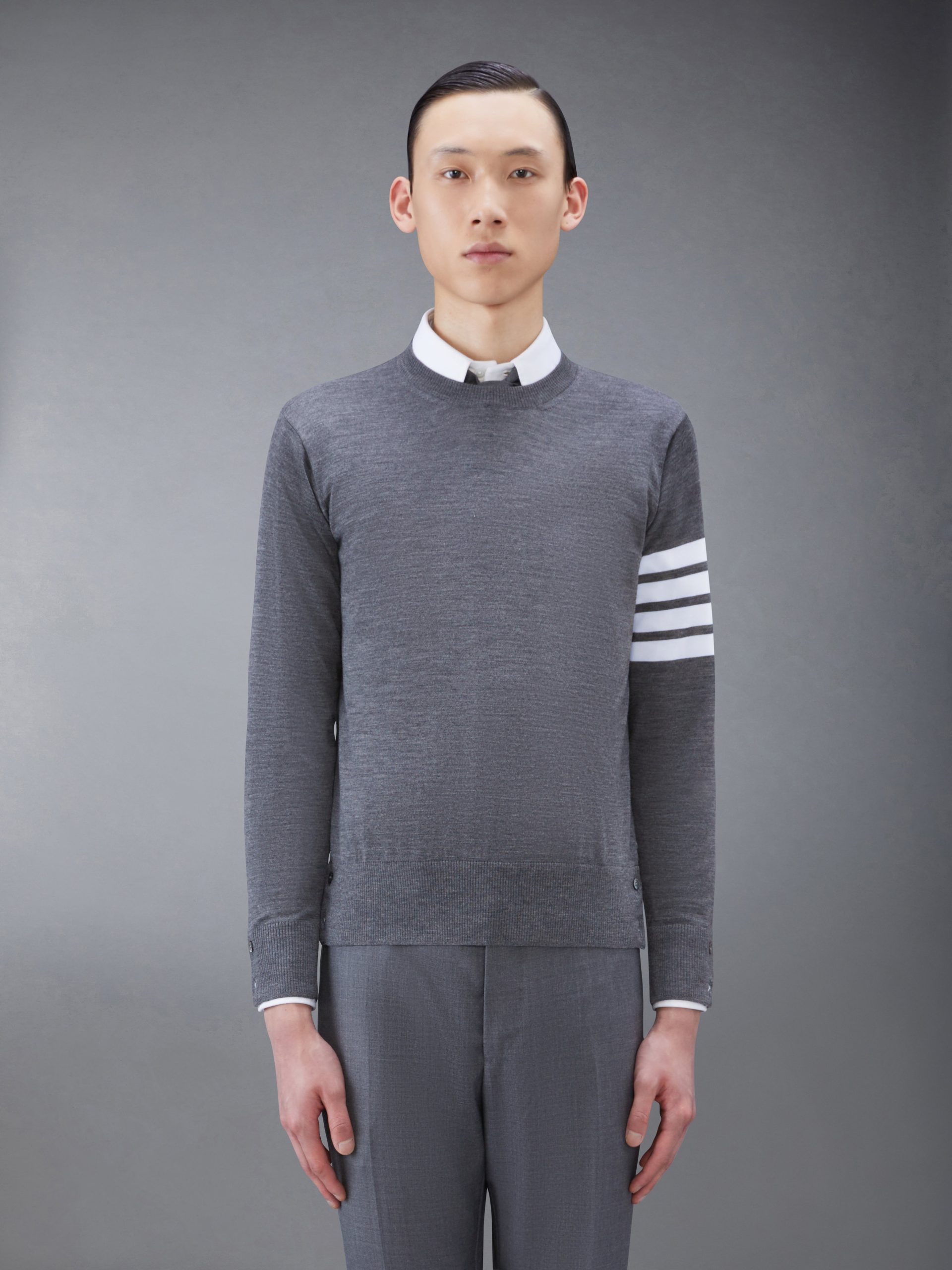 A signature Thom Browne emblem defines our Wool 4-Bar Pullover. Inspired by varsity stripes. our 4-Bar design is Thom Browne most sought-after icon. Presented in fine merino fabric. this pullover is a longstanding staple.