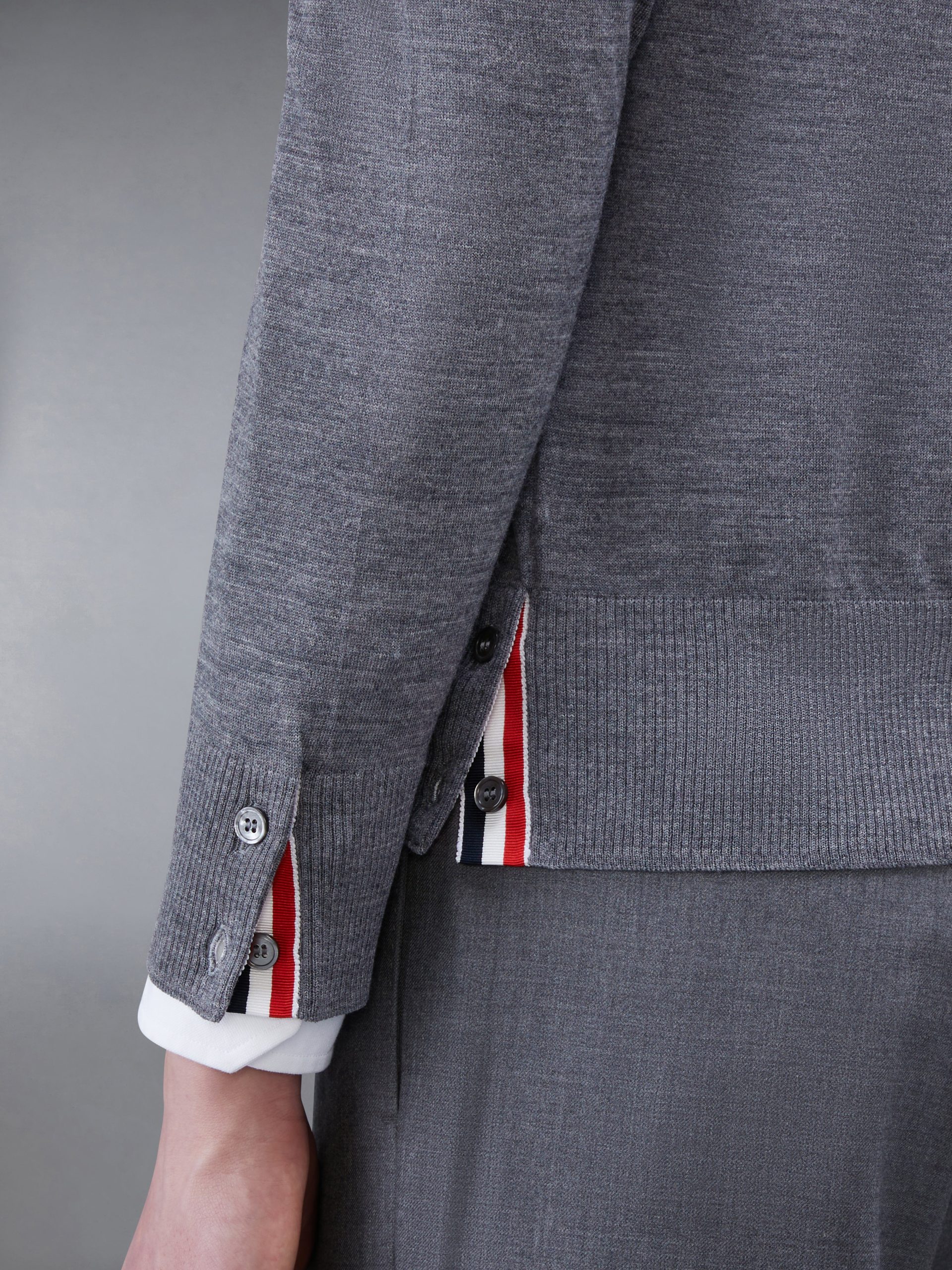 Buttoned side vents and cuffs with signature striped grosgrain trim