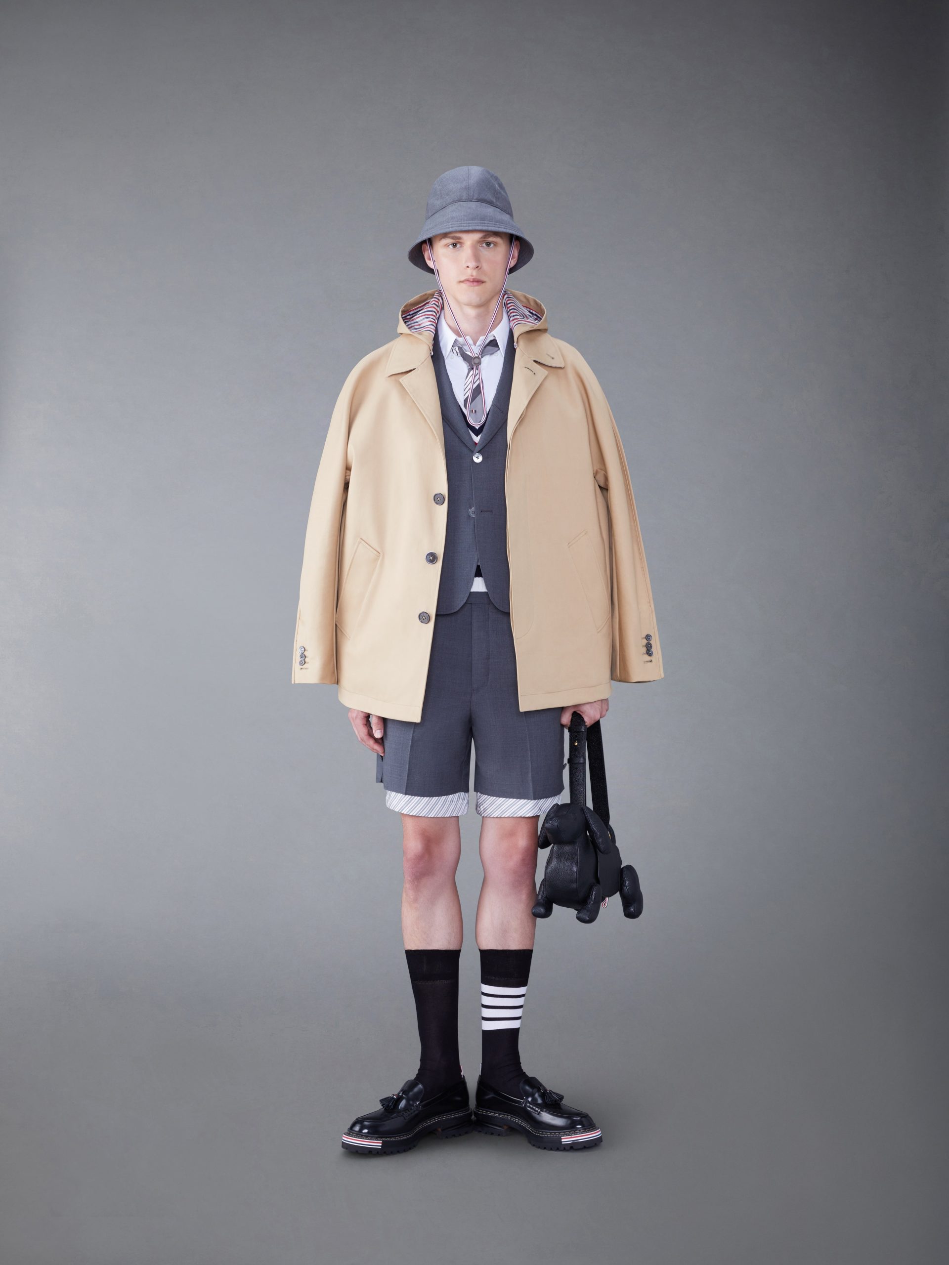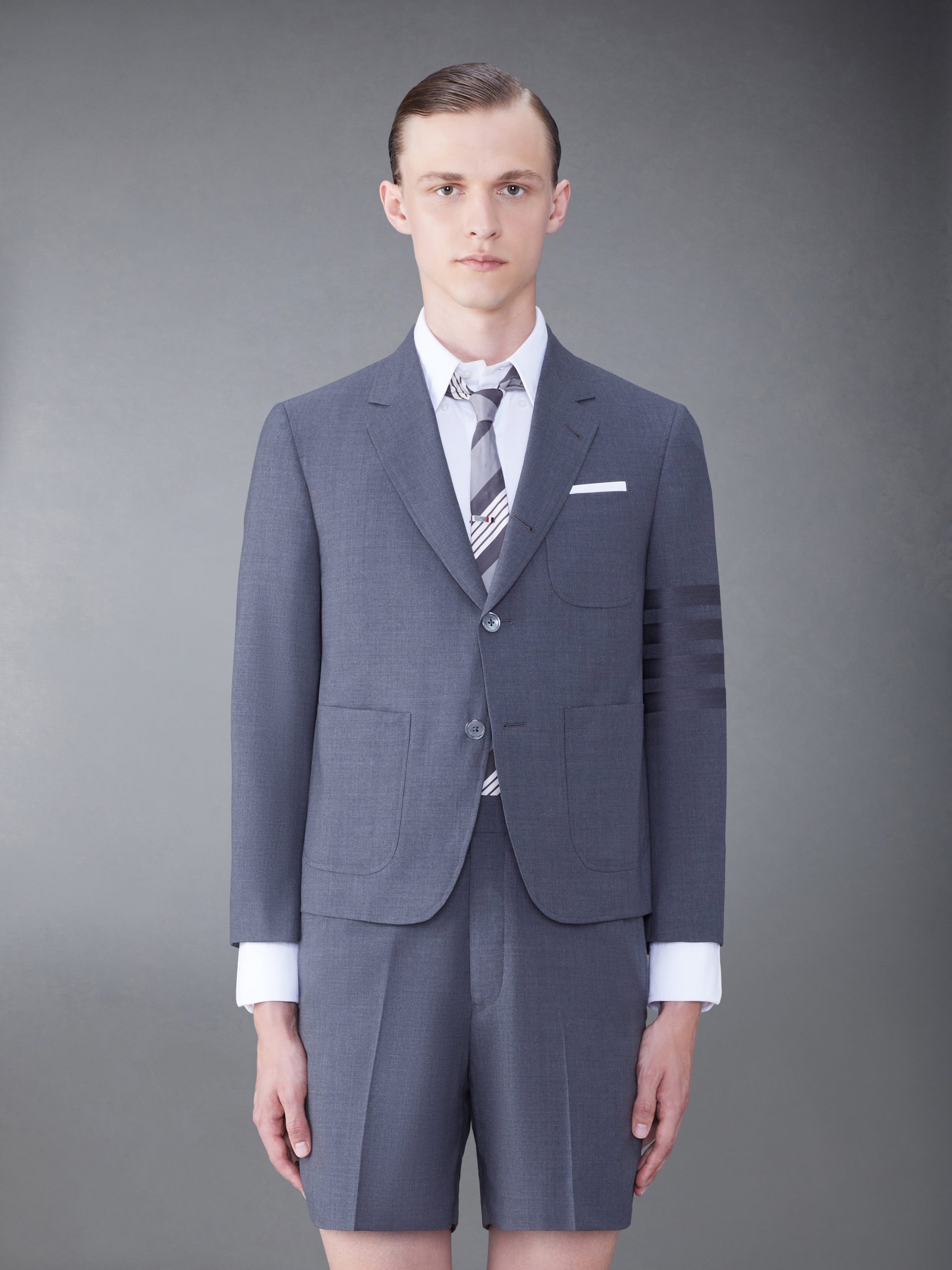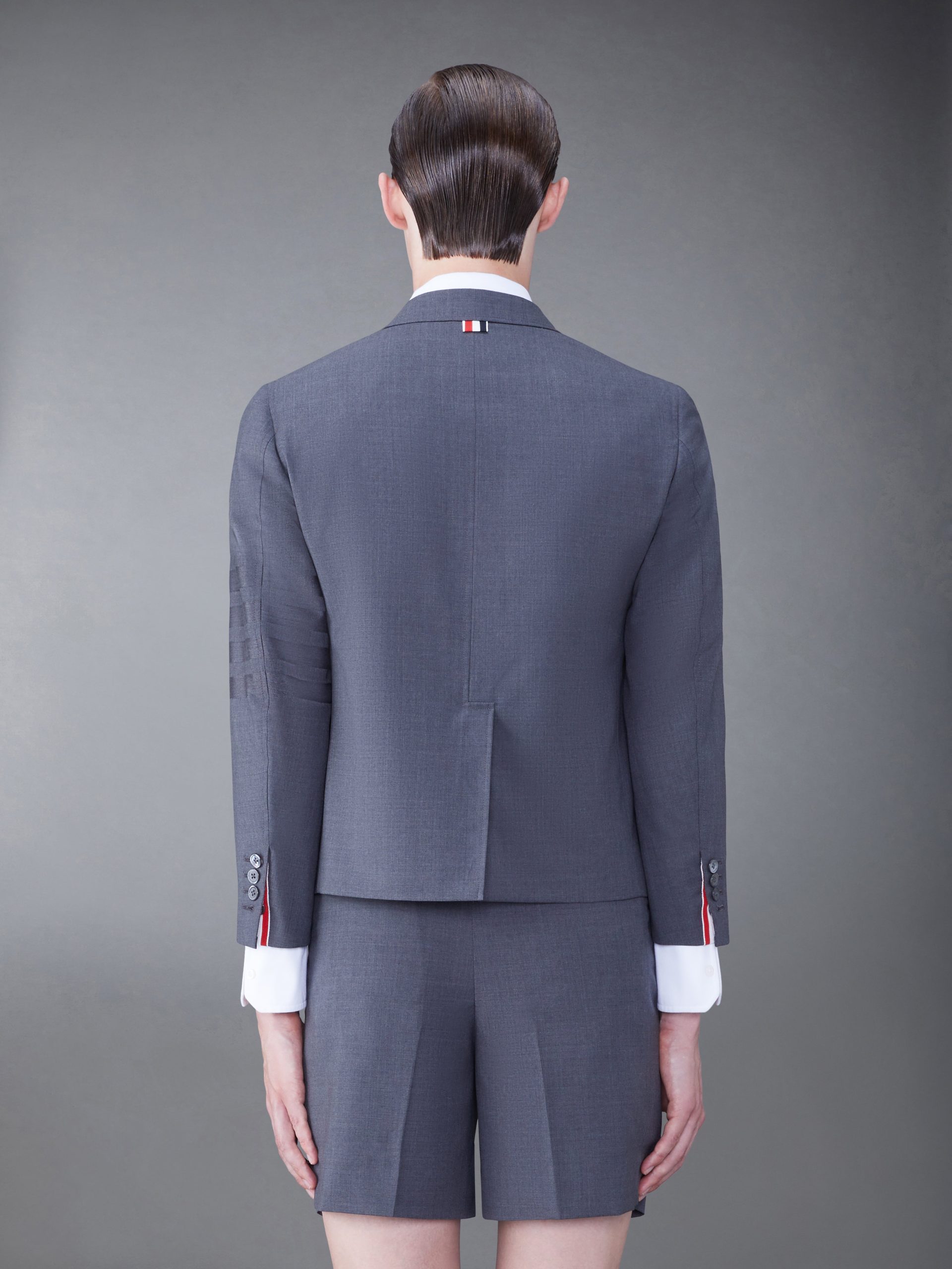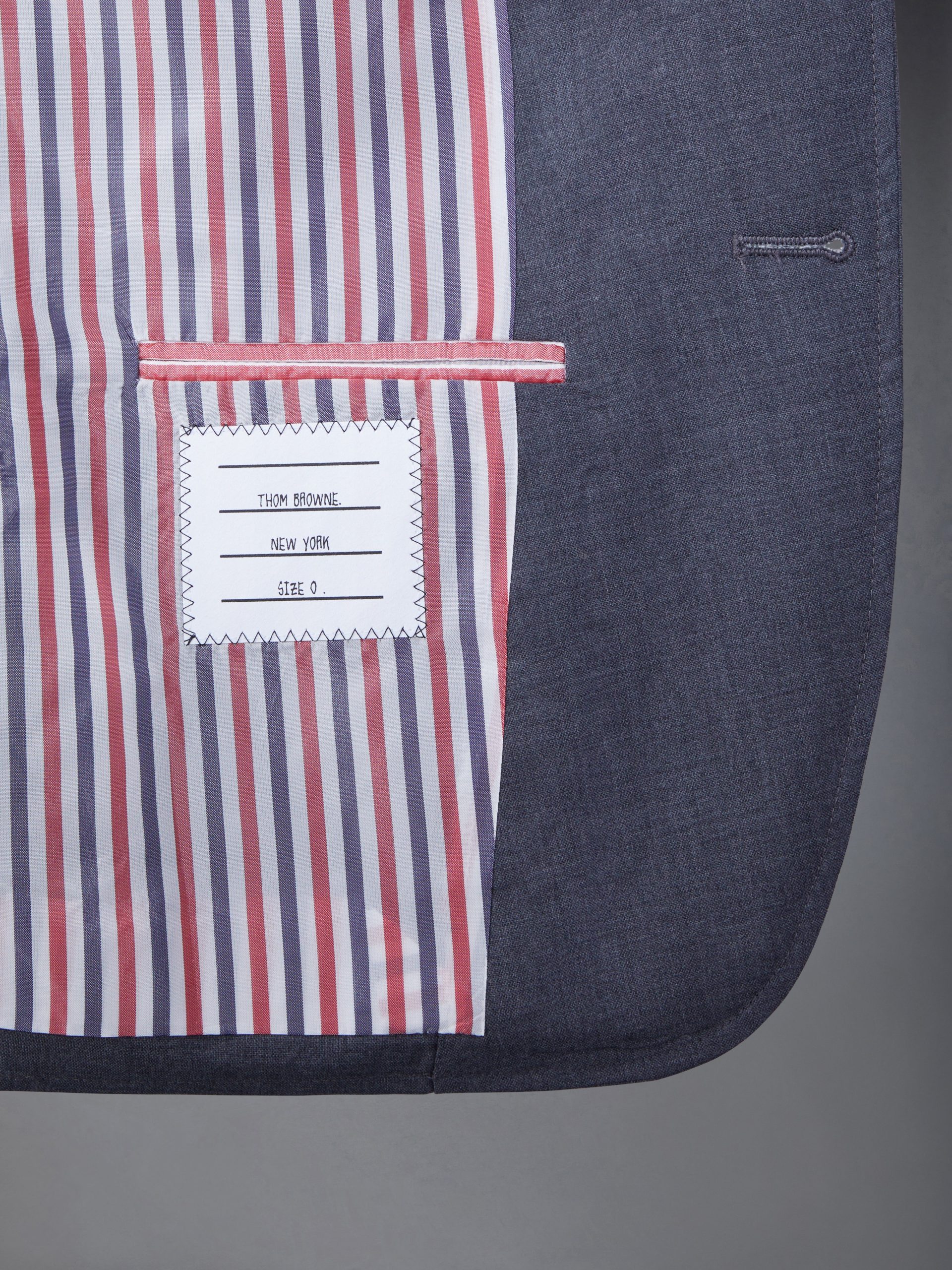 This plain weave suiting shrunken sack sport coat has a wide fit for ultimate comfort while remaining true to Thom Browne classic heritage. Features 4-Bar detailing at the left arm. an emblem synonymous with the brand.