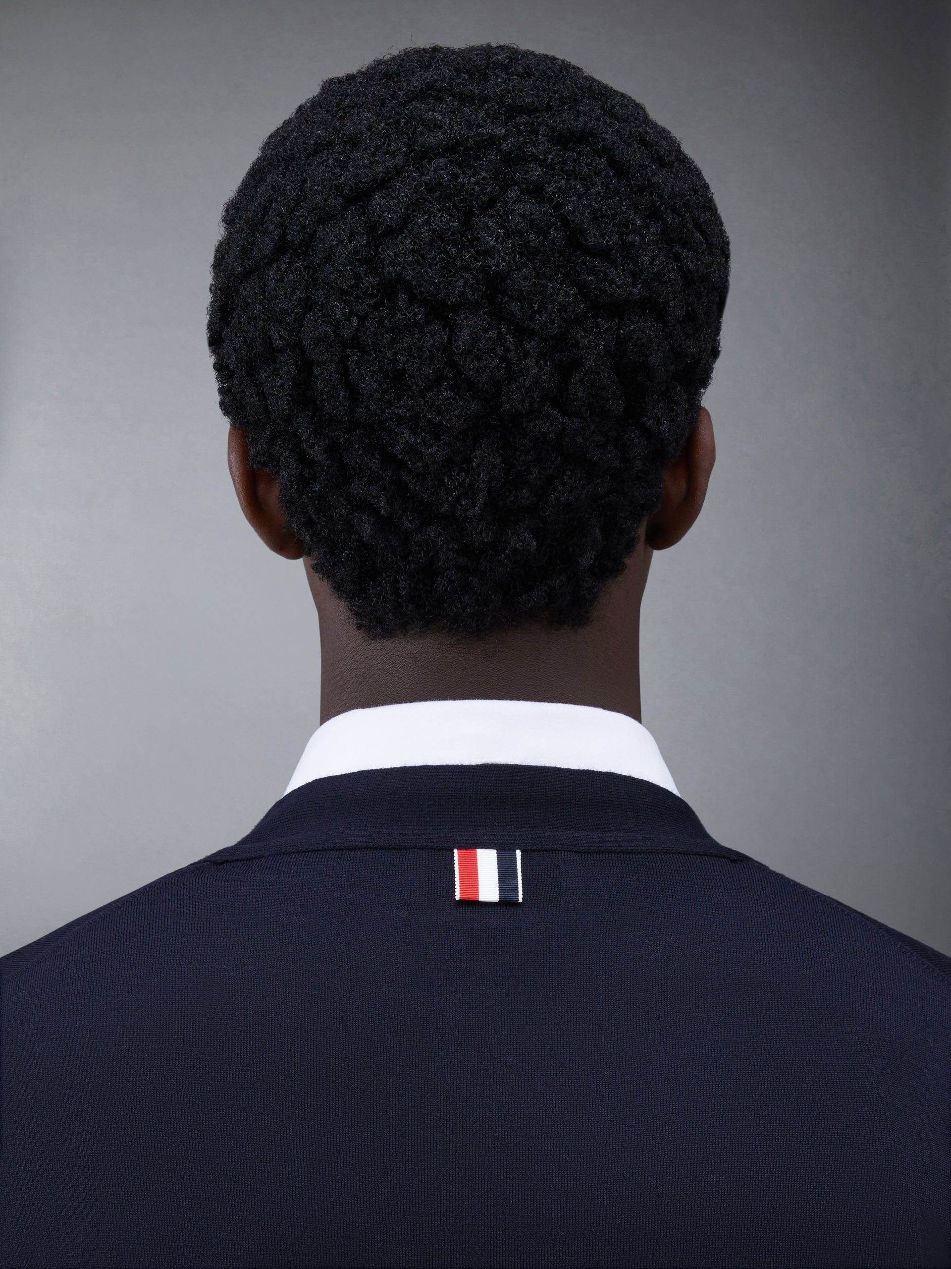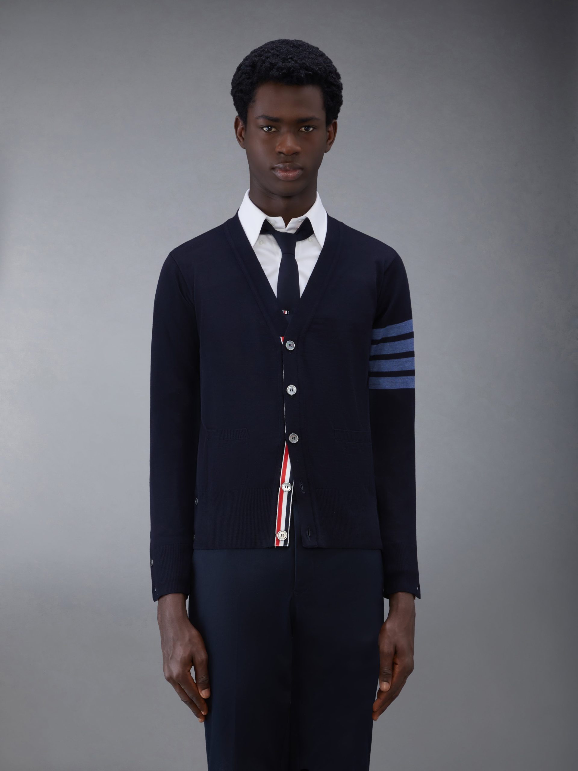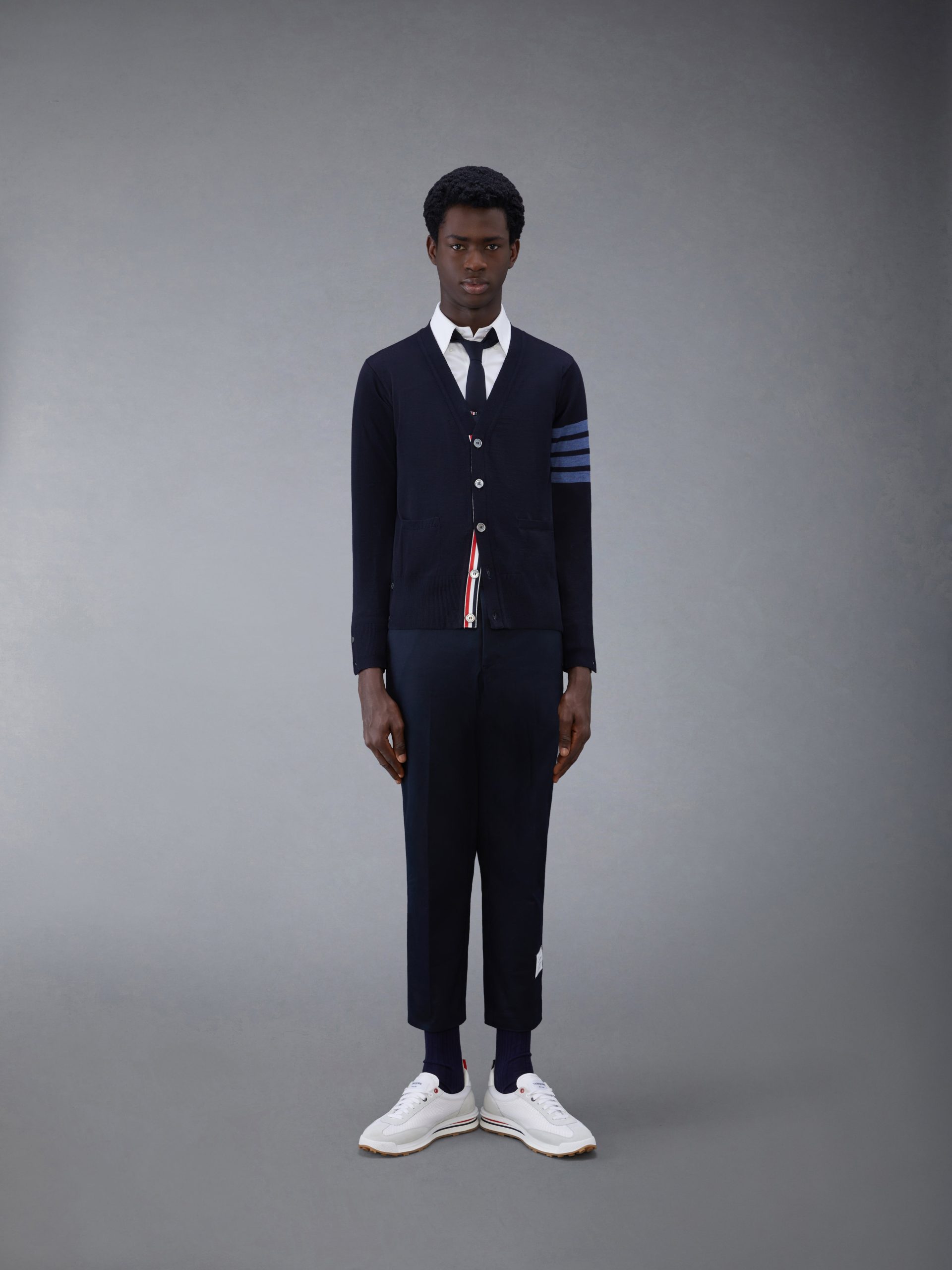 Two Thom Browne emblems define our Wool 4-Bar V-neck Cardigan ?grosgrain trim and 4-Bar stripe detailing. both synonymous with the brand. Presented in fine merino fabric. this cardigan exudes sophistication.