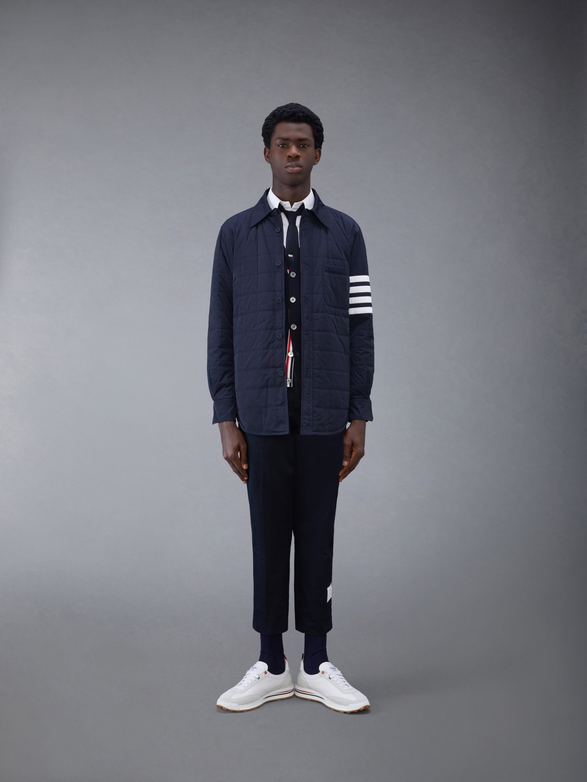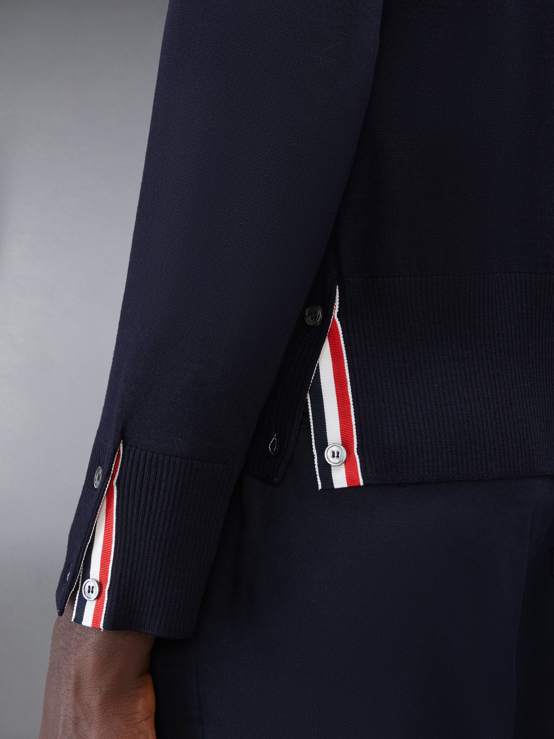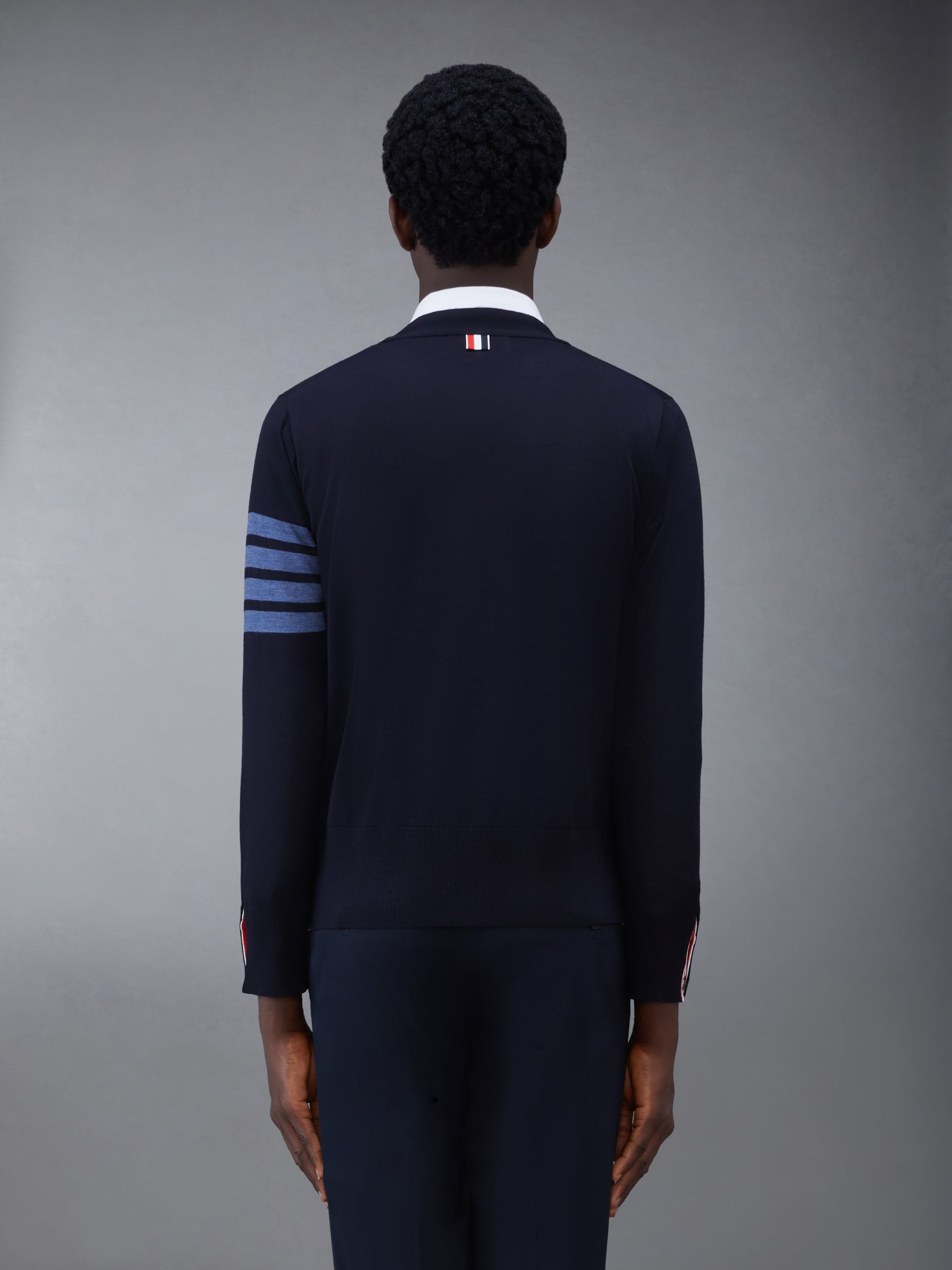 Two Thom Browne emblems define our Wool 4-Bar V-neck Cardigan ?grosgrain trim and 4-Bar stripe detailing. both synonymous with the brand. Presented in fine merino fabric. this cardigan exudes sophistication.