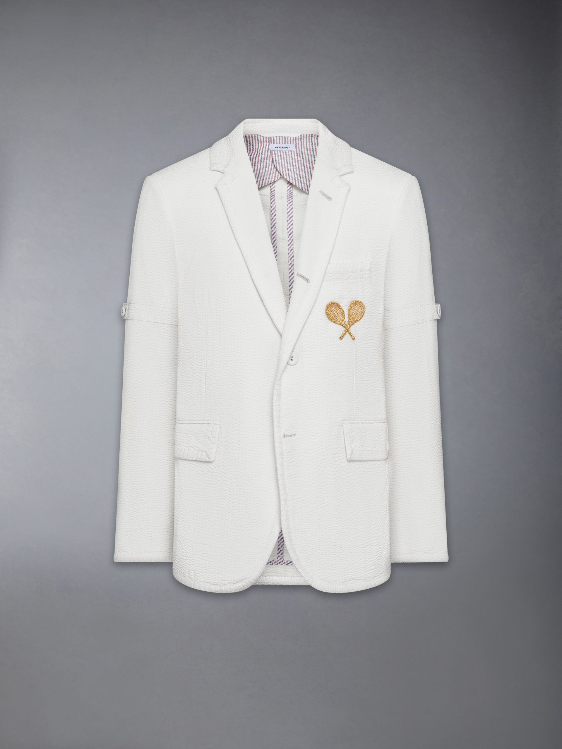 This extra-fine wool seersucker sport coat is lightweight and breathable. woven with the signature crinkle stripe that holds its shape while allowing for natural movement. A hand-stitched bullion tennis racket appliqué and anchor-detailed buttons nod to leisure and sport—hallmarks of the Thom Browne world. Style with Japanese Selvedge Denim 5-Pocket Jeans to offset tailoring with everyday structure.