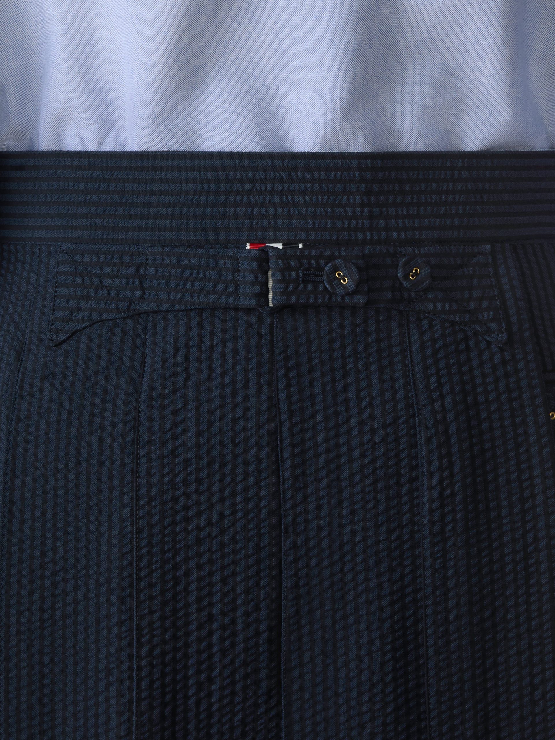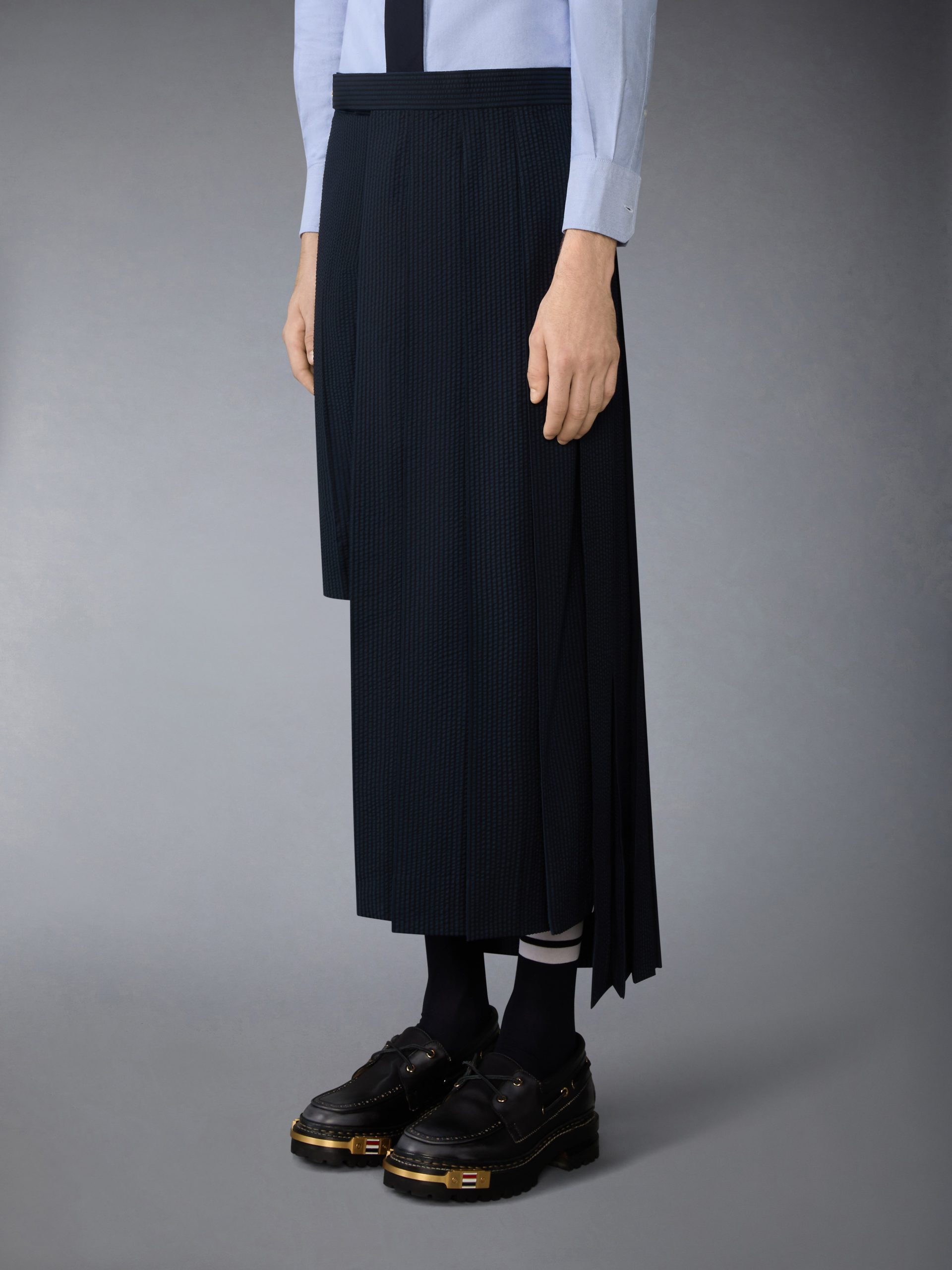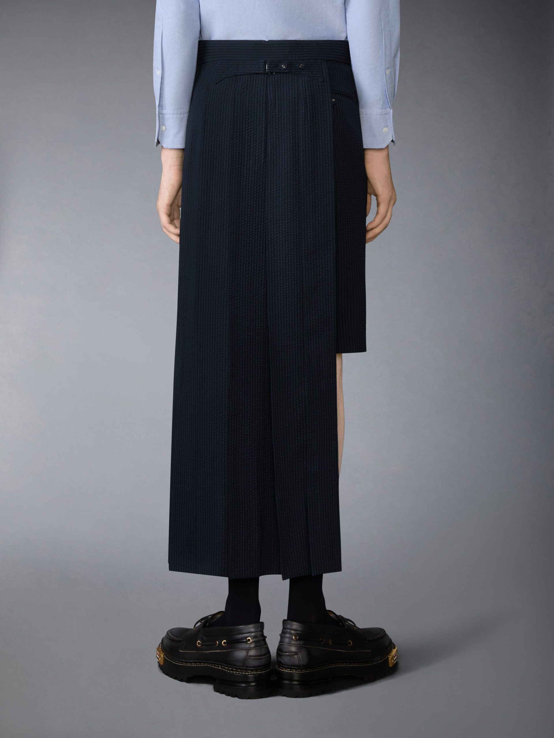 This pleated overskirt channels Thom Browne’s structured vocabulary through the light. textural lens of wool seersucker. Cut in extra-fine yarns with a signature crinkled surface. the fabric delivers breathability without compromising form. Designed to be worn over trousers or shorts. it’s easy to add or remove. offering styling flexibility across looks.