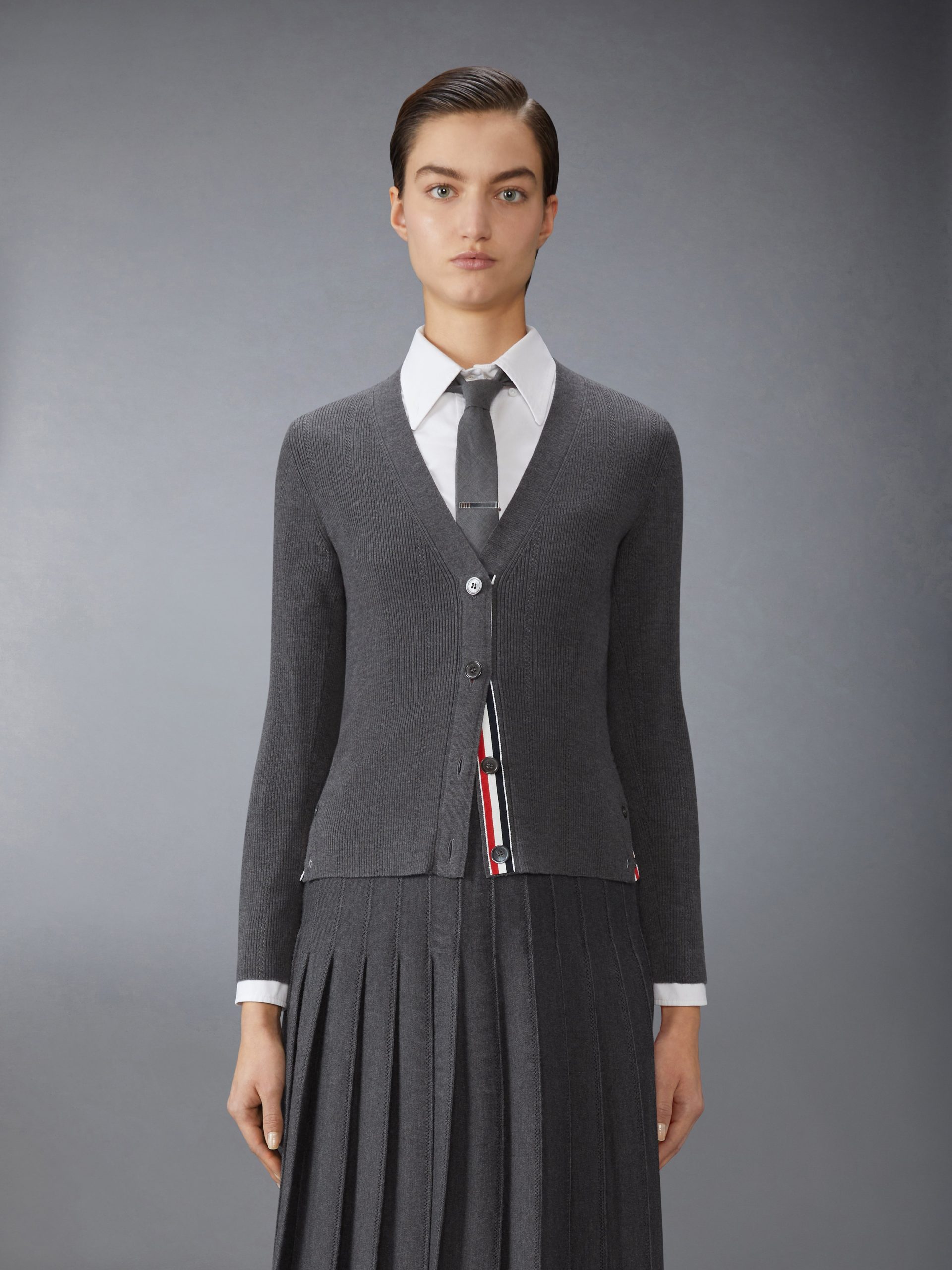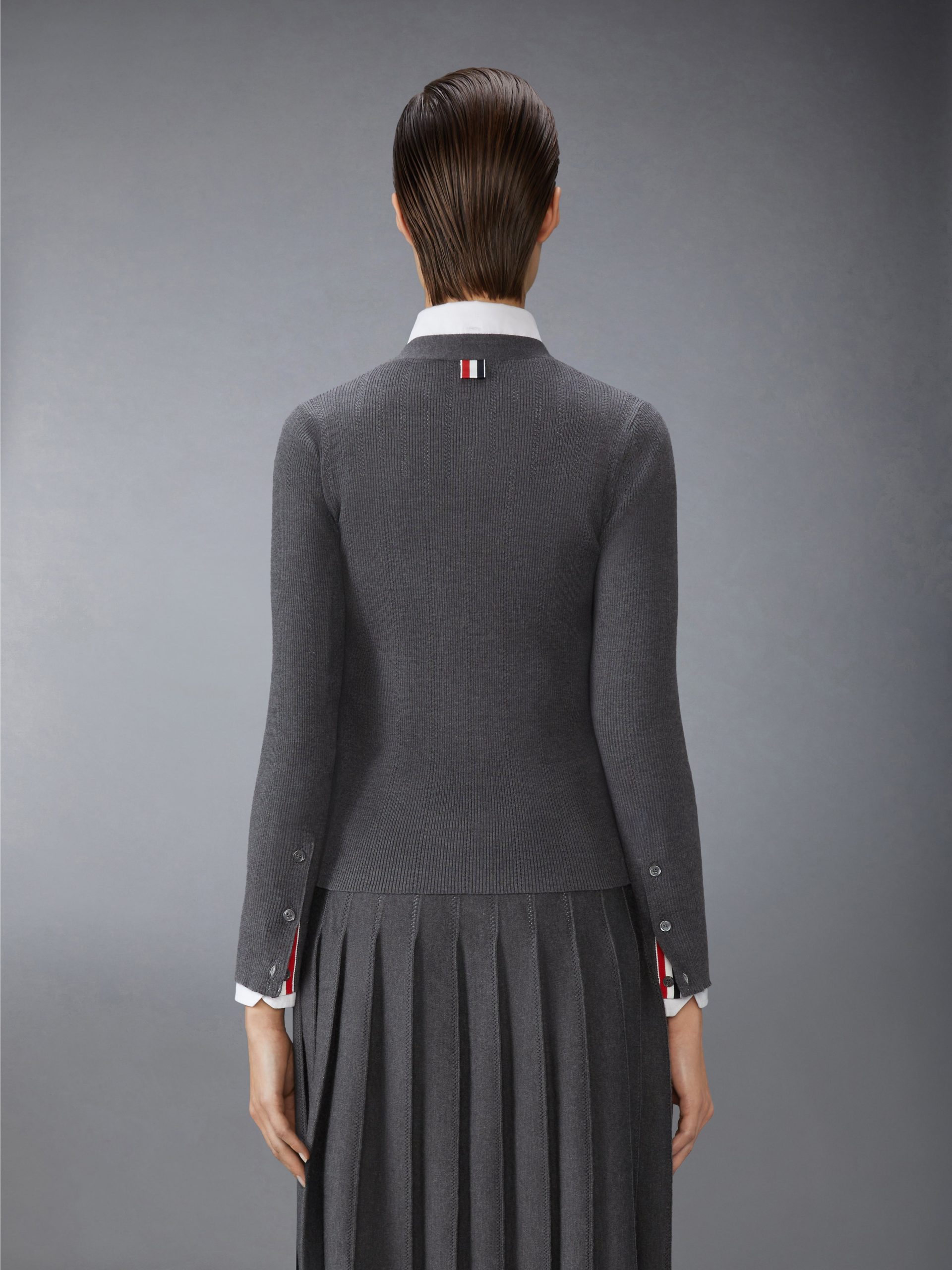 A Thom Browne classic crafted from luxurious wool-silk fabric for the perfect balance of warmth and breathability. Designed for transitional dressing. it’s both practical and sophisticated. Pair it with our Wool Silk Pointelle Stitch Pleated Skirt.